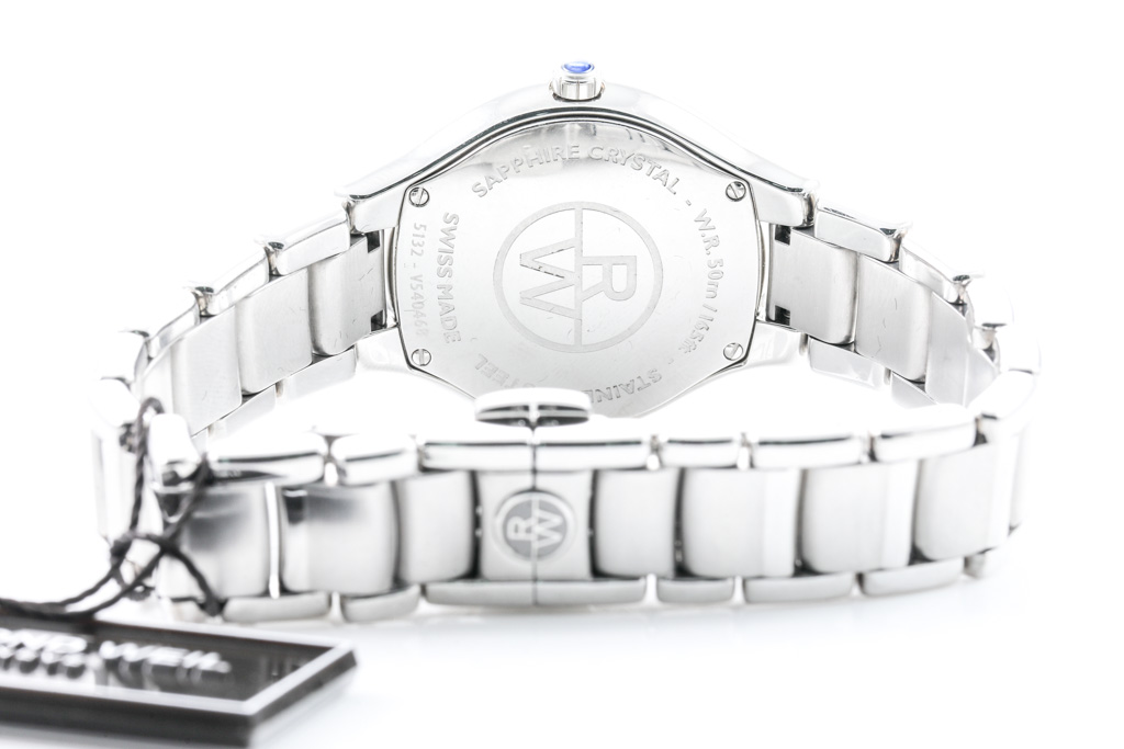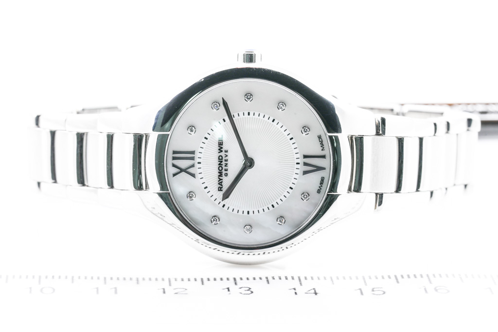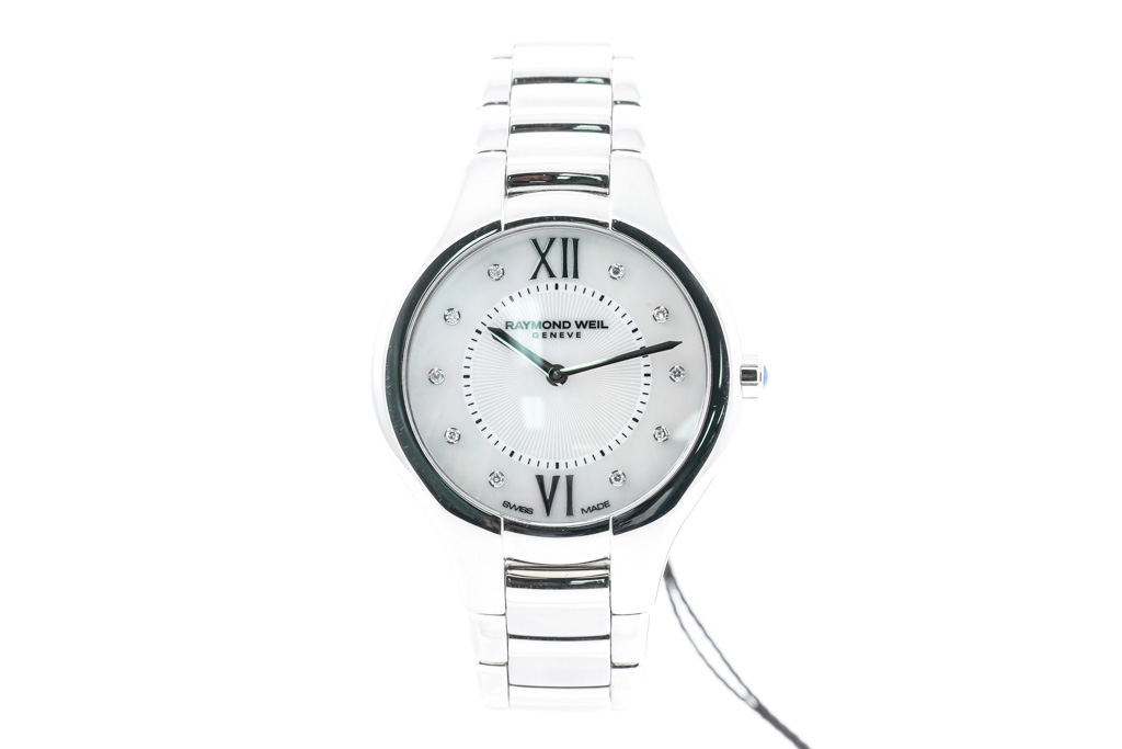 Raymond Weil Noemia stainless steel quartz ladies watch. Mother of Pearl dial, Diamond indicators, case diameter: 32mm, wrist size: 17cm, Swiss made. Ref# 5132-ST-00985. With Raymond Weil stainless steel bracelet and clasp. With Raymond Weil Guarantee card and Raymond Weil box. 12 month FSA warranty. (As New, Note: minor scratches on case and bracelet due to being display stock)
