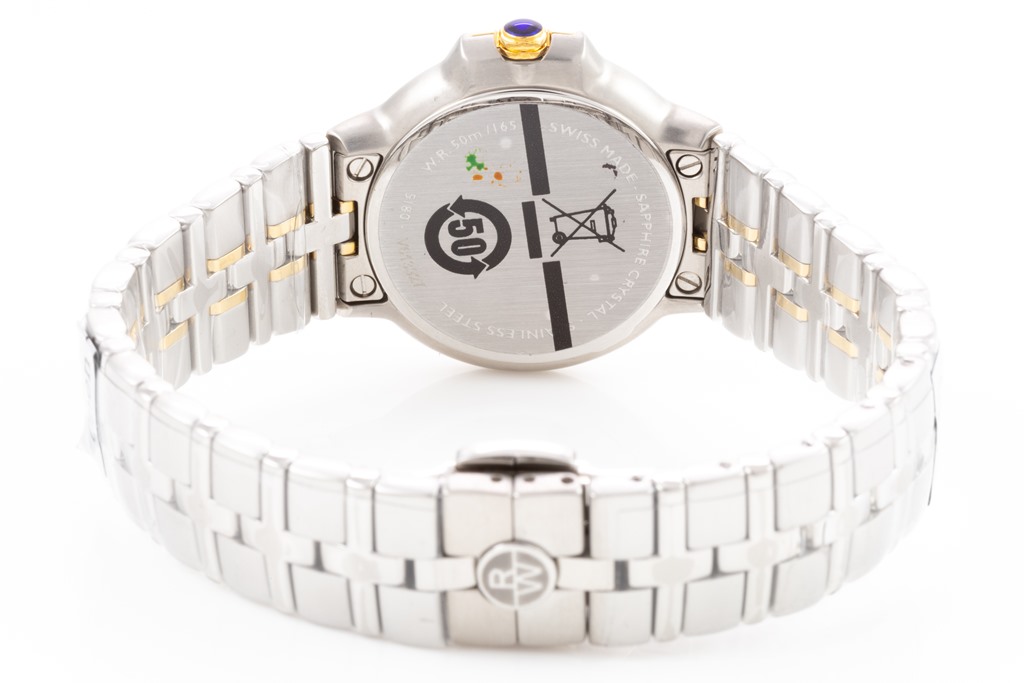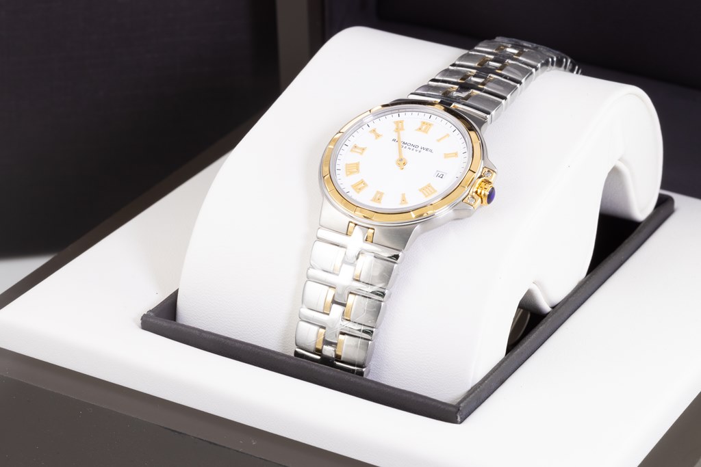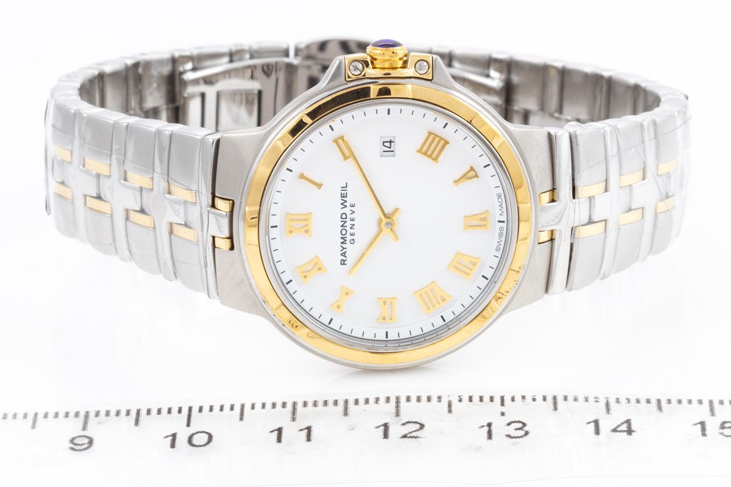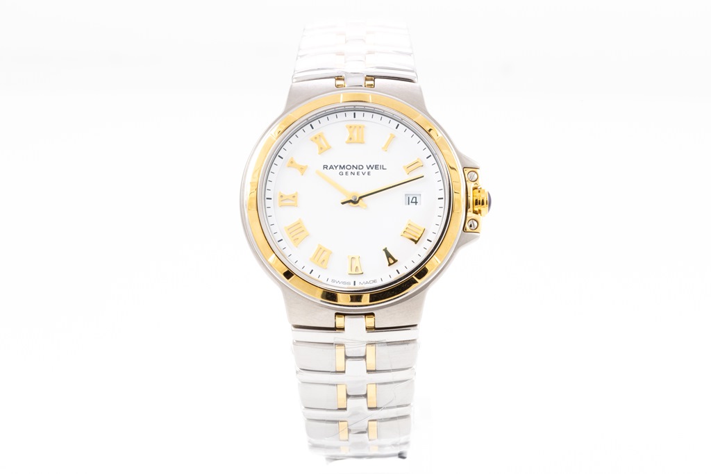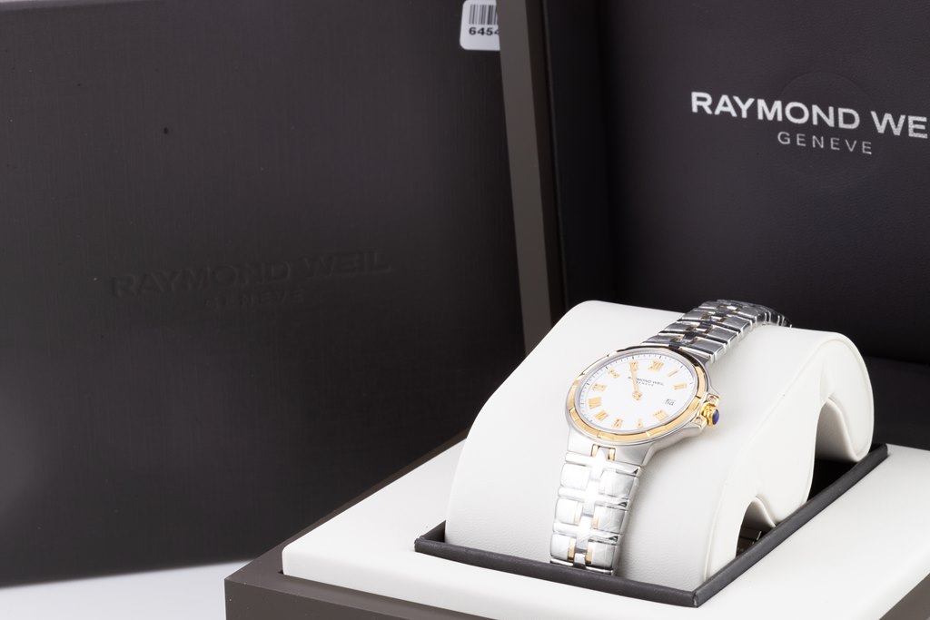 Raymond Weil Parsifal silver tone and gold PVD stainless steel quartz ladies watch. White dial, date, case diameter: 30mm, wrist size: 16cm, Swiss made. Ref# 5180-STP-00308. With Raymond Weil two tone bracelet and clasp. Note: minor scratches due to being display stock. With Raymond Weil damaged box. 12 month FSA warranty. (As New, in original wrapping)