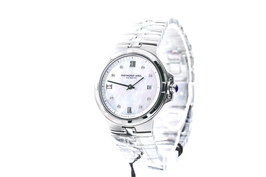 Raymond Weil Parsifal stainless steel quartz ladies watch, Mother of Pearl dial, date, case diameter 30mm, wrist size 16cm, Diamond indicators, Swiss made. Ref #5180-ST-00995. With Raymond Weil bracelet and clasp. With Raymond Weil Guarantee Card and Raymond Weil box. 12 month FSA warranty. (As New, Note: minor scratches due to being display stock)