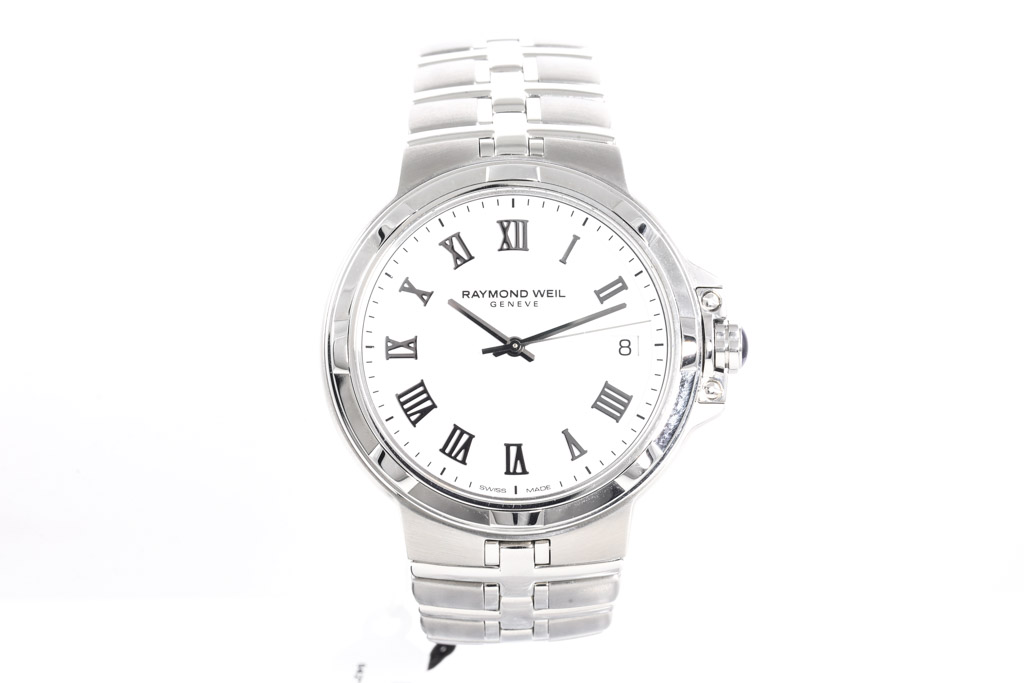 Raymond Weil Parsifal stainless steel quartz mens watch. White dial, date, case diameter: 41mm, wrist size: 19.5cm, Swiss made. Ref# 5580-ST-00300. With Raymond Weil stainless steel bracelet and clasp. With Raymond Weil International Guarantee booklet - the booklet is not stamped so Raymond Weil warranty does not apply. With Raymond Weil box. 3 month FSA warranty. (As New, Note: minor scratches on case and bracelet due to being display stock)