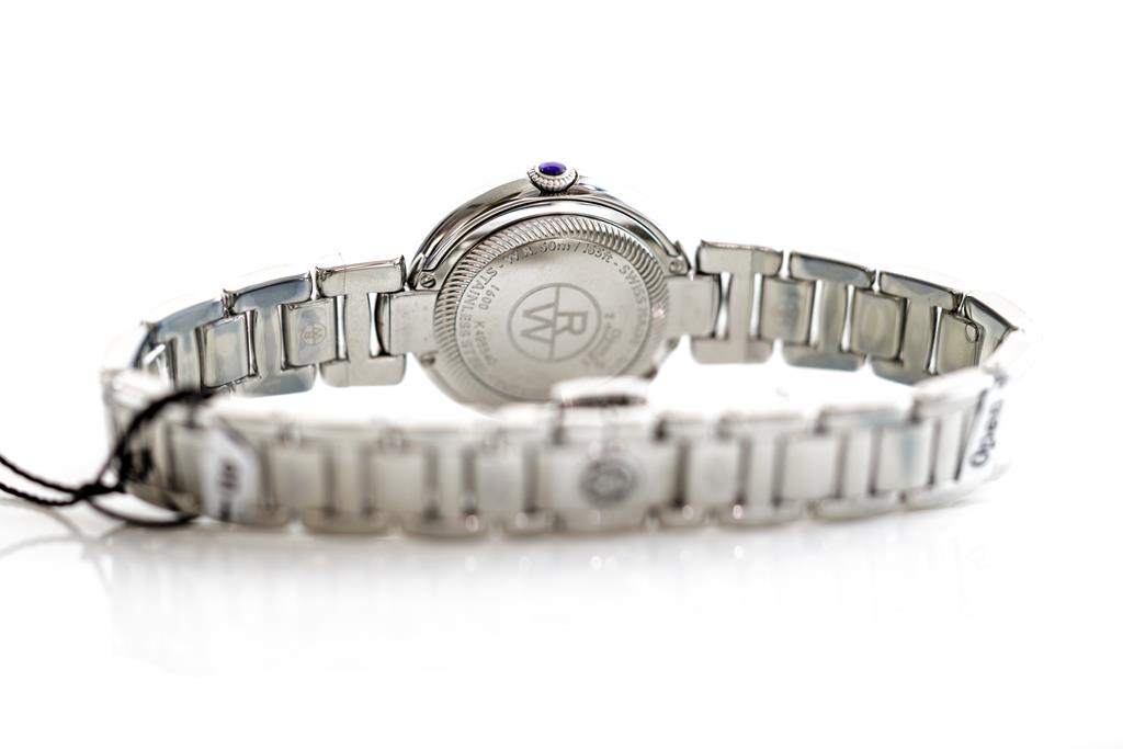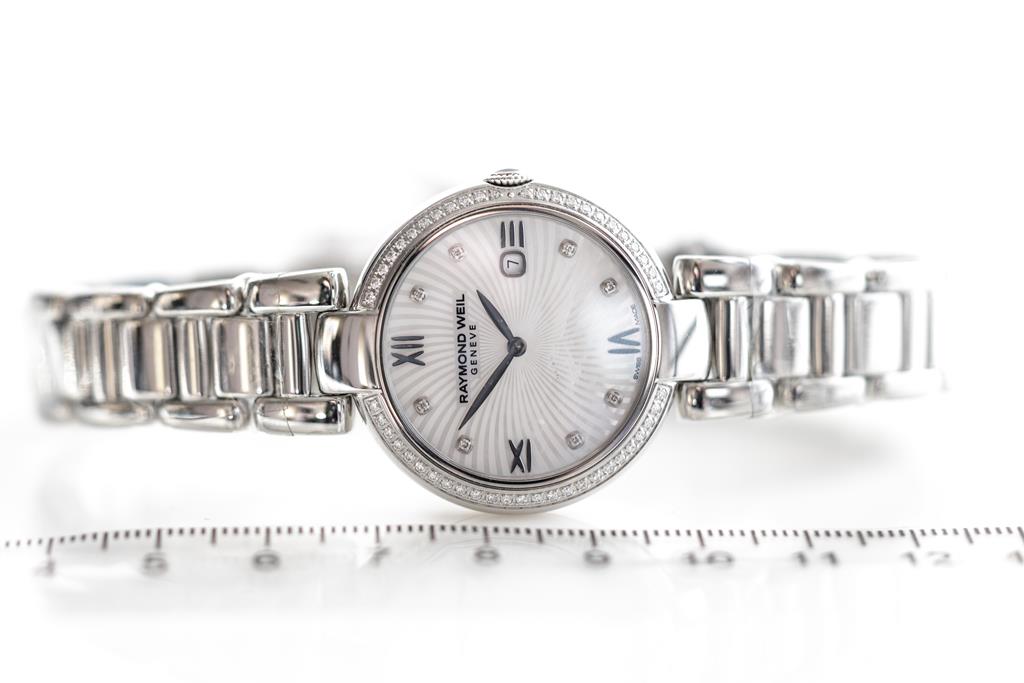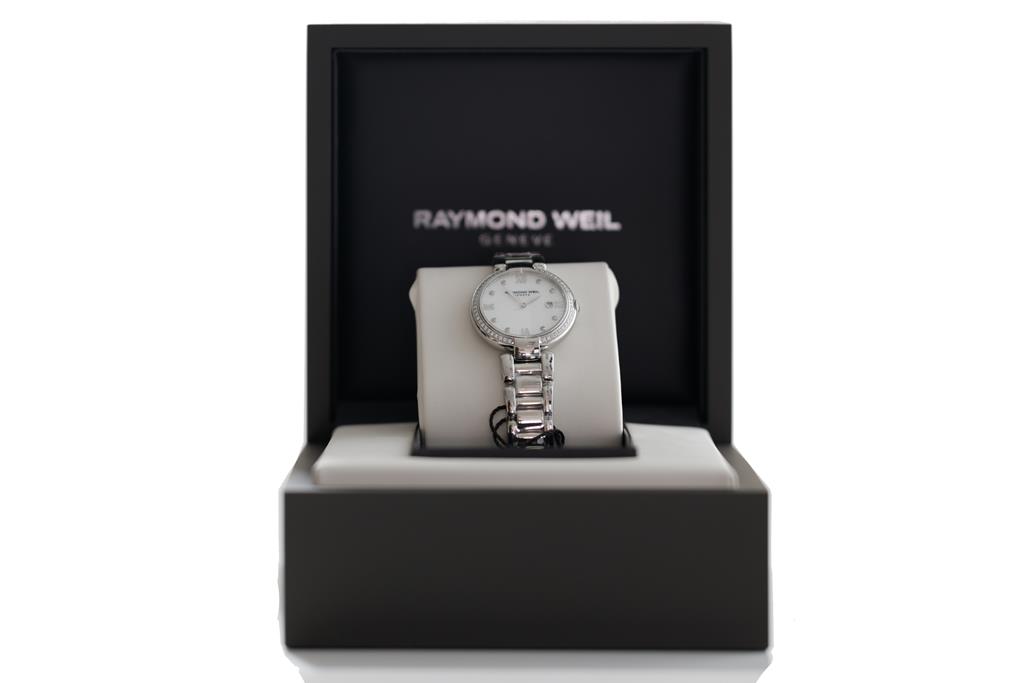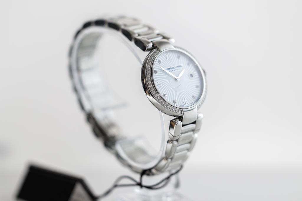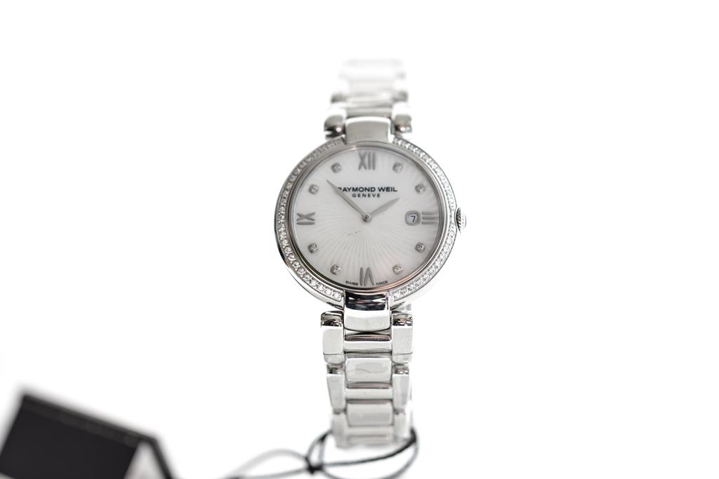 Raymond Weil Shine stainless steel quartz ladies watch. Mother of Pearl dial, date, Diamond indicators & Diamond set bezel, case diameter: 32mm, wrist size: 19cm, Swiss made. Ref# 1600-STS-00995. With Raymond Weil stainless steel bracelet and clasp. With Raymond Weil Guarantee card, spare black leather strap and Raymond Weil damaged box. 12 month FSA warranty. (New, in original wrapping)