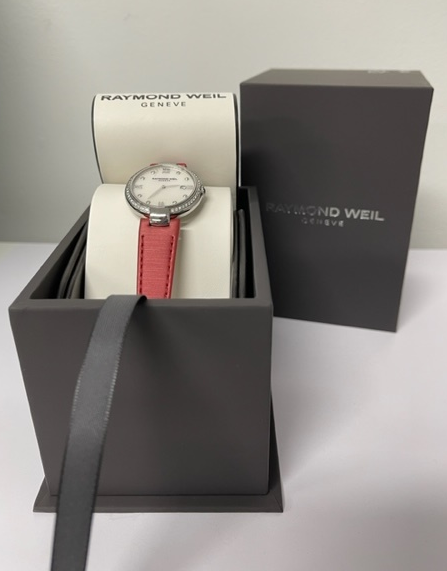 Raymond Weil Shine stainless steel quartz ladies watch. Mother of Pearl dial, date, Diamond indicators & Diamond set bezel, case diameter: 32mm, strap length: 17.5cm, Swiss made. Ref# 1600-STS-00995. With Raymond Weil red leather strap and buckle. With Raymond Weil Guarantee card and Raymond Weil box. 12 month FSA warranty. (As New, Note: minor scratches on case and light wear on strap due to being display stock)