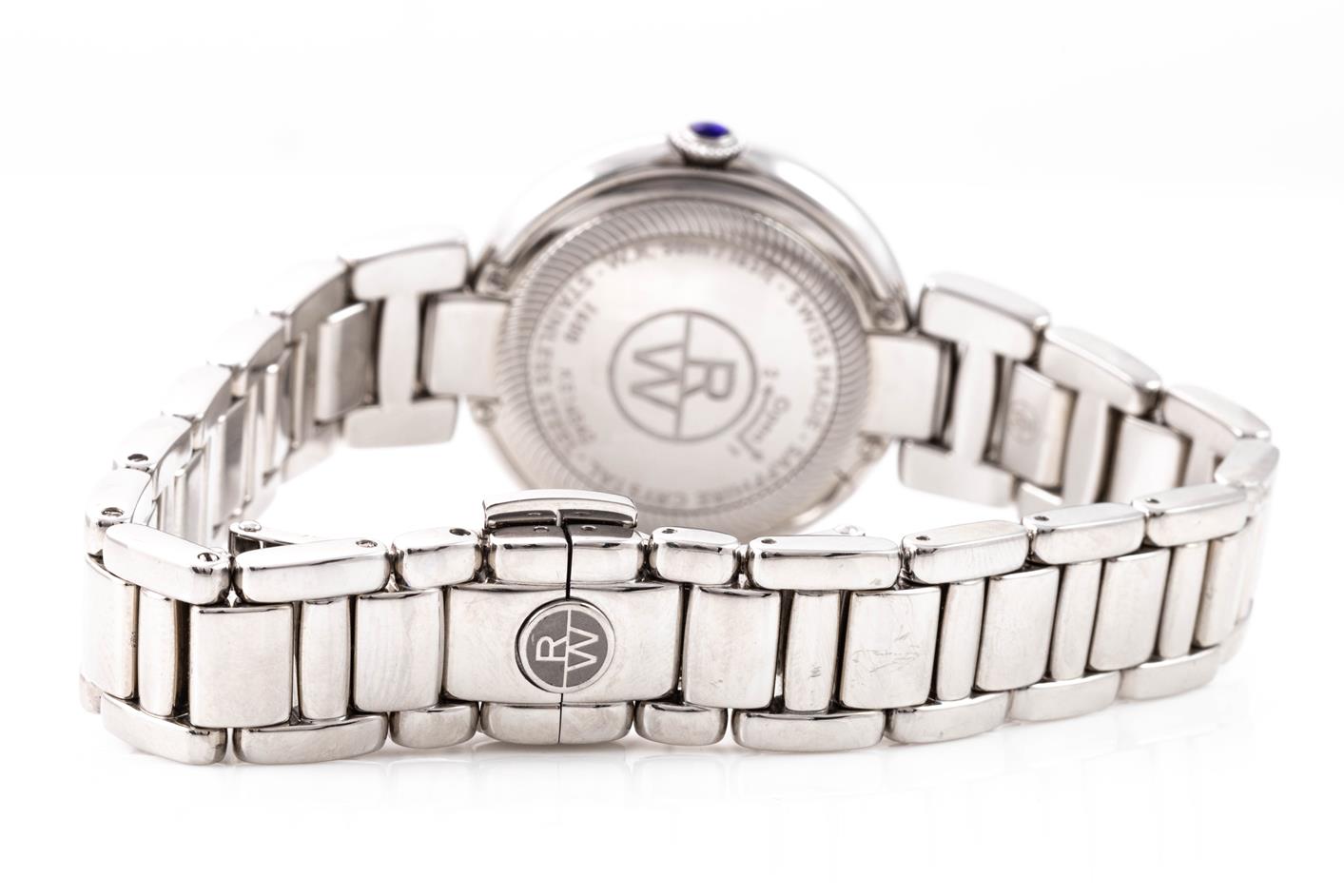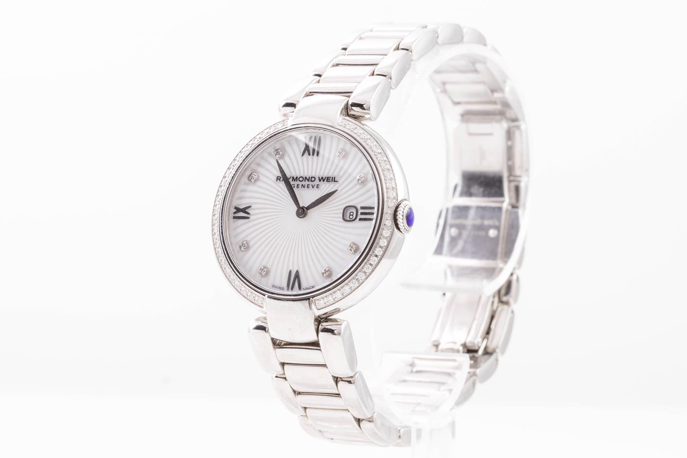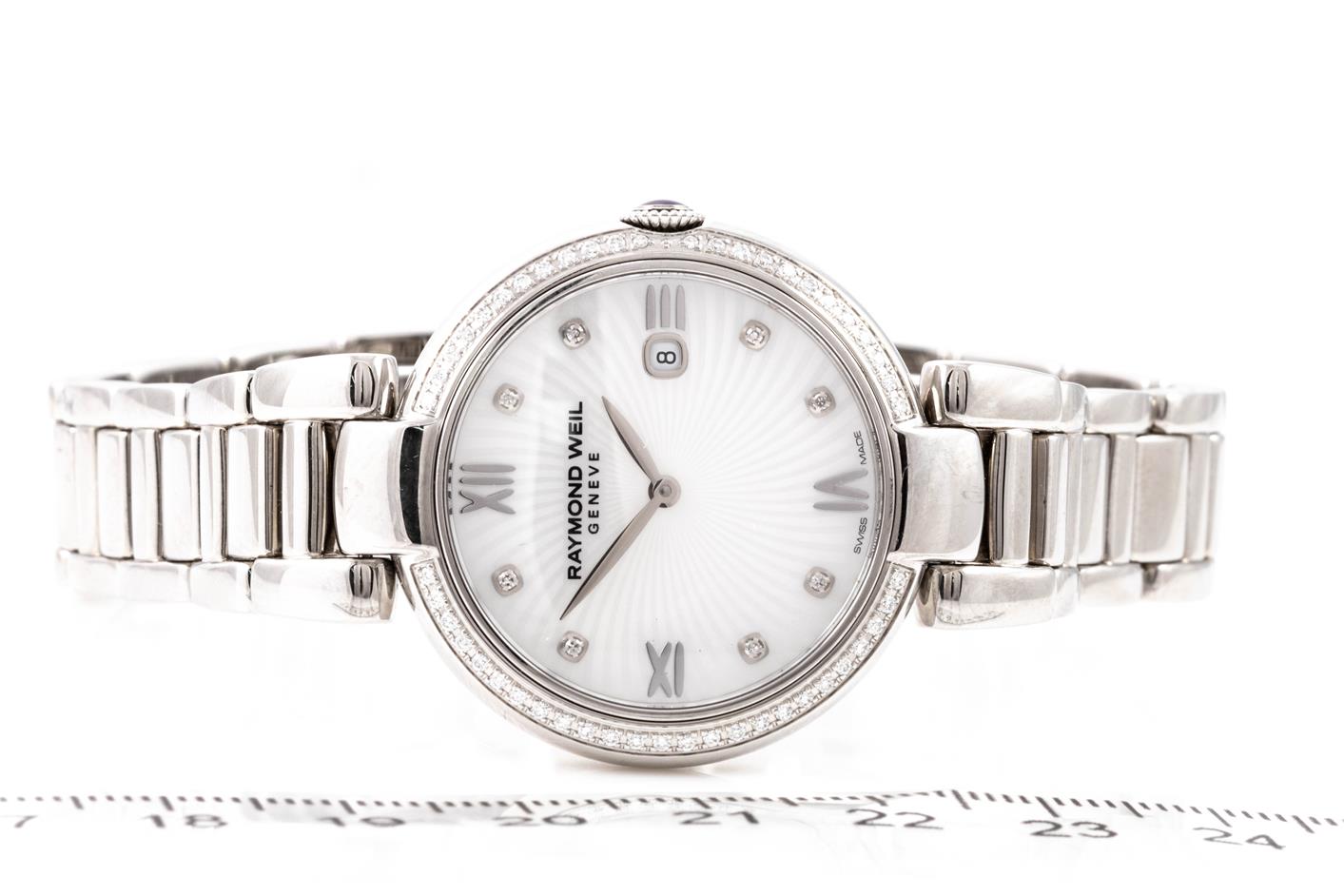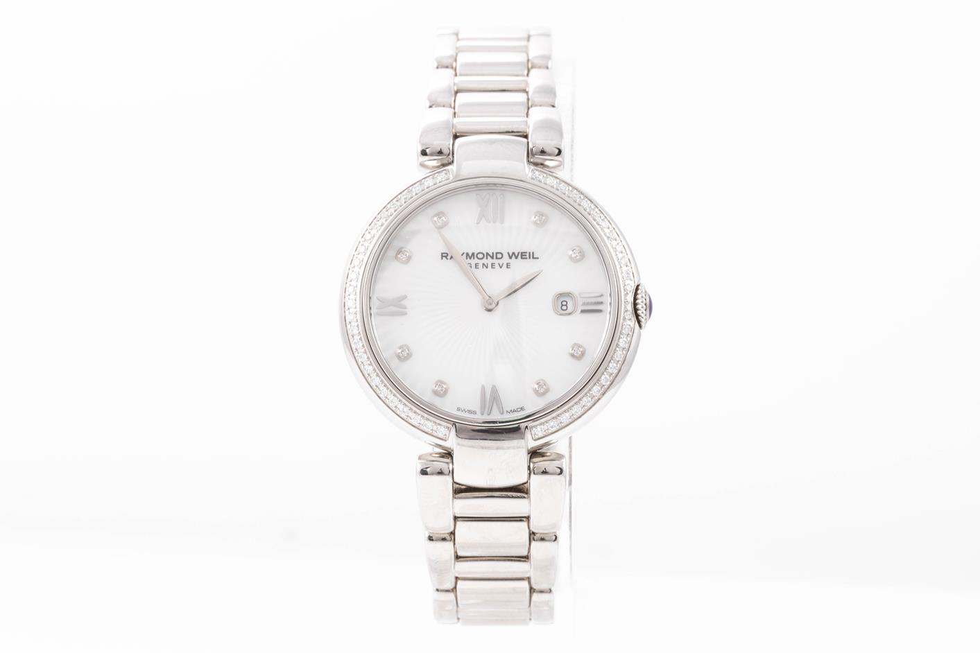 Raymond Weil Shine stainless steel quartz ladies watch. Mother of Pearl dial, date, Diamond indicators & Diamond set bezel, case diameter: 32mm, wrist size: 19cm, Swiss made. Ref# 1600-STS-00995. With Raymond Weil stainless steel bracelet and clasp. With Raymond Weil Guarantee card and Raymond Weil box. 12 month FSA warranty. (As New, Note: scratches on case and bracelet due to being display stock)