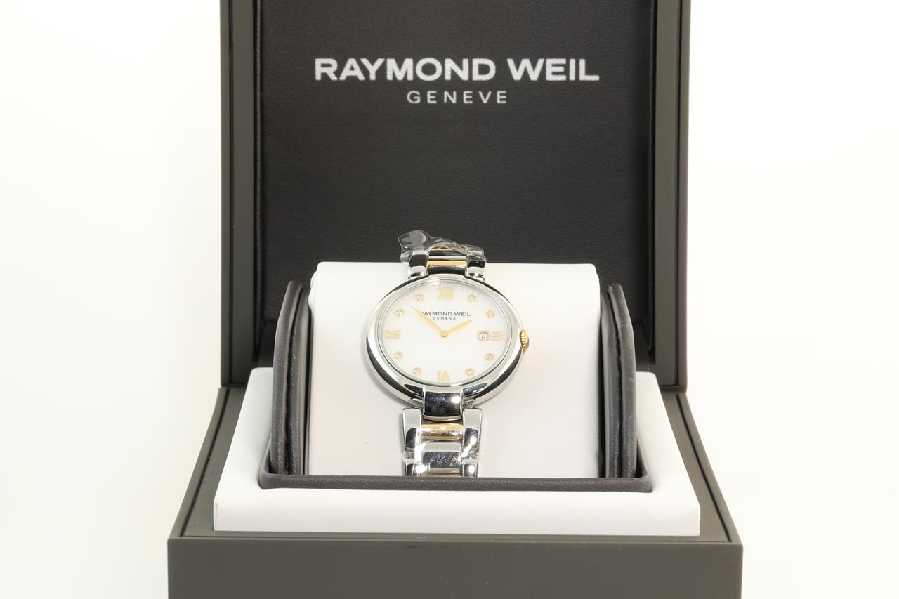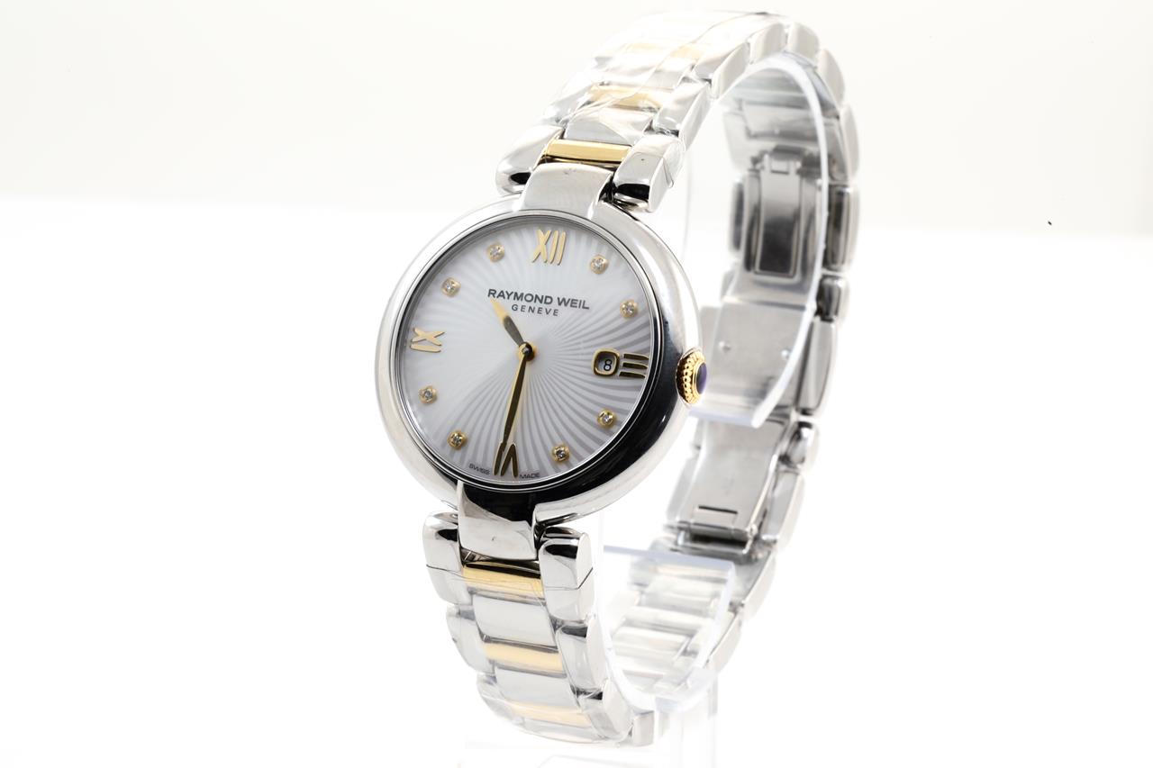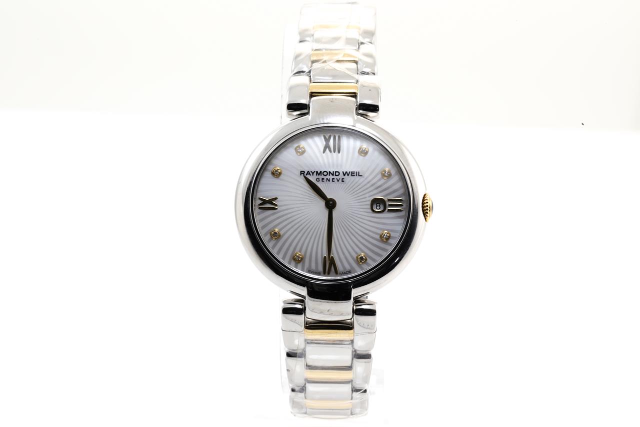 Raymond Weil Shine yellow gold PVD and stainless steel quartz ladies watch. Mother of Pearl dial, date, case diameter: 32mm, Swiss made. Ref #1600-STP-00995. With Raymond Weil two-tone bracelet and clasp. With Raymond Weil spare black leather strap and clasp inside box. 12 month FSA warranty. (New, in original wrapping)