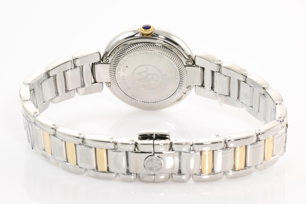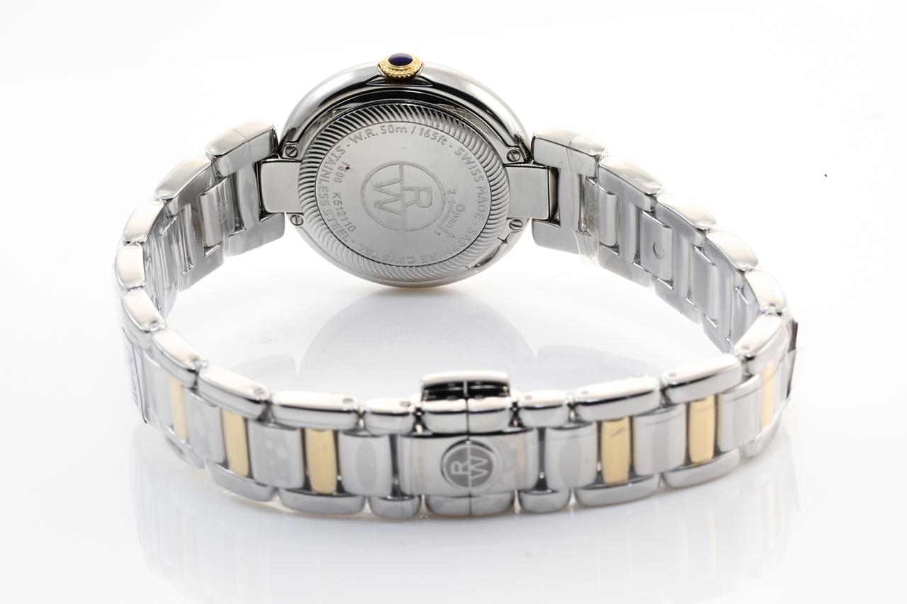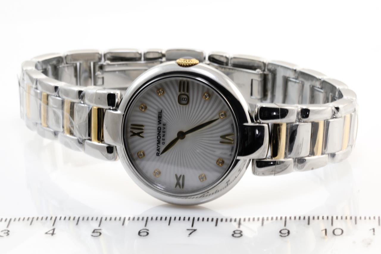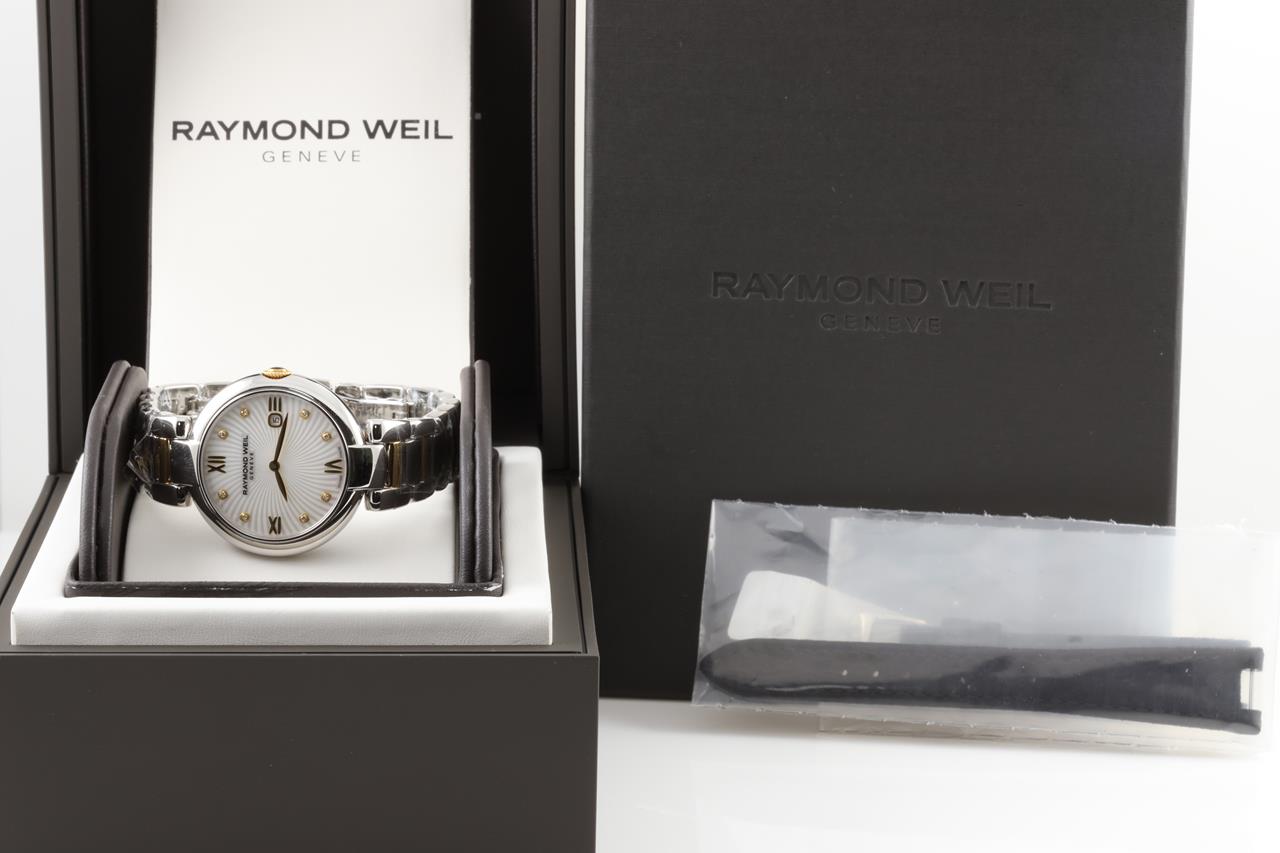 Raymond Weil Shine yellow gold PVD and stainless steel quartz ladies watch. Mother of Pearl dial, date, case diameter: 32mm, Swiss made. Ref #1600-STP-00995. With Raymond Weil two-tone bracelet and clasp. With Raymond Weil spare black leather strap and clasp inside box. 12 month FSA warranty. (New, in original wrapping)