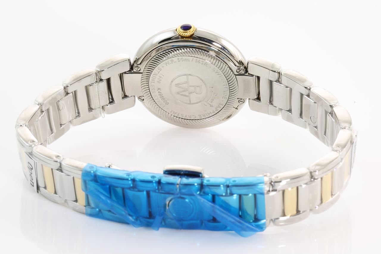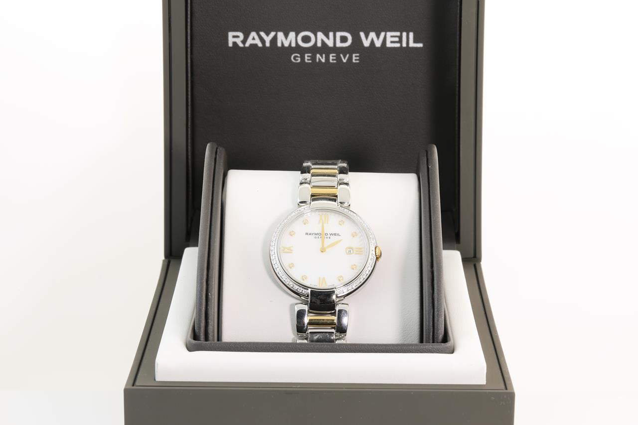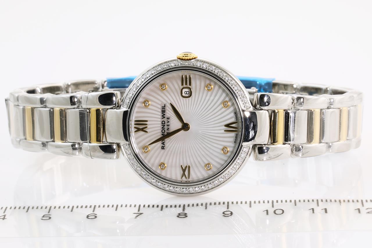 Raymond Weil Shine stainless steel quartz ladies watch. Mother of Pearl, Diamond indicators, Diamond set bezel, date, case diameter: 32mm, Swiss made. Ref #1600-STS-00995. With Raymond Weil stainless steel bracelet and clasp. With Raymond Weil spare black leather strap and clasp inside box. 12 month FSA warranty. (New, in original wrapping)