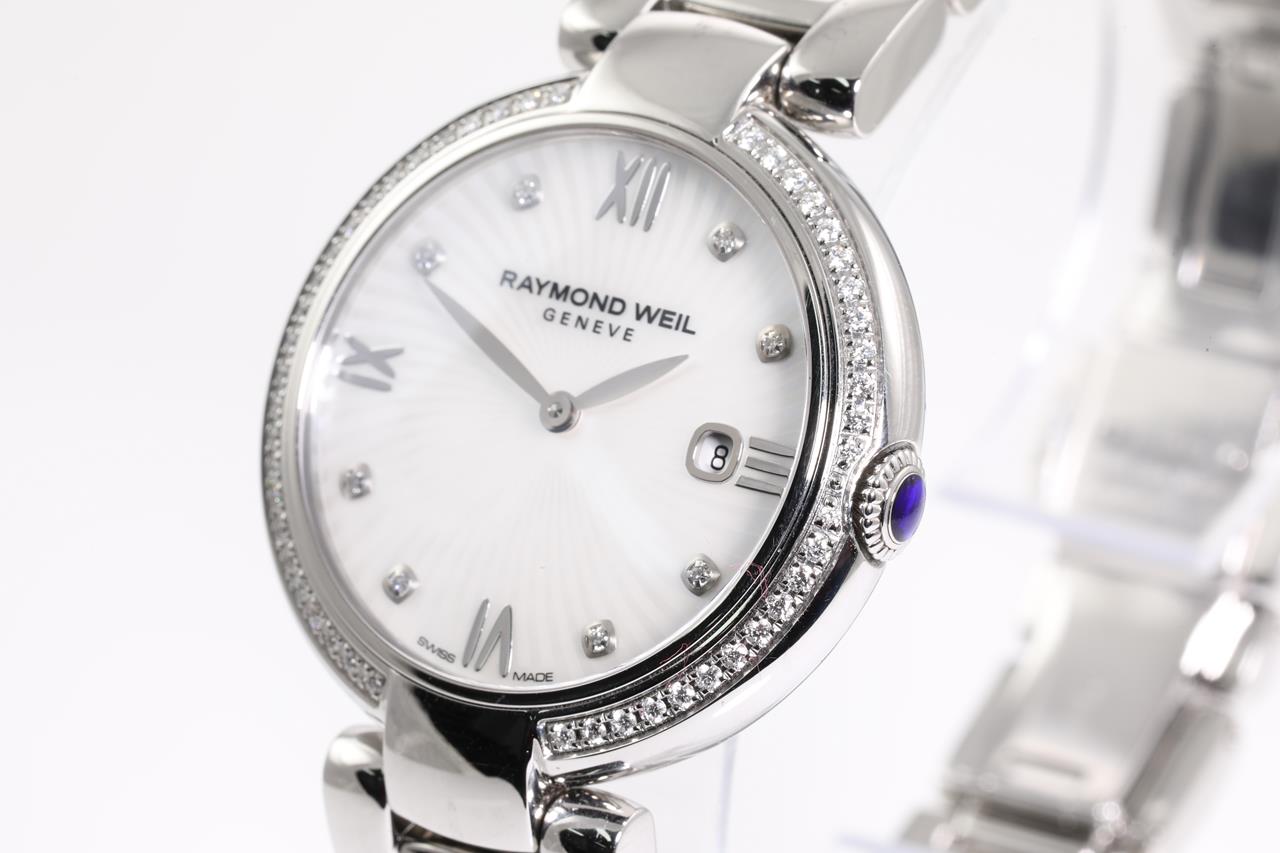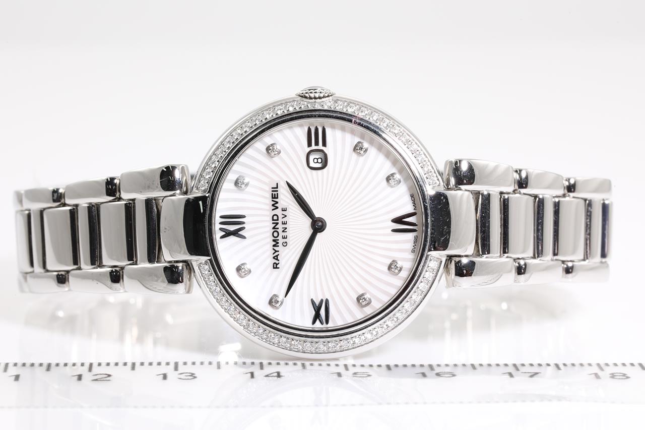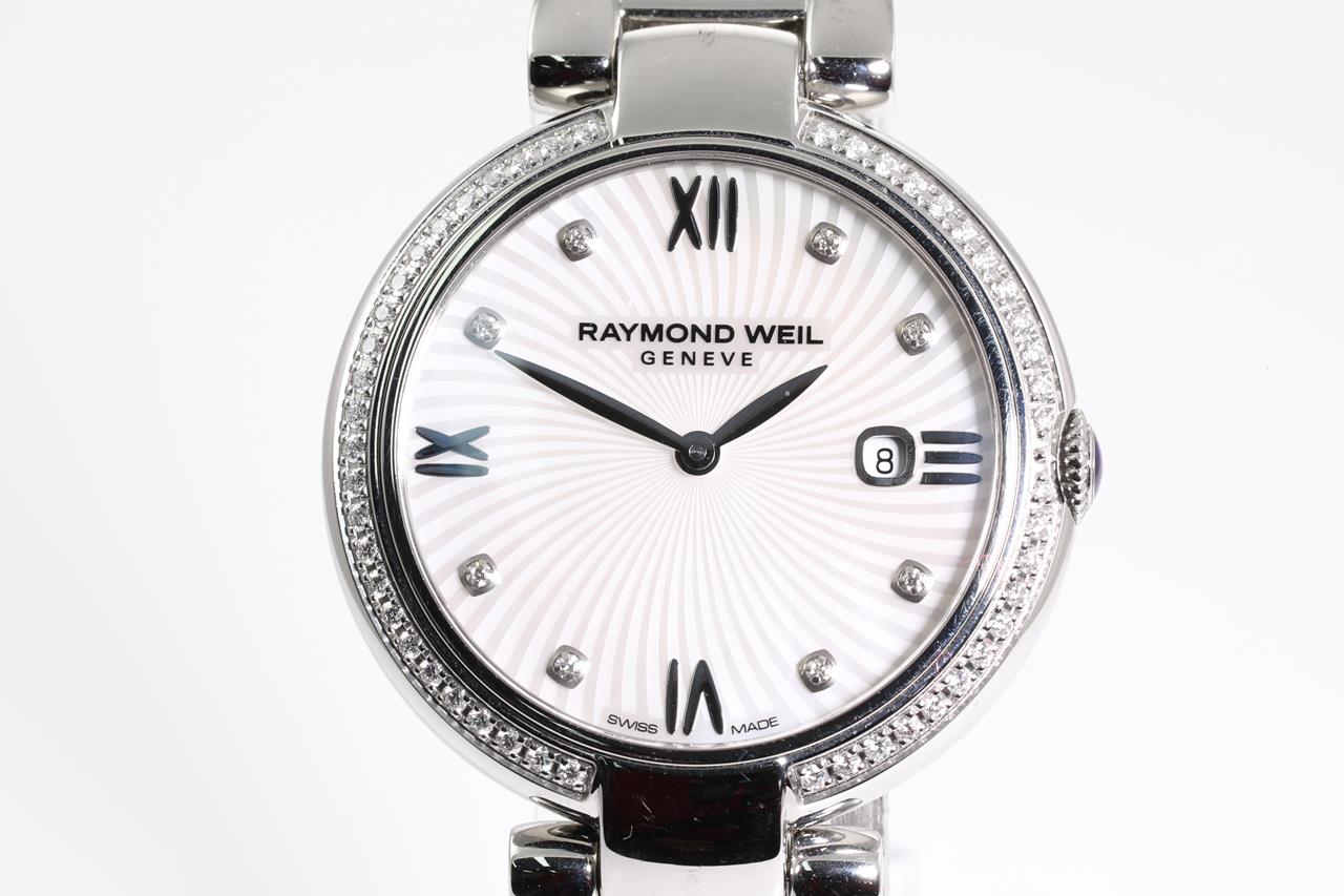 Raymond Weil Shine stainless steel quartz ladies watch. Mother of Pearl dial, Diamond set bezel, Diamond indicators, case size: 32mm, wrist size: 19cm, Swiss made. Ref #1600S-TS0-0995. With Raymond Weil stainless steel bracelet & clasp. With Raymond Weil spare black leather strap, Certificate of Authenticity card and Raymond Weil Box. 12 month FSA warranty. (New)