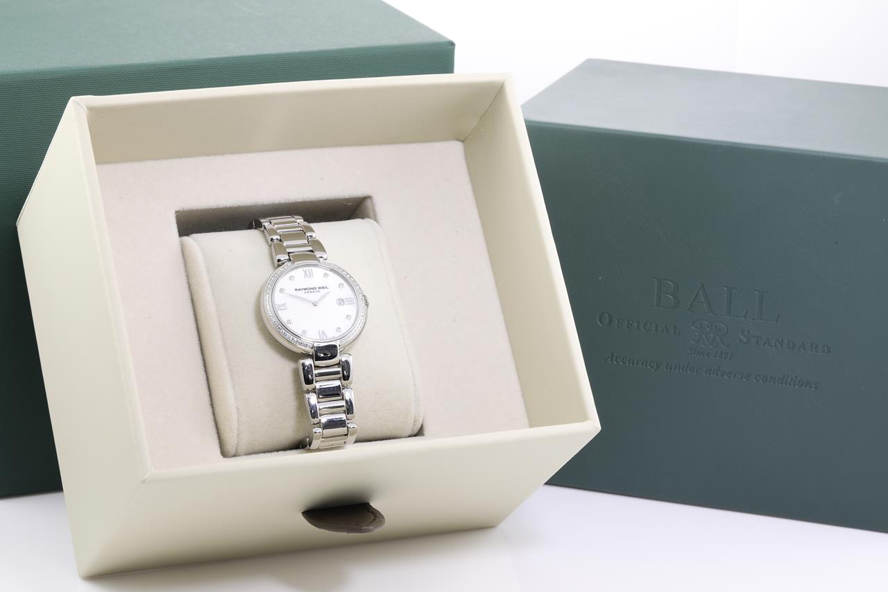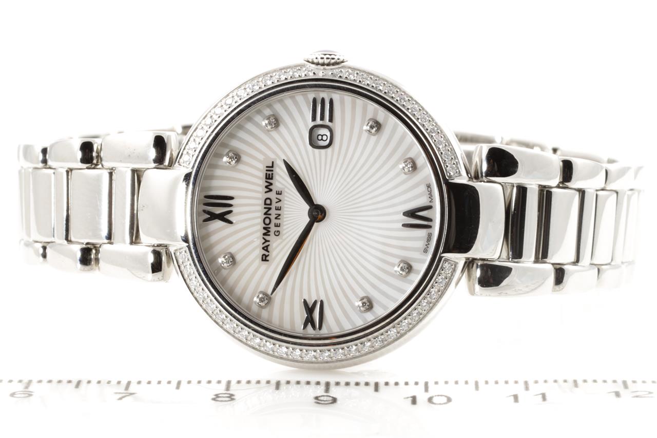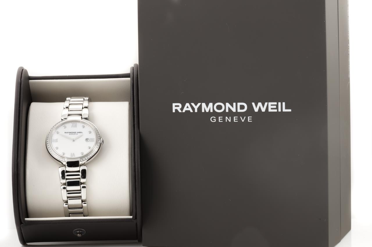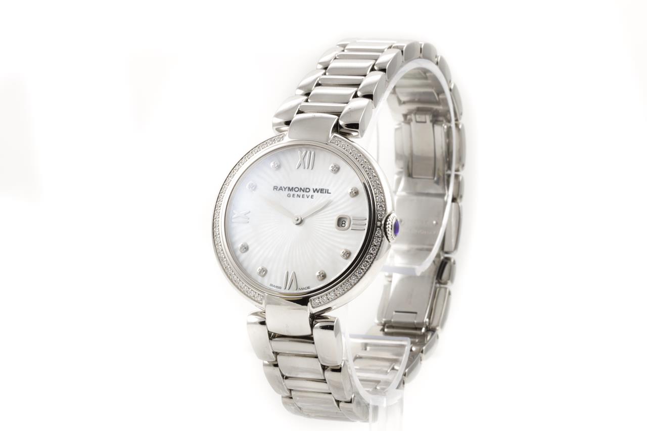 Raymond Weil Shine stainless steel quartz ladies watch. Mother of Pearl dial, Diamond set bezel, Diamond indicators, case size: 32mm, wrist size: 19cm, Swiss made. Ref #1600S-TS0-0995. With Raymond Weil stainless steel bracelet & clasp. With Raymond Weil spare black leather strap, Certificate of Authenticity card and Raymond Weil Box. 12 month FSA warranty. (New)