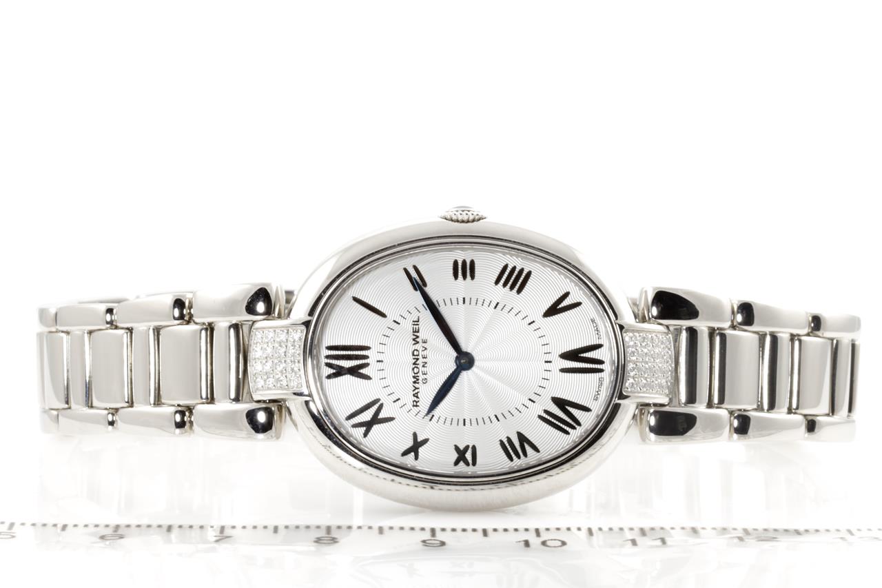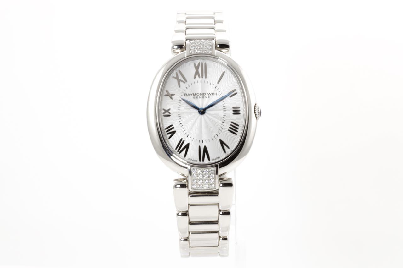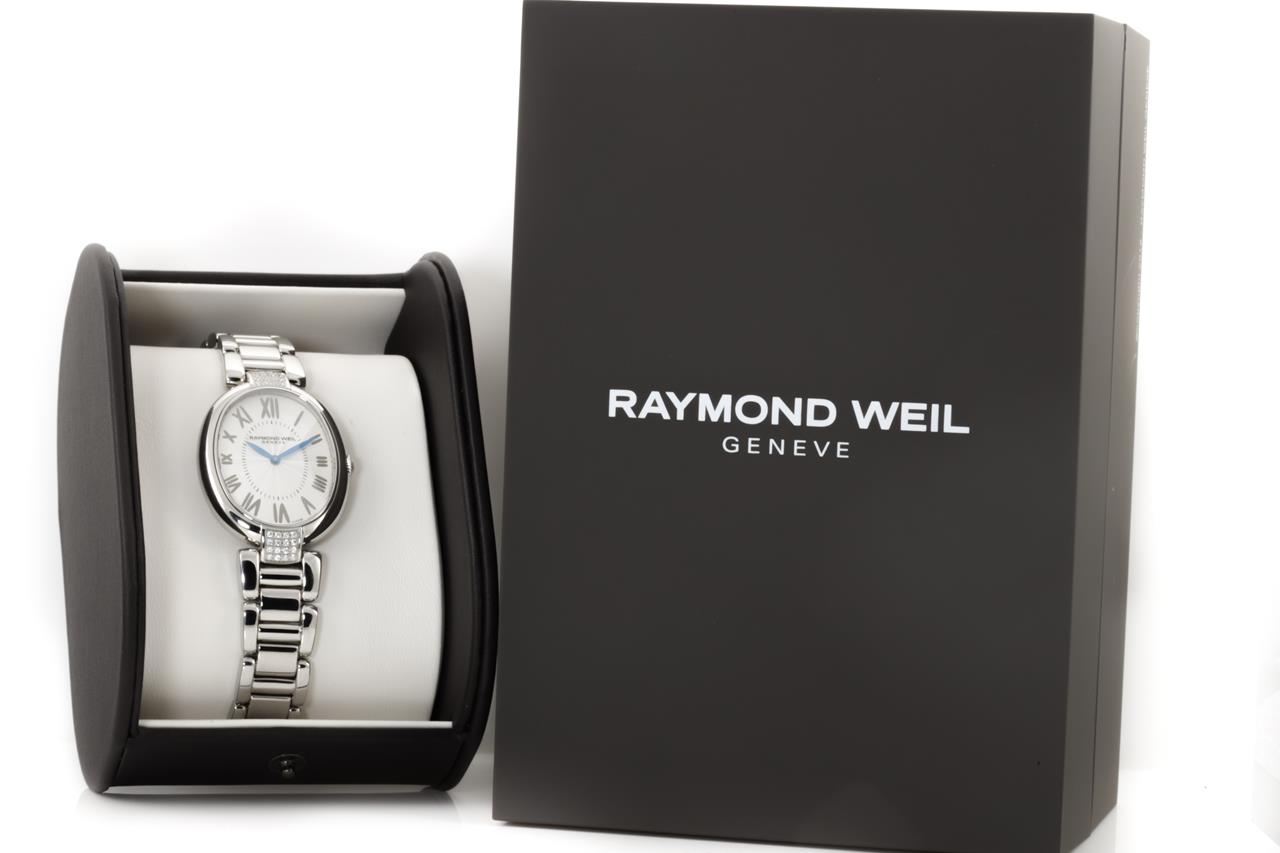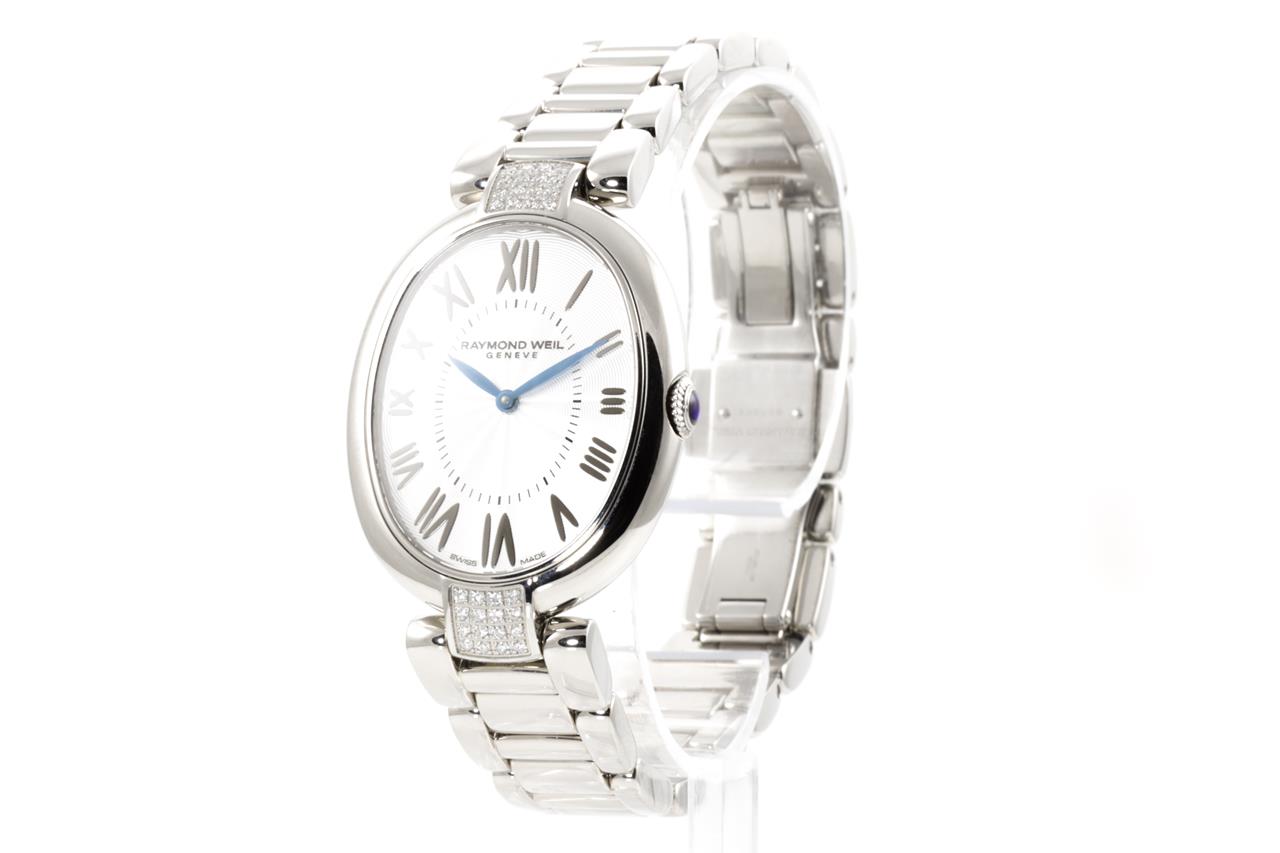 Raymond Weil Shine stainless steel quartz ladies watch. Silver dial, Diamond set lugs, case size: 36mm x 29mm, wrist size: 18.5cm, Swiss made. Ref #1700-STS-00659. With Raymond Weil stainless steel bracelet & clasp. With Raymond Weil spare black leather strap, Certificate of Authenticity card and Raymond Weil Box. 12 month FSA warranty. (As New)
