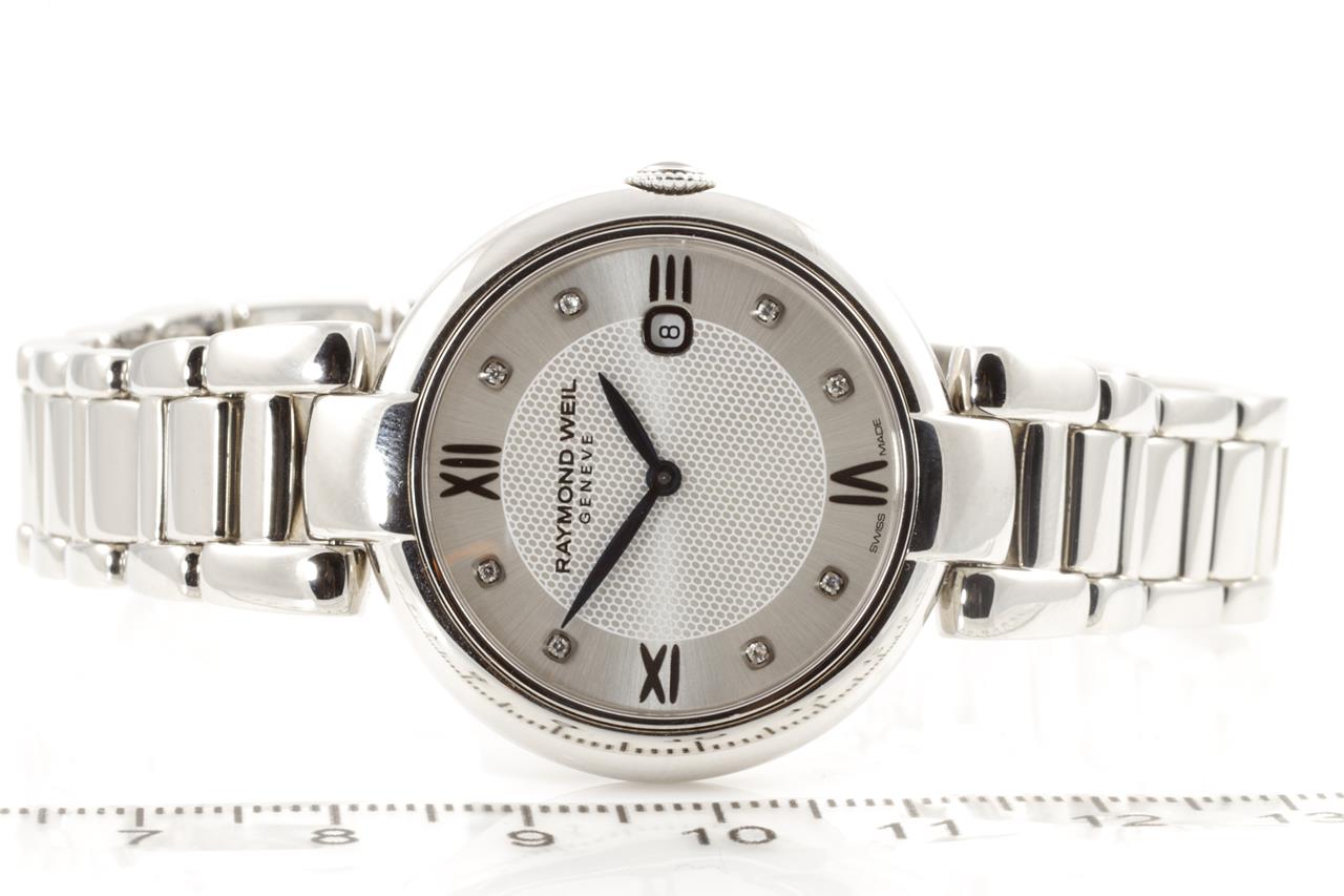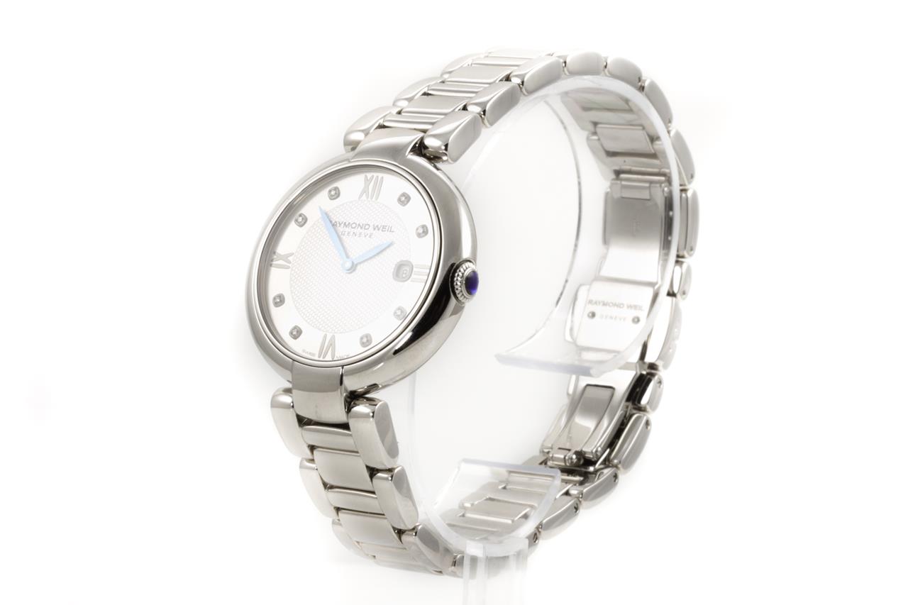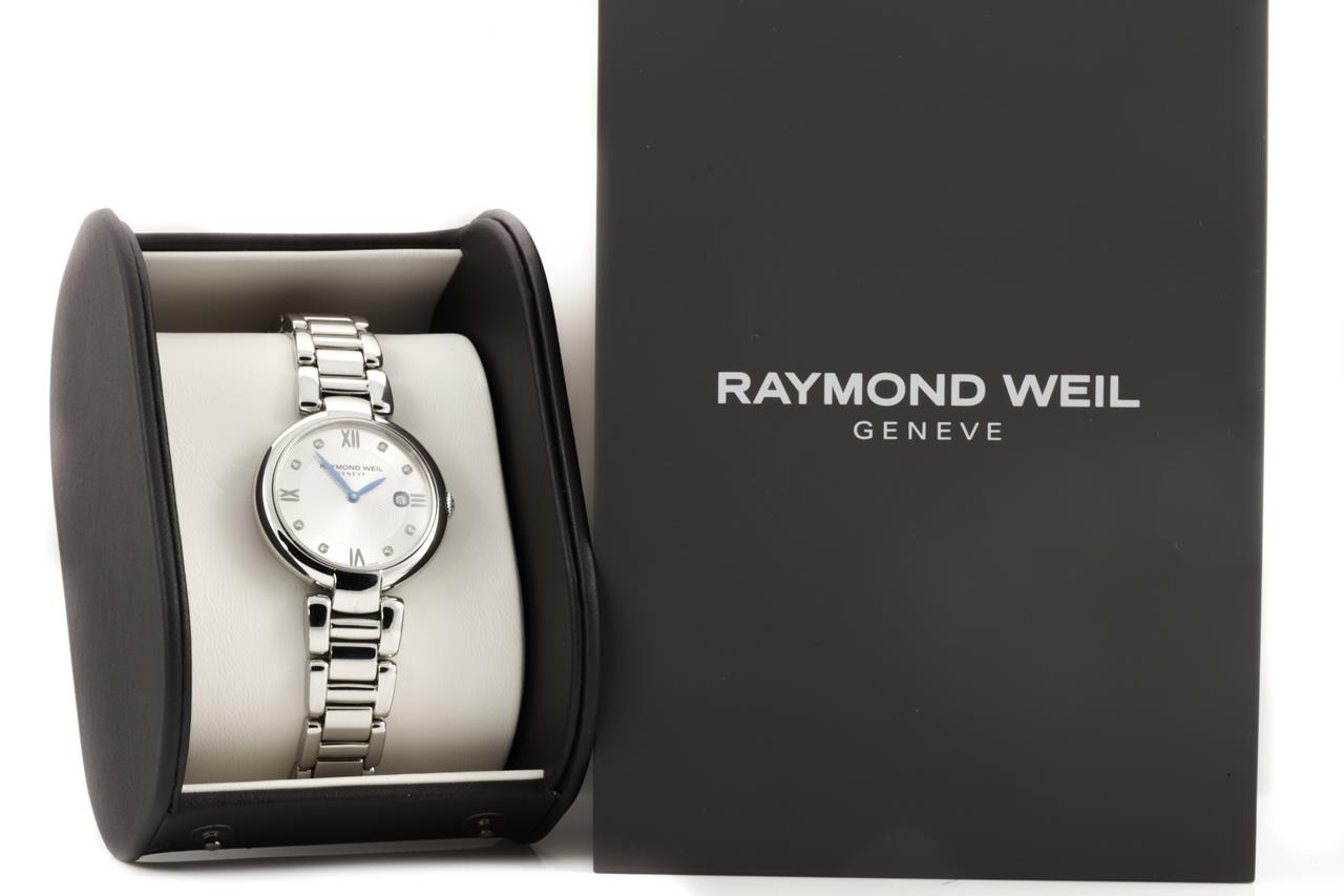 Raymond Weil Shine stainless steel quartz ladies watch. Silver dial, Diamond indicators, case size: 32mm, wrist size: 18.5cm, Swiss made. Ref #1600S-TRE-695. With Raymond Weil stainless steel bracelet & clasp. Note: minor scratches on lugs and bracelet due to being display stock. With Raymond Weil spare worn leather strap, Certificate of Authenticity card and Raymond Weil Box. 12 month FSA warranty. (New)