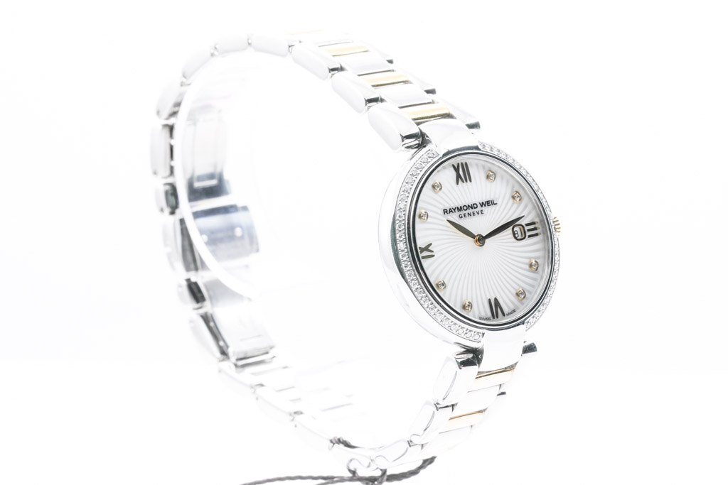 Raymond Weil Shine stainless steel & yellow gold plated quartz ladies watch. Mother of Pearl dial, Diamond indicators, date, case diameter: 32mm, wrist size: 19cm, Swiss made. Ref# 1600-SPS-00995. With Raymond Weil two tone bracelet and clasp. With Raymond Weil Guarantee Card and Raymond Weil box. 12 month FSA warranty. (As New, Note: minor scratches on case and bracelet due to display stock)
