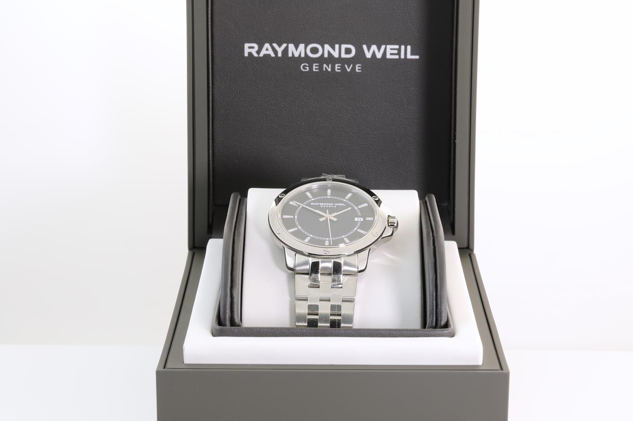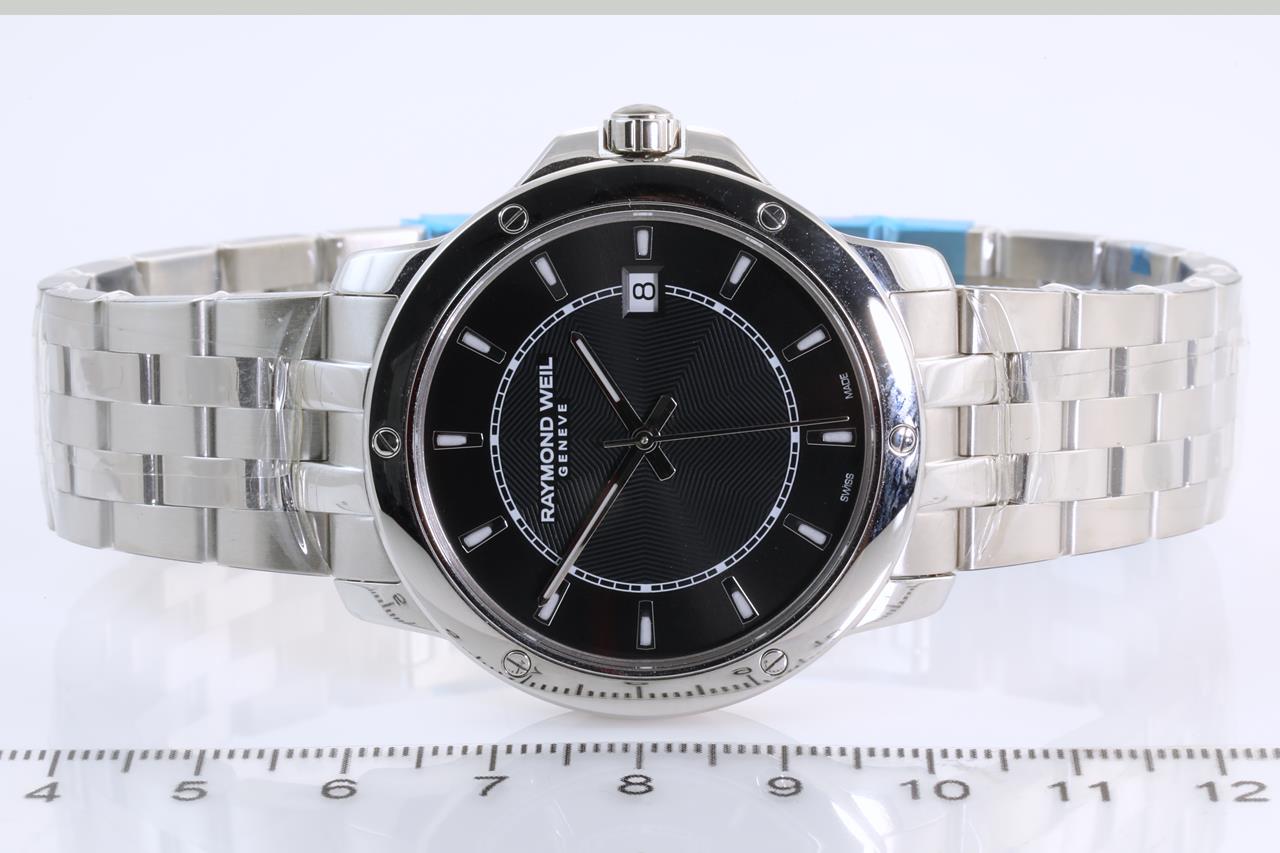 Raymond Weil Tango stainless steel quartz men's watch. Black dial, date, case diameter: 42mm, Swiss made. Ref# 5591-ST-20001. With Raymond Weil stainless steel bracelet and clasp. With Raymond Weil box. 12 month FSA warranty. (New, in original wrapping)