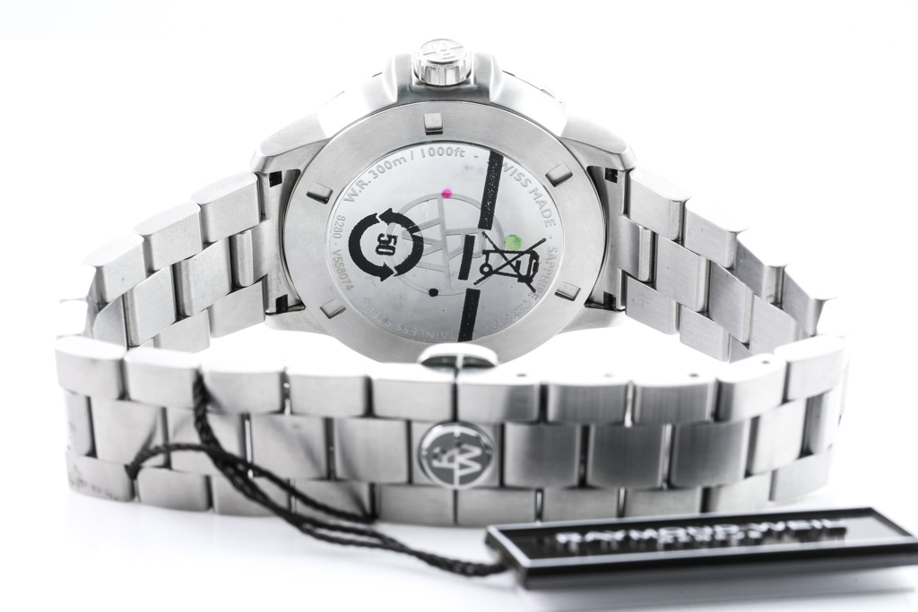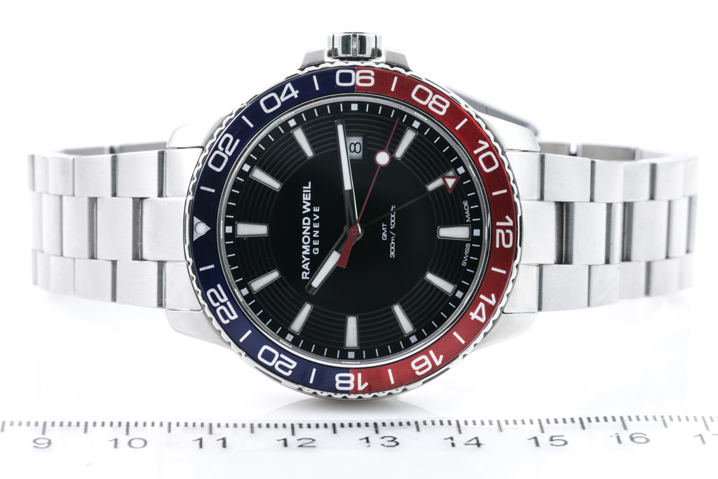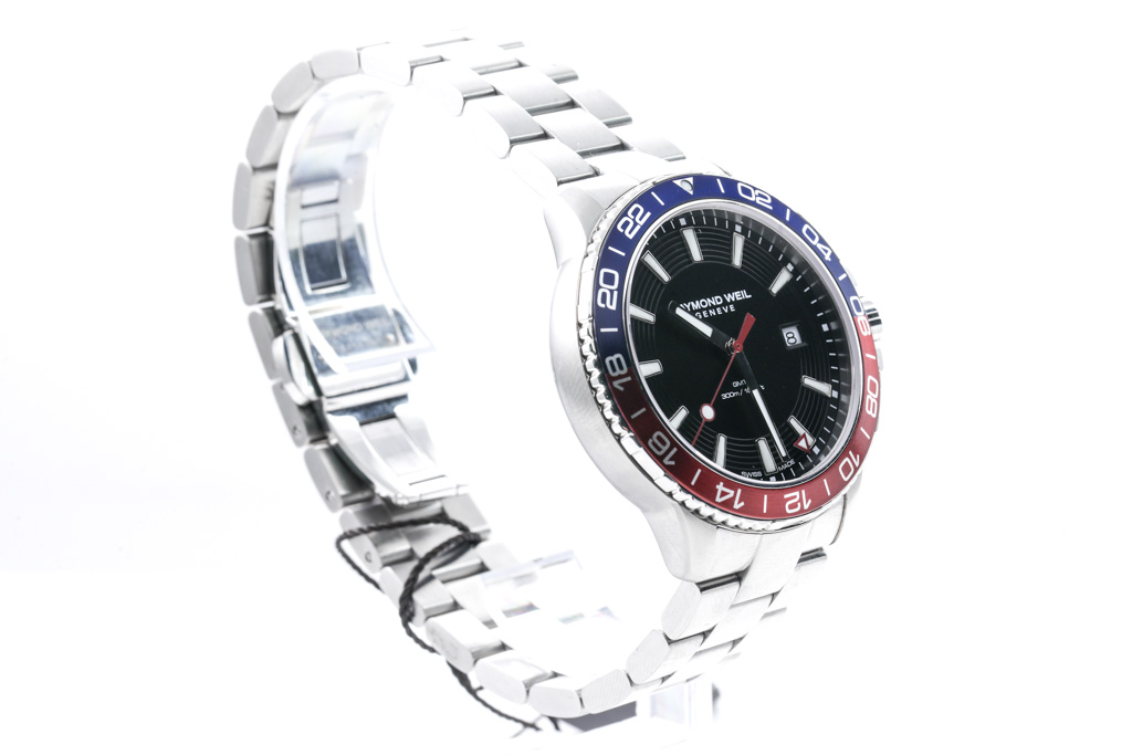 Raymond Weil Tango stainless steel quartz mens watch. Black dial, date, blue & red bezel, case diameter: 42mm, wrist size: 20cm, Swiss made. Ref# 8280-ST3-20001. With Raymond Weil stainless steel bracelet and clasp. With Raymond Weil Guarantee card and Raymond Weil box. 12 month FSA warranty. (As New, Note: minor scratches on case and bracelet due to being display stock)