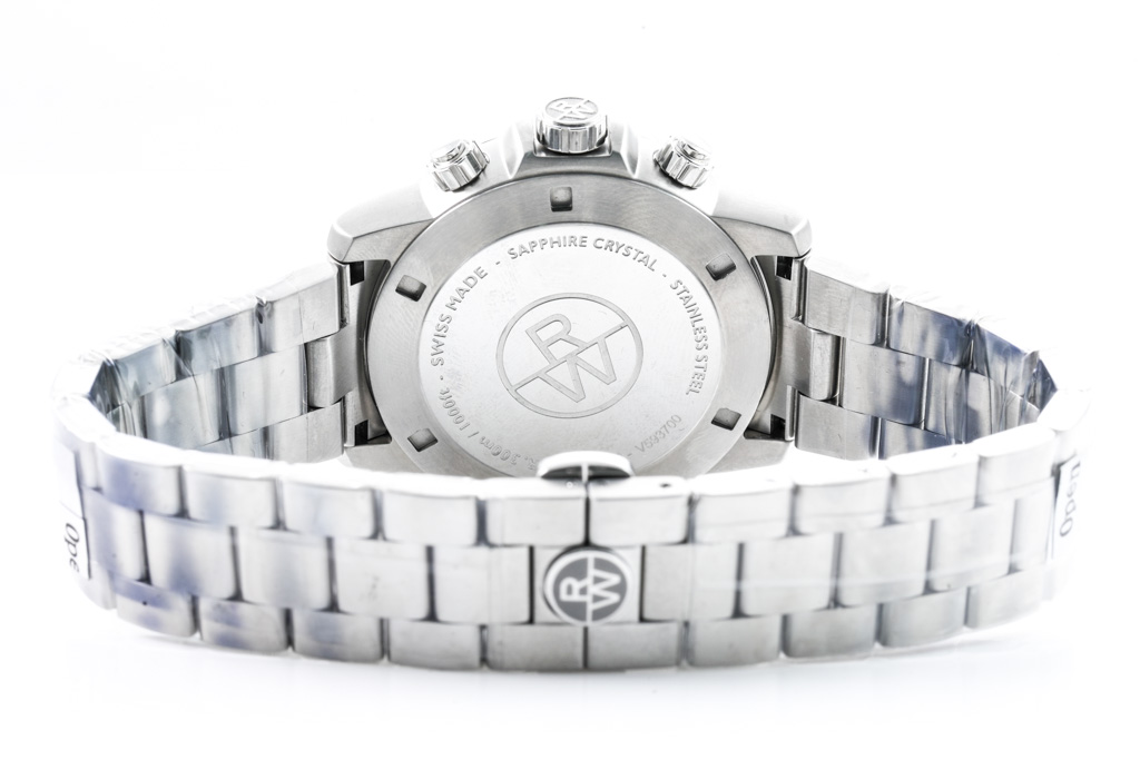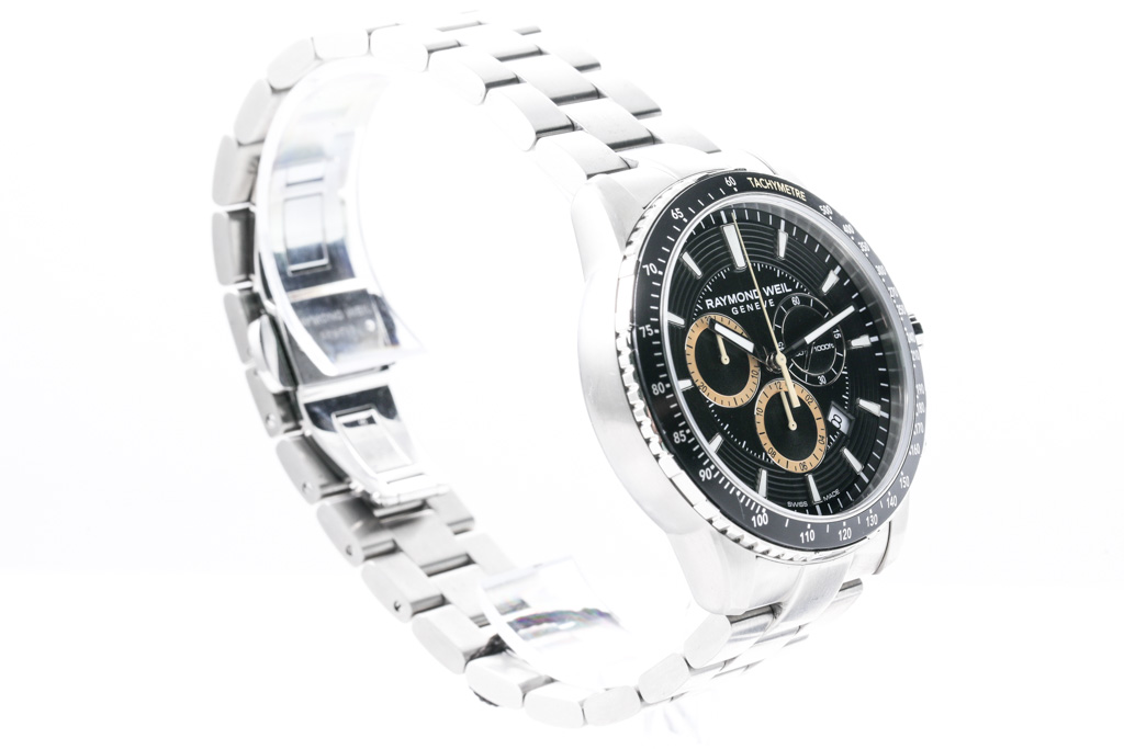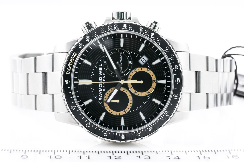 Raymond Weil Tango stainless steel quartz mens watch. Black chronograph dial, date, case diameter: 43mm, wrist size: 21cm, Swiss made. Ref# 8570-ST1-20701. With Raymond Weil stainless steel bracelet and clasp. With Raymond Weil Guarantee card and Raymond Weil box. 12 month FSA warranty. (As New, in original wrapping. Note: minor scratches on case due to being display stock)
