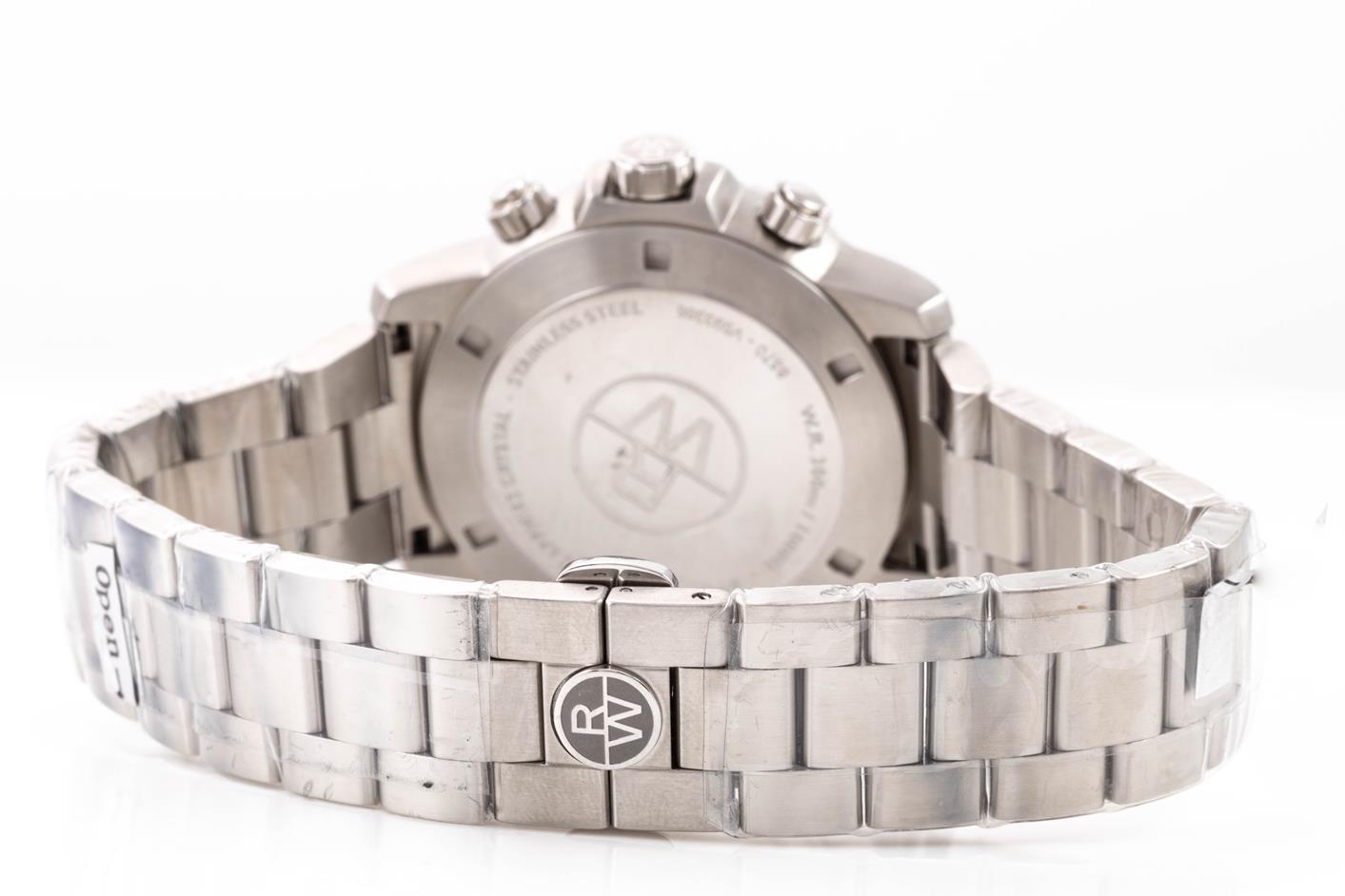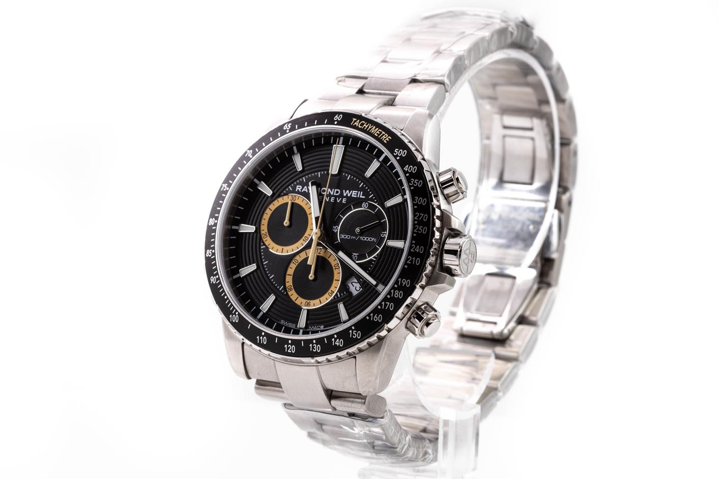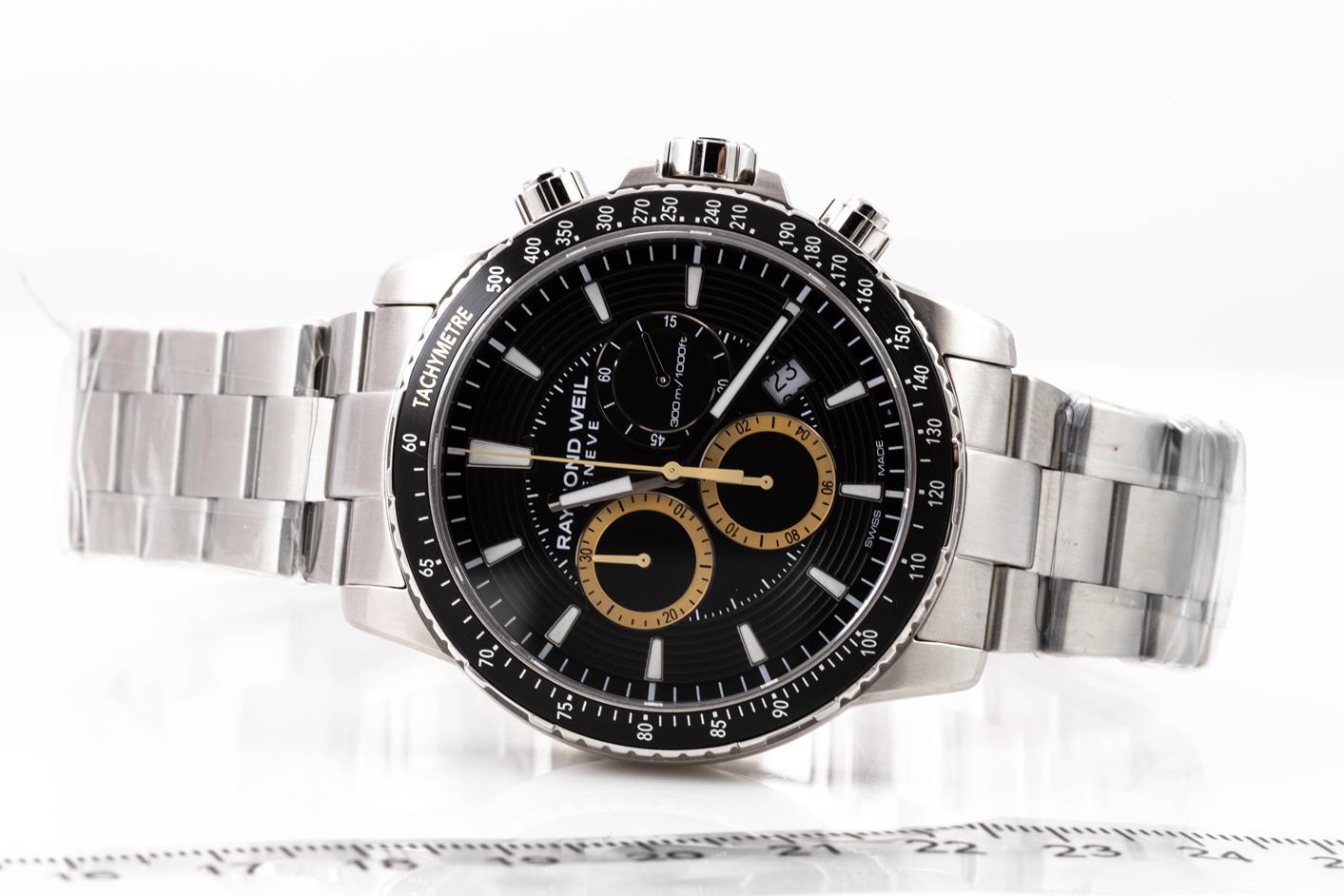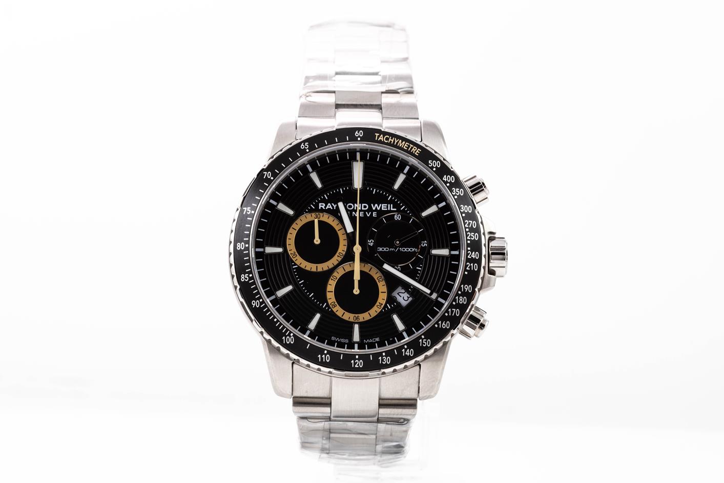 Raymond Weil Tango stainless steel quartz men's watch. Black chronograph dial, date, case diameter: 43mm, wrist size: 20.5cm, Swiss made. Ref# 8570-ST1-20701. With Raymond Weil stainless steel bracelet and clasp. With Raymond Weil Guarantee card and Raymond Weil box. 12 month FSA warranty. (As New, in original wrapping. Note: minor scratches on case due to being display stock)