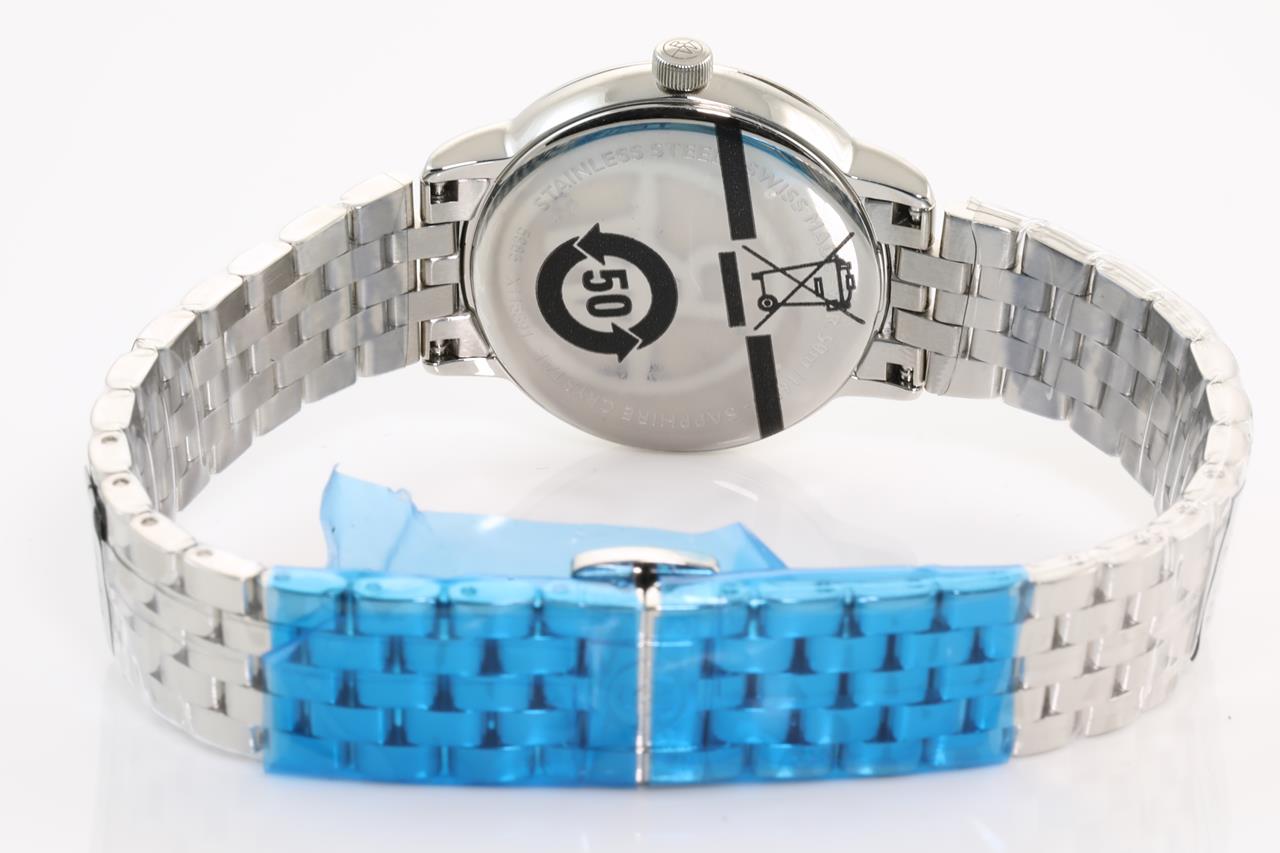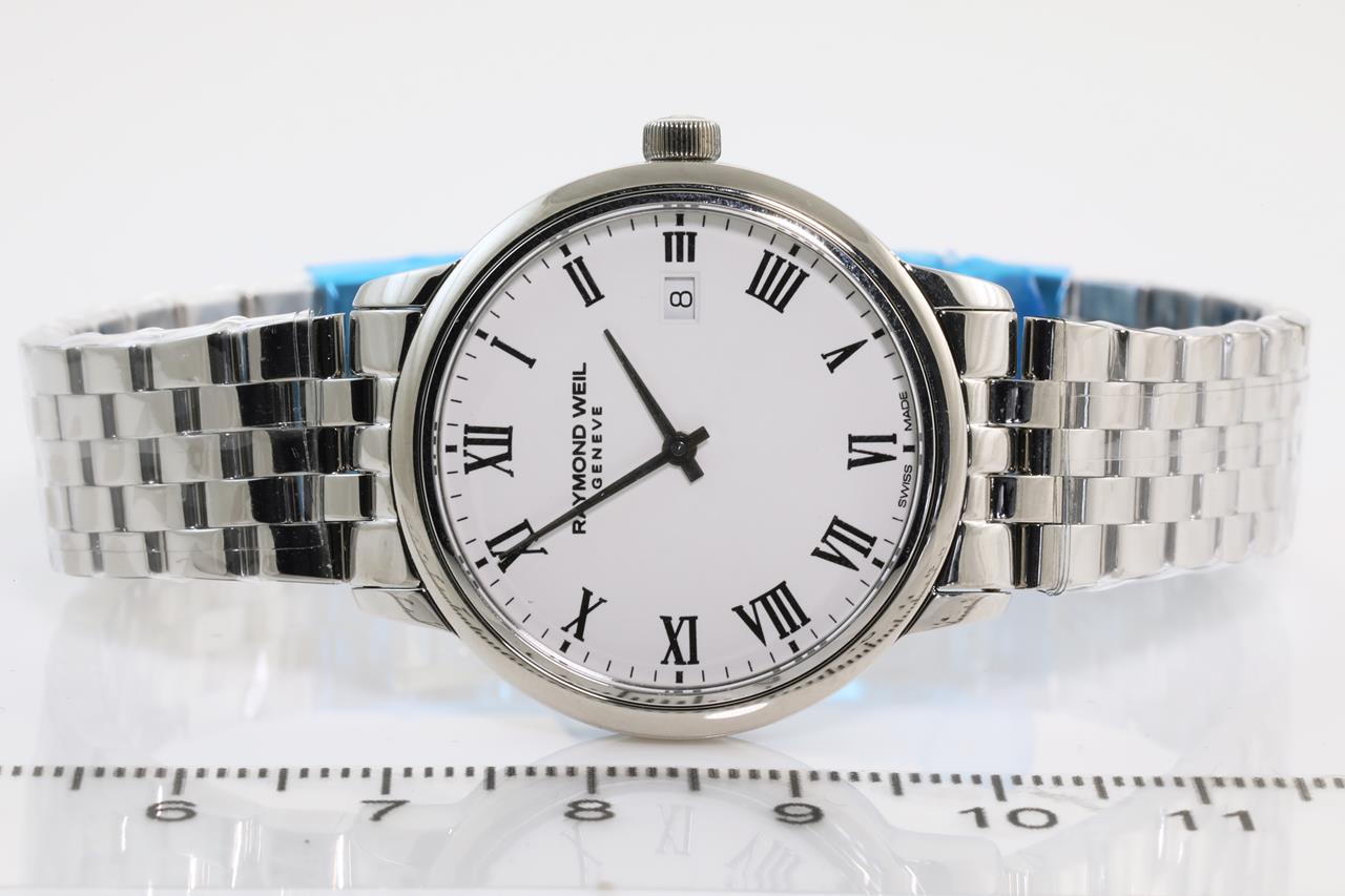 Raymond Weil Tocatta Classic stainless steel quartz ladies watch. White dial, date, case diameter; 29mm, Swiss made. Ref# 5985-ST-00300. With Raymond Weil stainless steel bracelet and clasp. With Raymond Weil box. 12 month FSA warranty (New, in original wrapping).