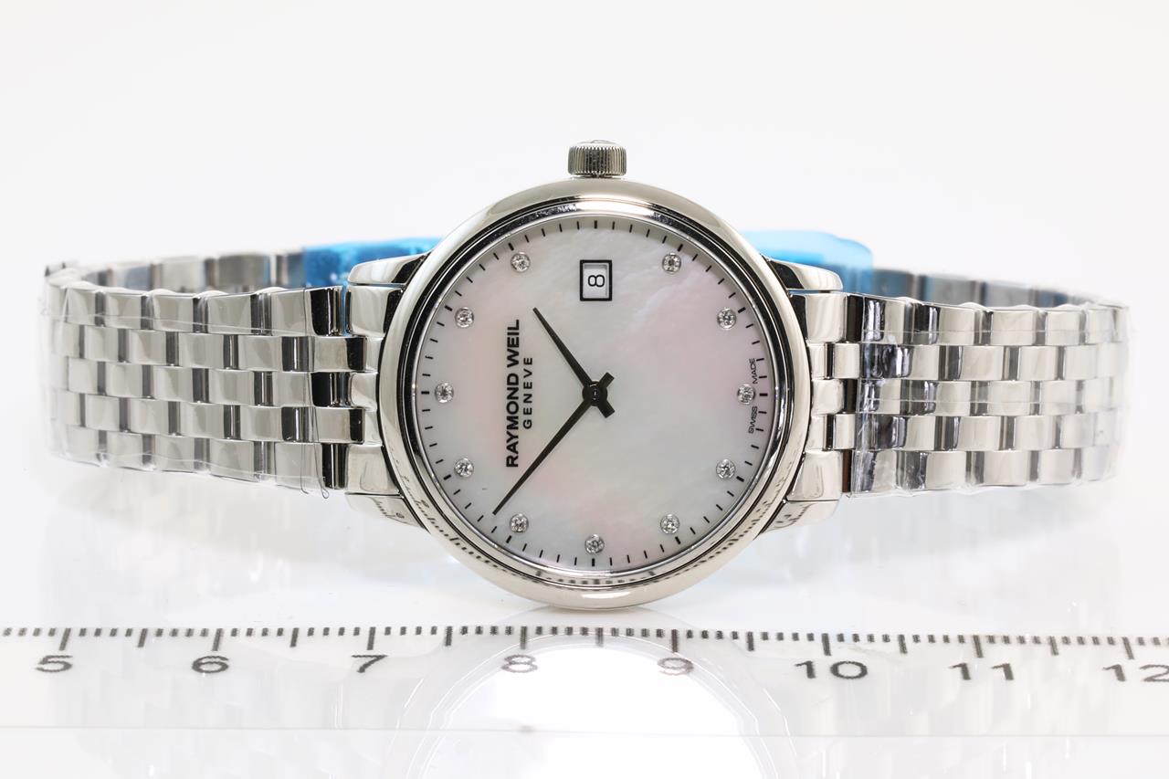 Raymond Weil Toccata stainless steel quartz women's watch. Mother of pearl dial, Diamond indicators, date, case diameter; 29mm. Swiss made. Ref# 5985-ST-97081. With Raymond Weil stainless steel bracelet and clasp. With Raymond Weil box. 12 month FSA warranty (New, in original wrapping).