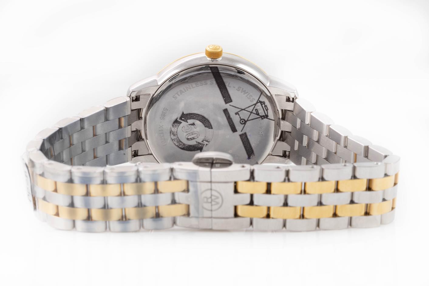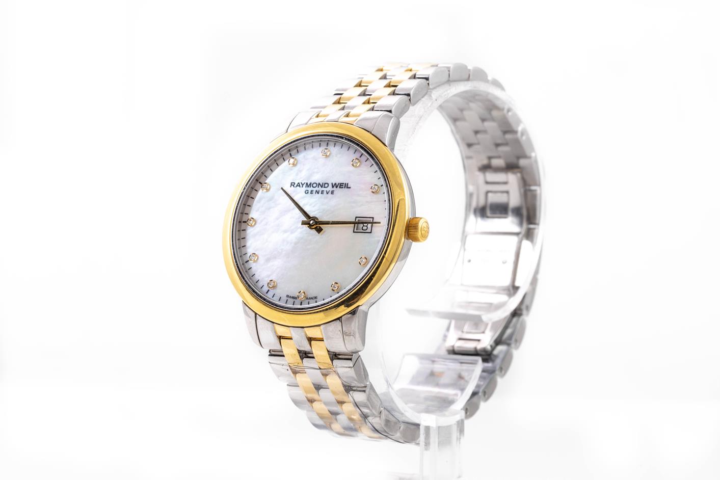 Raymond Weil Toccata stainless steel & yellow gold PVD quartz ladies watch. Mother of Pearl dial, Diamond indicators, date, case diameter: 34mm, wrist size: 18cm, Swiss made. Ref# 5385-STP-97081. With Raymond Weil two tone bracelet and clasp. With Raymond Weil Guarantee Card & Raymond Weil box. 12 month FSA warranty. (As new, Note: scratches on case and bracelet due to being display stock).