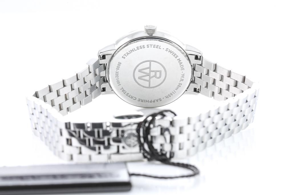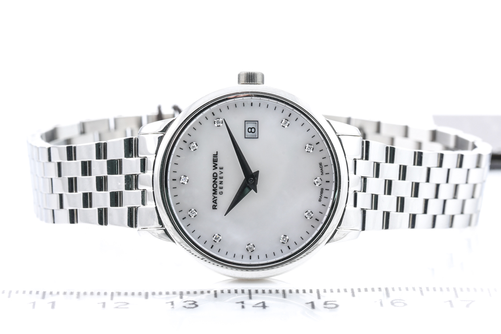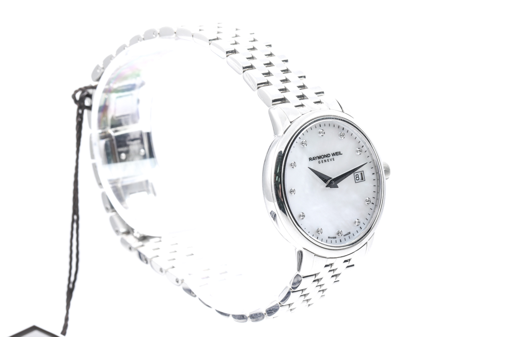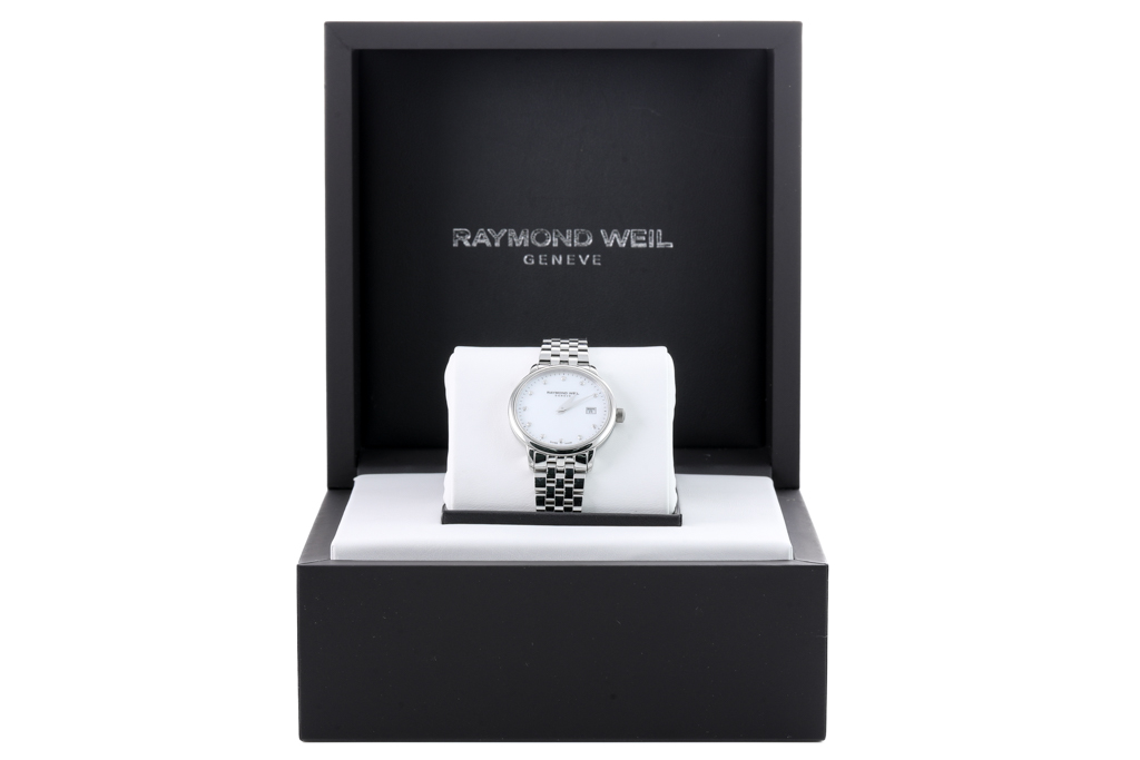 Raymond Weil Toccata stainless steel quartz ladies watch. Mother of Pearl dial, Diamond indicators, date, size: 18cm, case diameter: 29mm, Swiss made. Ref# 5988-ST-97081. With Raymond Weil stainless steel bracelet and clasp. With Raymond Weil Guarantee Card and Raymond Weil box. 12 month FSA warranty. (As New, Note: scratches on case and bracelet due to being display stock)