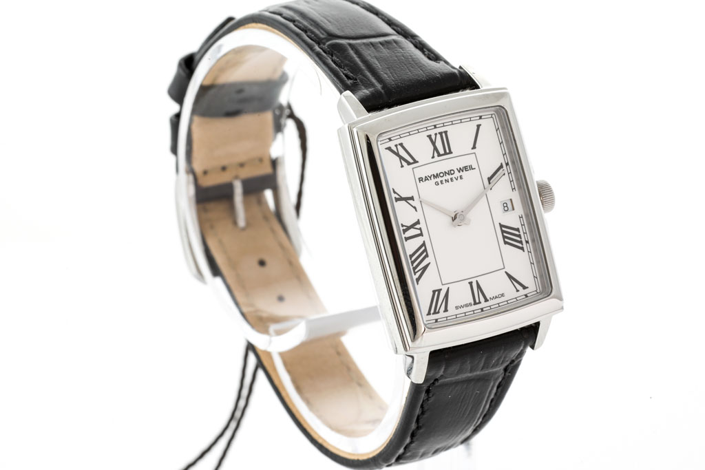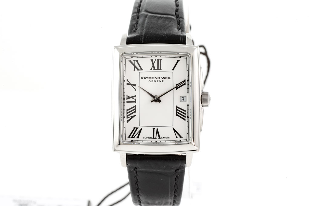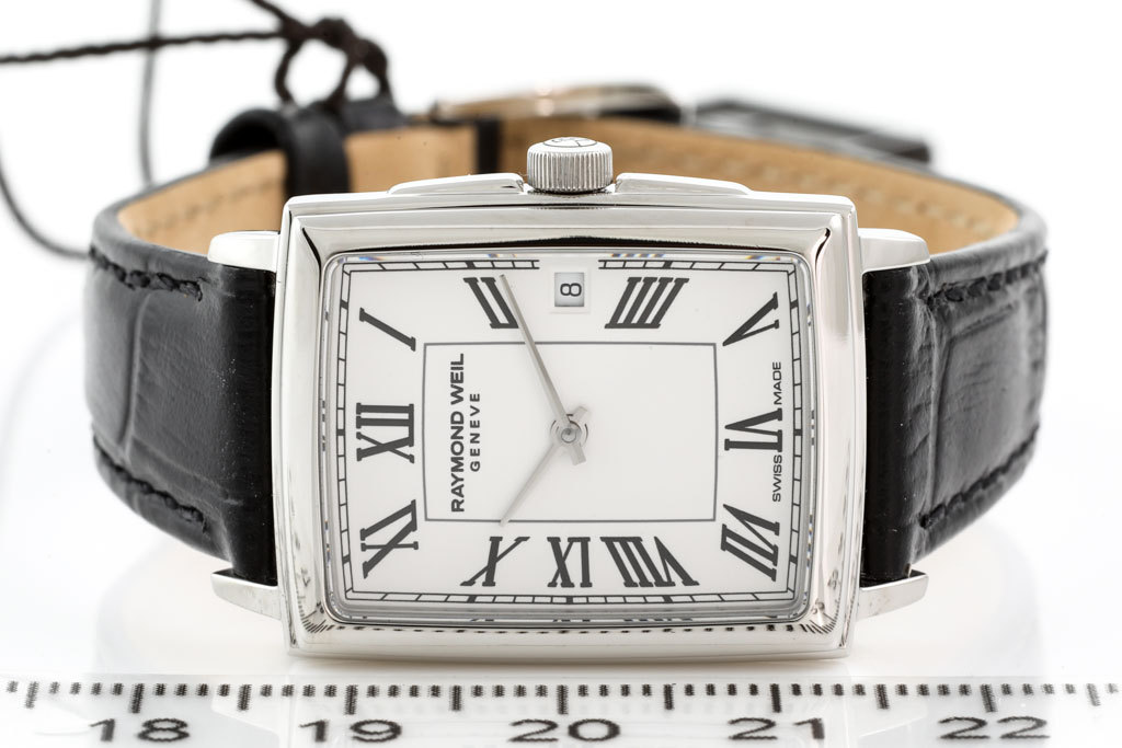 Raymond Weil Toccata stainless steel quartz ladies watch. White dial, date, case diameter: 22.6mm x 28.1mm, wrist size: 17cm, Swiss made. Ref# 5925-STC-00300. With Raymond Weil black leather strap and buckle. With Raymond Weil Guarantee card and Raymond Weil box. 12 month FSA warranty. (As New, Note: case in original wrapping)
