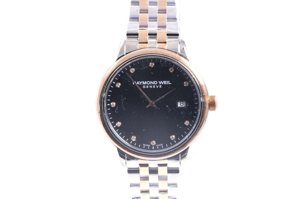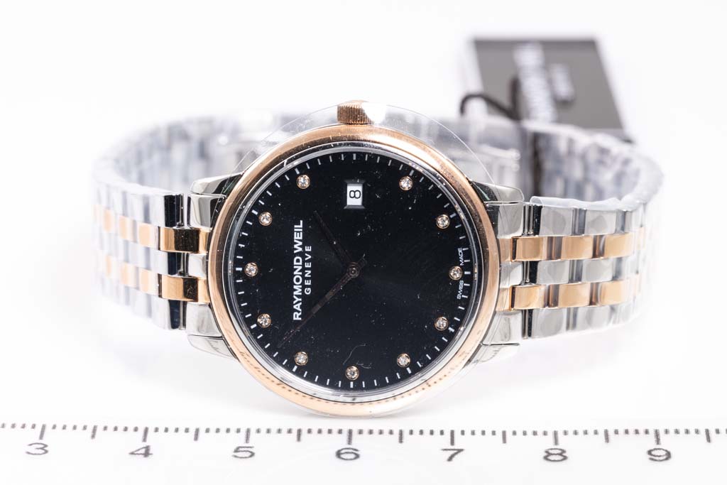 Raymond Weil Toccata stainless steel and rose gold PVD plating quartz ladies watch. Black dial, Diamond indicators, date, case diameter: 29mm, wrist size: 17.5cm, Swiss made. Ref# 5985-SP5-20081. With Raymond Weil two-tone bracelet and clasp. With Raymond Weil Guarantee card, Raymond Weil Diamond Certificate of Authenticity card and Raymond Weil box. 12 month FSA warranty. (As New, Note: bracelet in original wrapping and minor scratches on case due to being display stock)