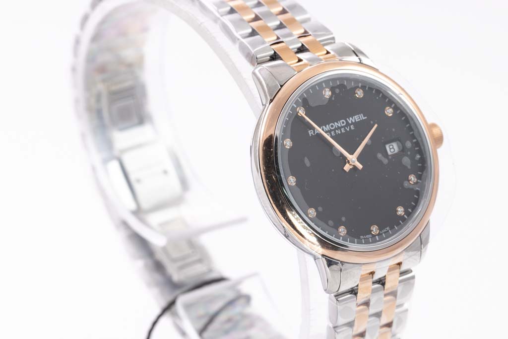 Raymond Weil Toccata stainless steel and rose gold PVD plating quartz ladies watch. Black dial, Diamond indicators, date, case diameter: 29mm, wrist size: 17.5cm, Swiss made. Ref# 5985-SP5-20081. With Raymond Weil two-tone bracelet and clasp. With Raymond Weil Guarantee card and Raymond Weil box. 12 month FSA warranty. (As New, Note: bracelet in original wrapping and minor scratches on case due to being display stock)