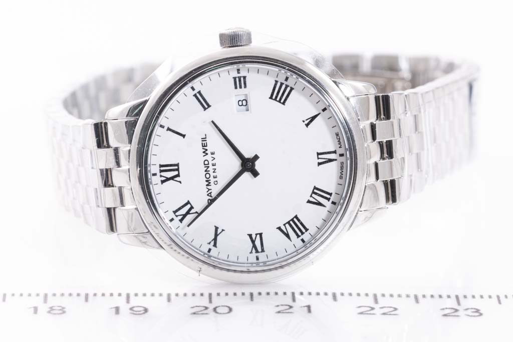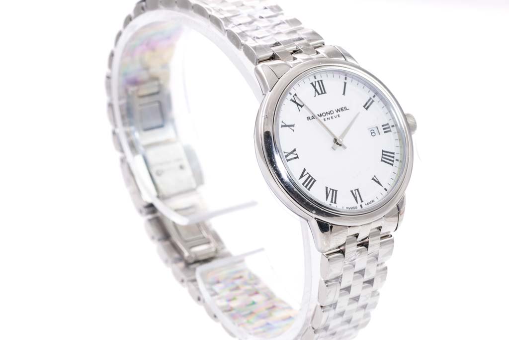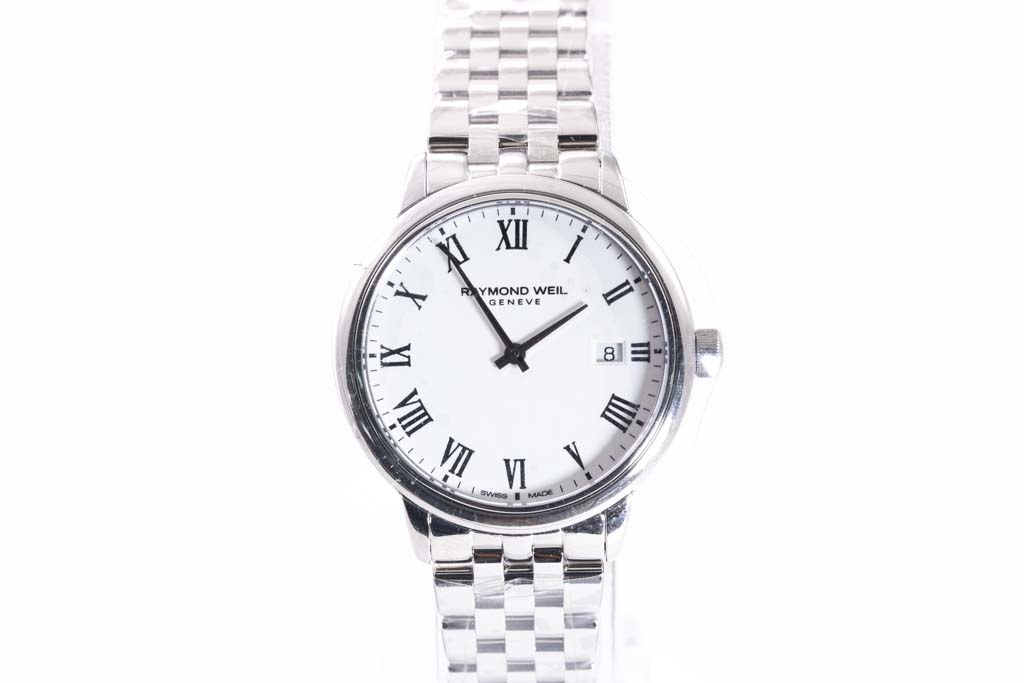 Raymond Weil Toccata stainless steel quartz ladies watch. White dial, date, case diameter: 29mm, wrist size: 18cm, Swiss made. Ref# 5985-ST-00300. With Raymond Weil stainless steel bracelet and clasp. With Raymond Weil Guarantee card and Raymond Weil box. 12 month FSA warranty. (As New, minor scratches on case and bracelet in original wrapping)