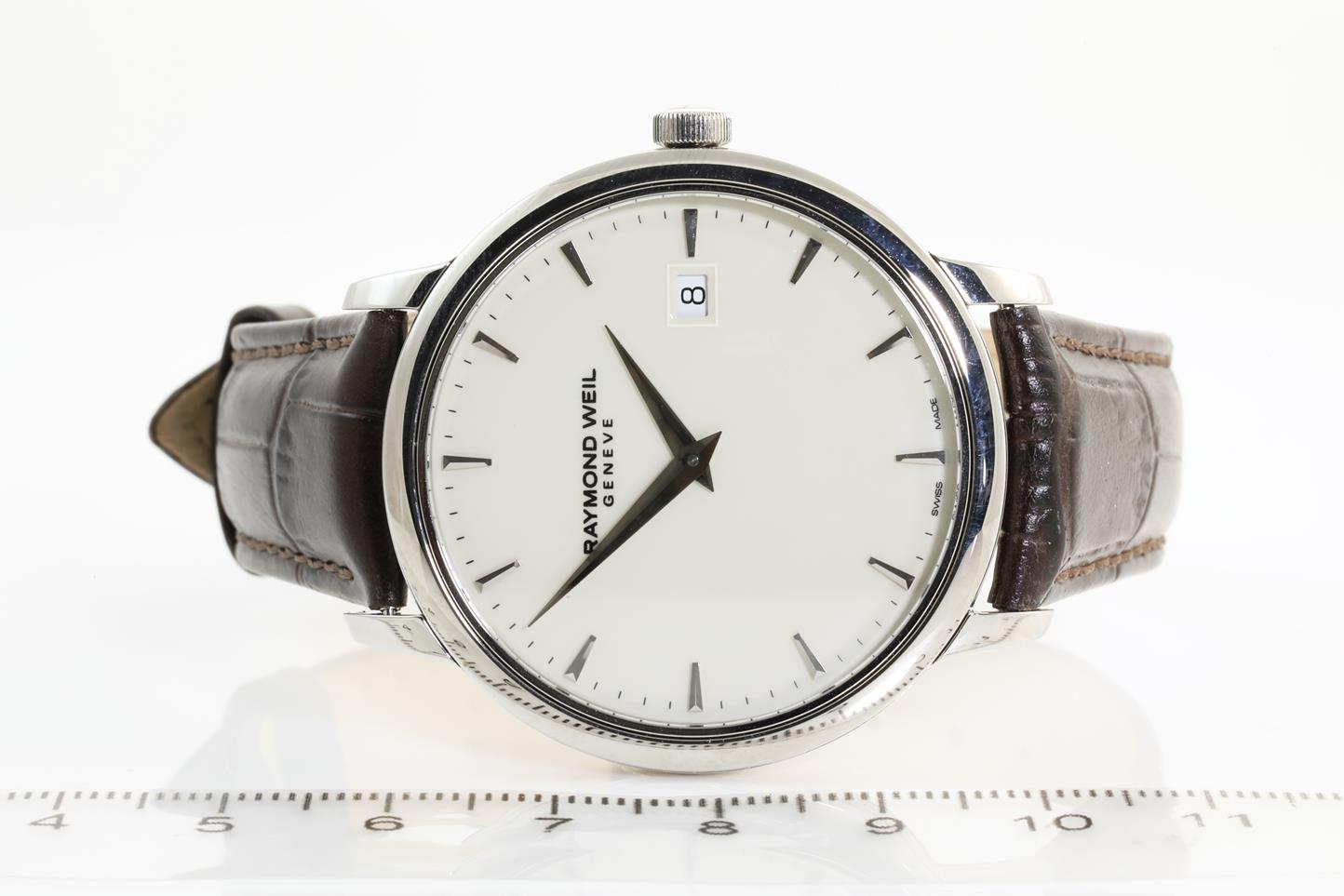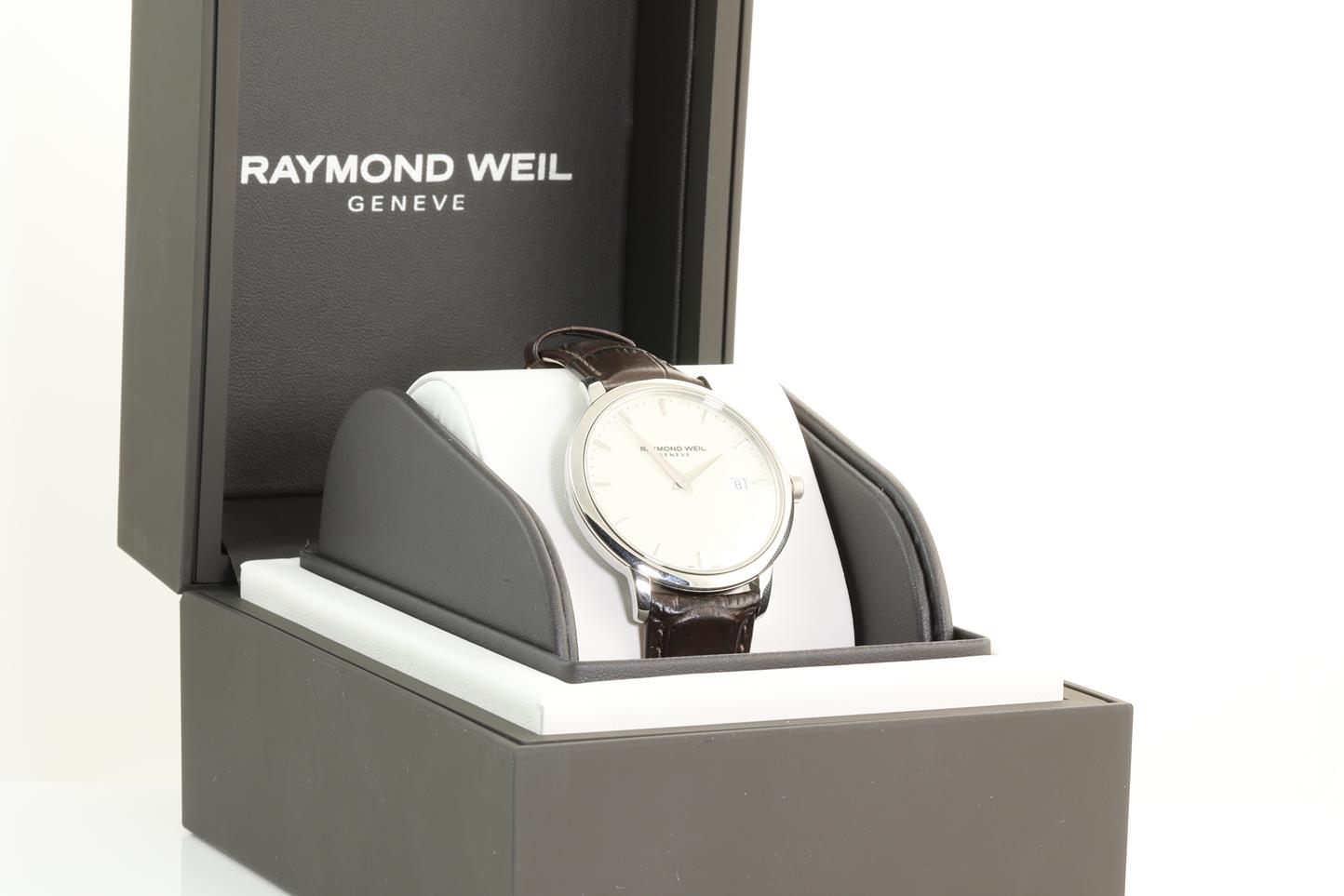 Raymond Weil Toccata stainless steel quartz men's watch. Ivory dial, date, case diameter; 39mm, Swiss made. Ref #5488-STC-40001. With Raymond Weil brown leather strap. With Raymond Weil box. 12 month FSA warranty (New, in original wrapping).