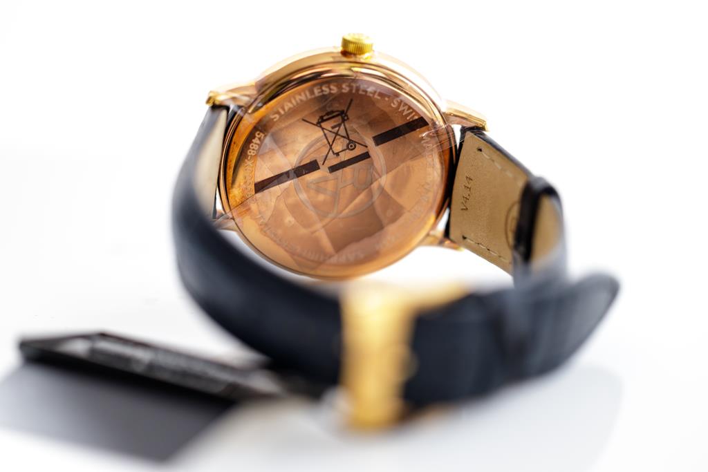 Raymond Weil Toccata stainless steel gold plated quartz mens watch. Black dial, date, case diameter: 39mm, length: 21cm, Swiss made. Ref#5488-PC5-20001. With Raymond Weil black leather strap and buckle. With Raymond Weil Guarantee card and Raymond Weil box. 12 month FSA warranty. (As New, Note: light wear on strap due to being display stock)