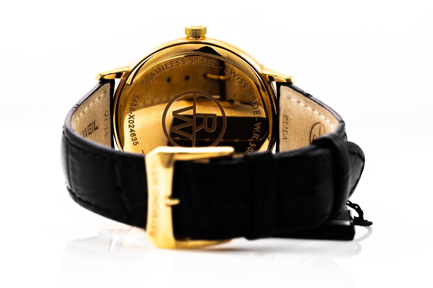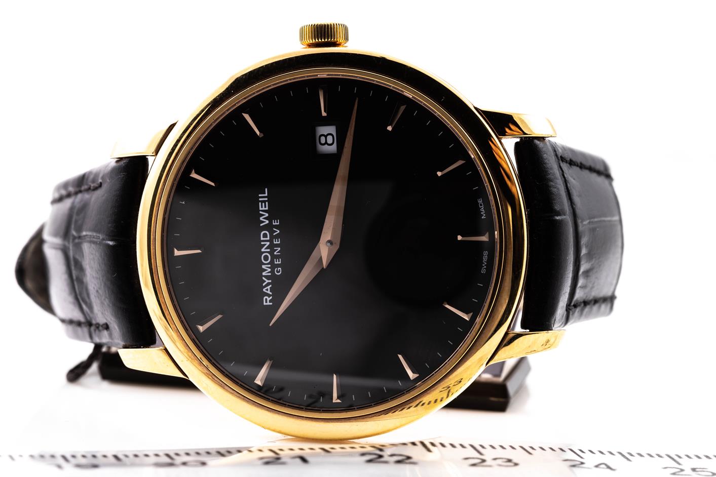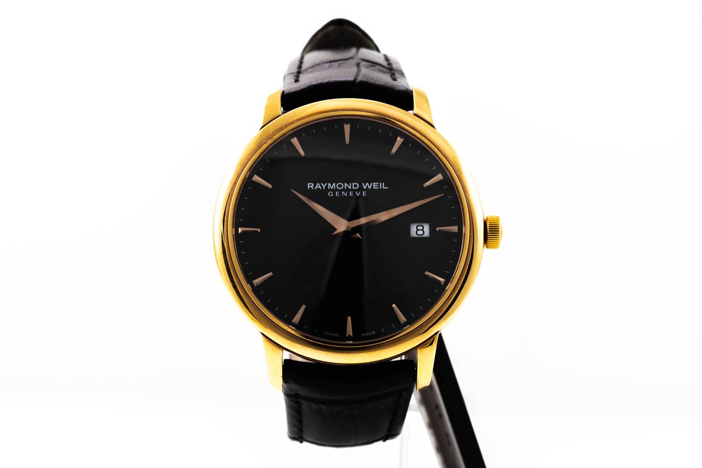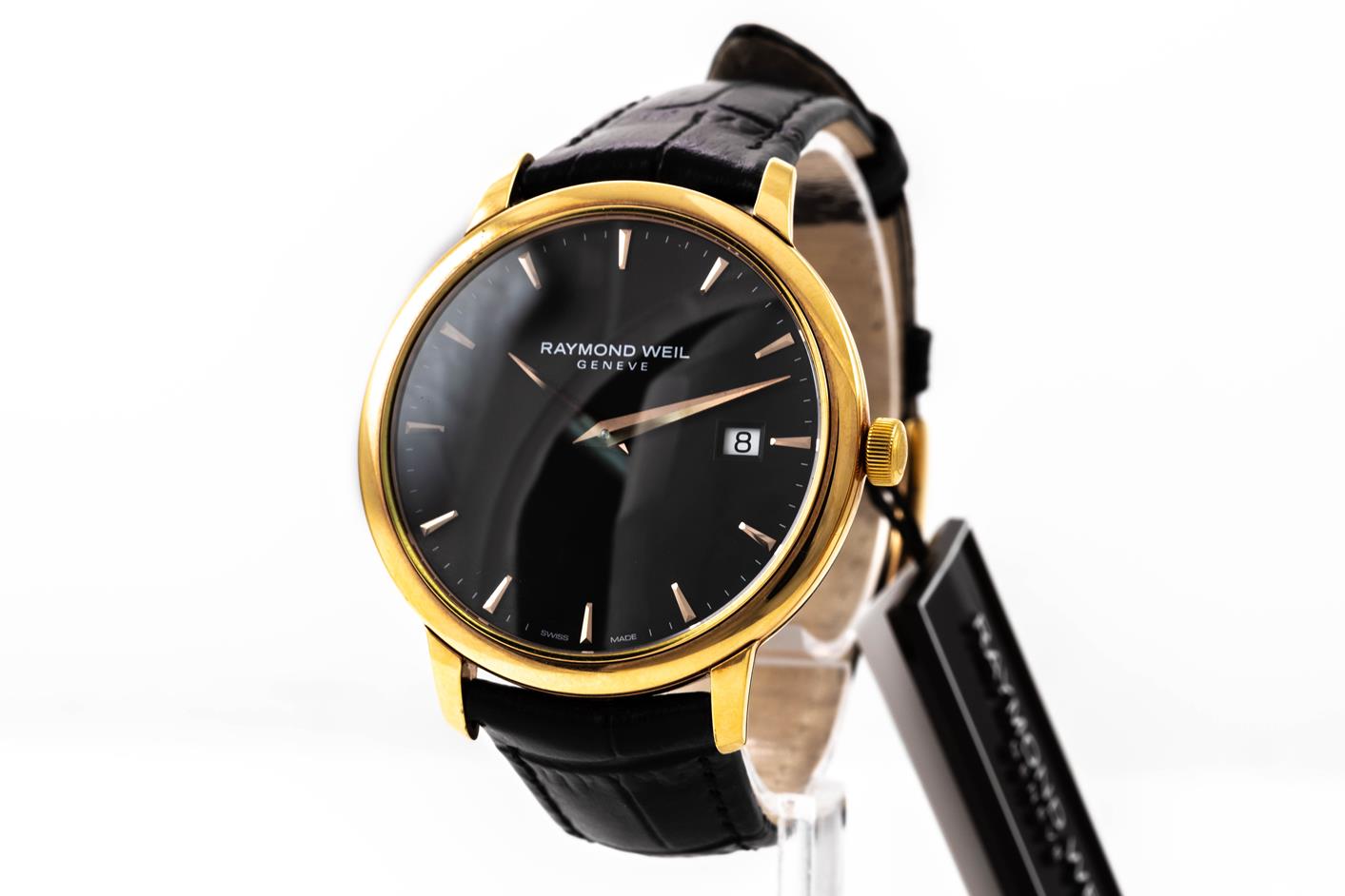 Raymond Weil Toccata stainless steel gold plated quartz mens watch. Black dial, date, case diameter: 39mm, strap length: 21cm, Swiss made. Ref#5488-PC5-20001. With Raymond Weil black leather strap and buckle. With Raymond Weil Guarantee card and Raymond Weil box. 12 month FSA warranty. (As New, Note: minor scratches on case and light wear on strap due to being display stock)