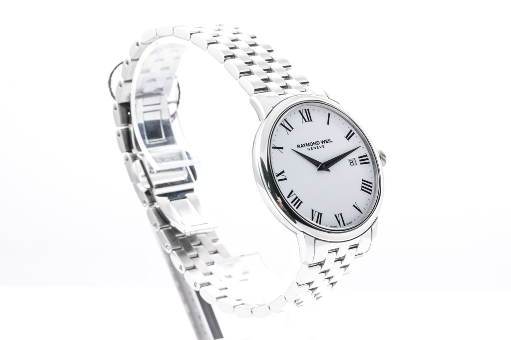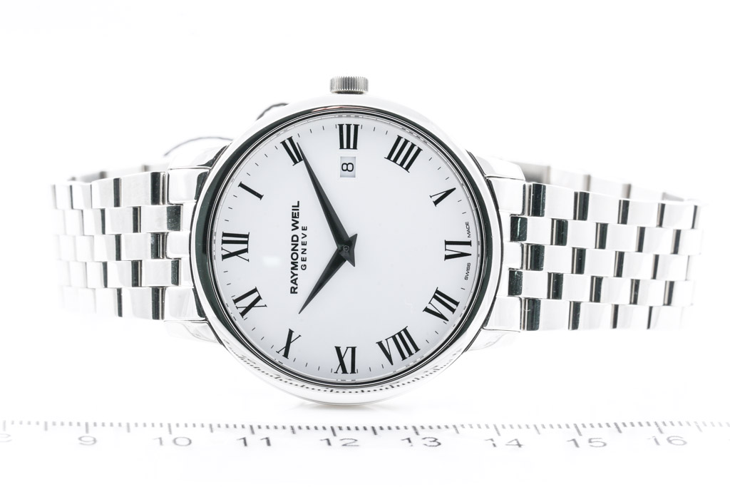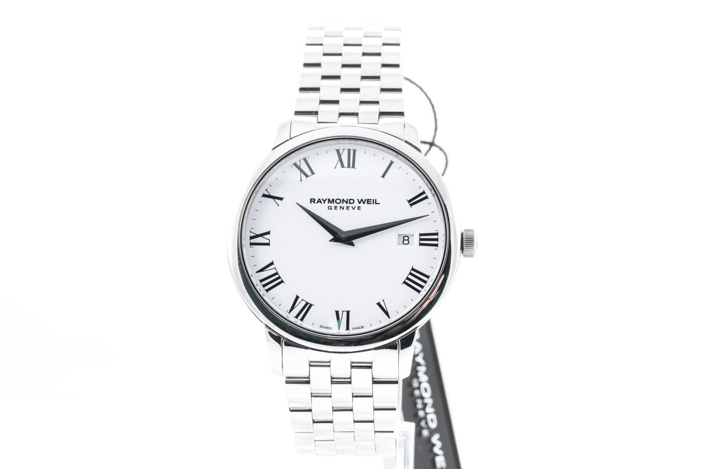 Raymond Weil Toccata stainless steel quartz men's watch. White dial, date, case diameter: 39mm, wrist size: 20.5cm, Swiss made. Ref# 5488-ST-00300. With Raymond Weil stainless steel bracelet and clasp. With 12 month FSA warranty. (As New, Note: minor scratches on case and bracelet due to being display stock)