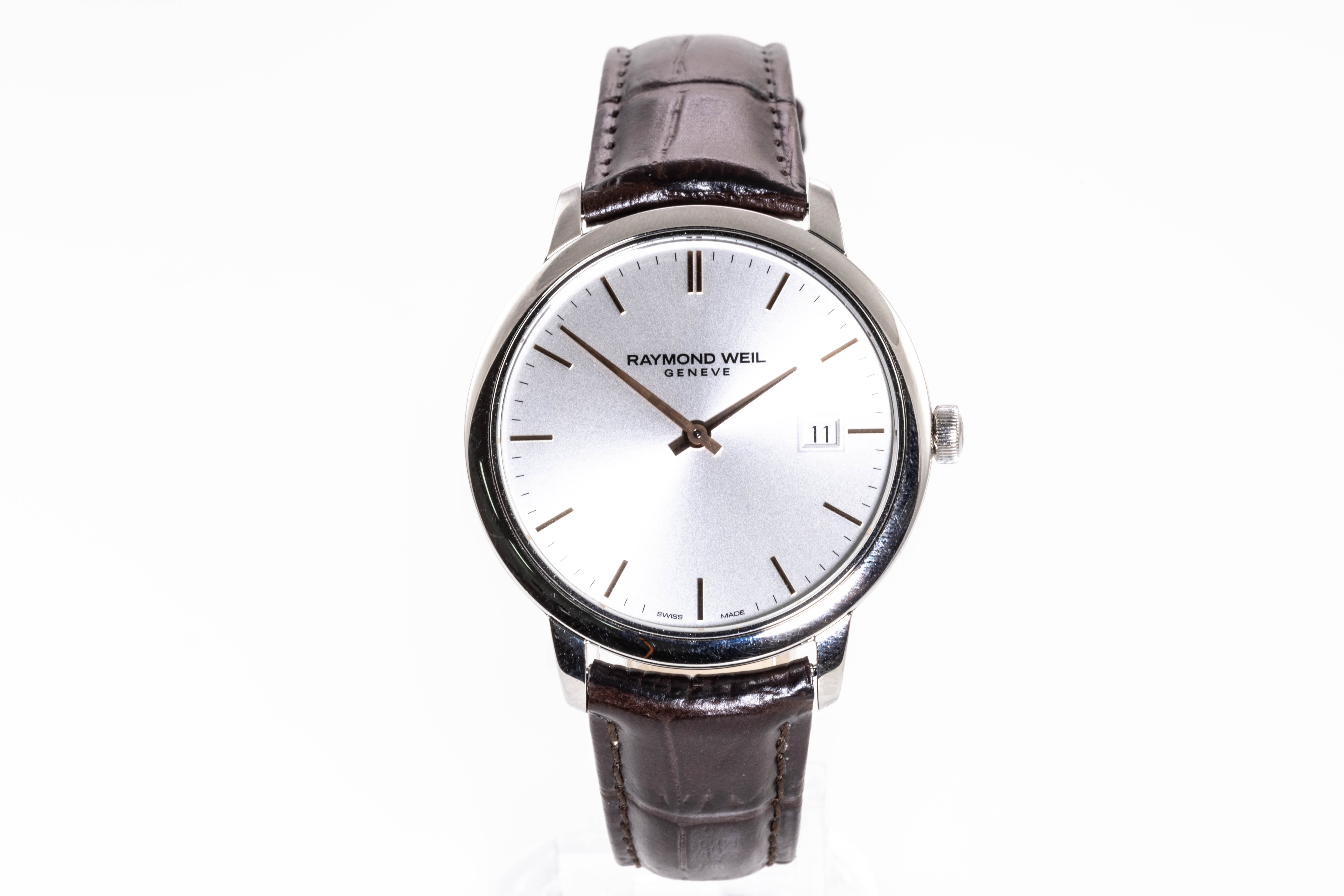 Raymond Weil Toccata stainless steel quartz mens watch. Silver dial, date, case diameter: 39mm, strap length: 21cm Swiss made. Ref# 5485-SL5-65001. With Raymond Weil brown leather strap and clasp. With Raymond Weil Guarantee Card and Raymond Weil box. 12 month FSA warranty. (As new, Note: light wear on strap and minor scratches on case due to being display stock)