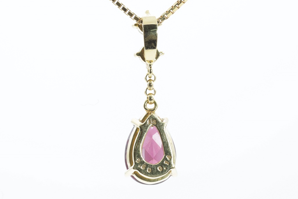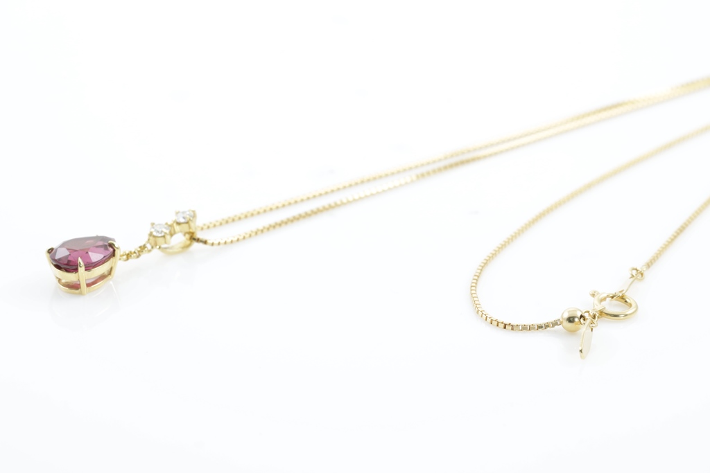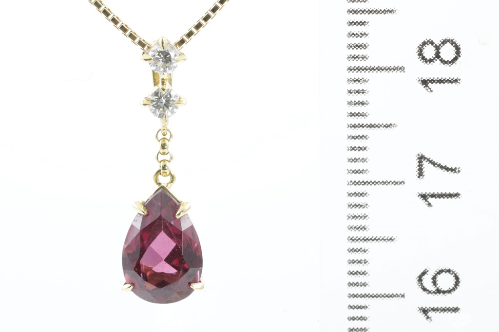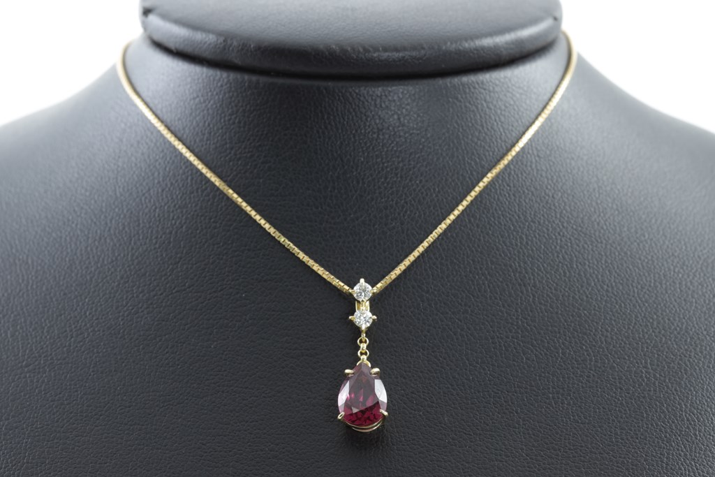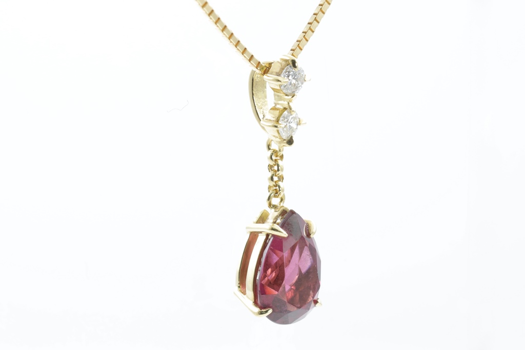 Garnet and Diamond pendant with a pear shape Rhodolite Garnet of 2.60ct and 2 Diamonds totalling 0.14cts. 18ct yellow gold with adjustable 44cm chain. Weight: 4.7g. (Pre-owned)
