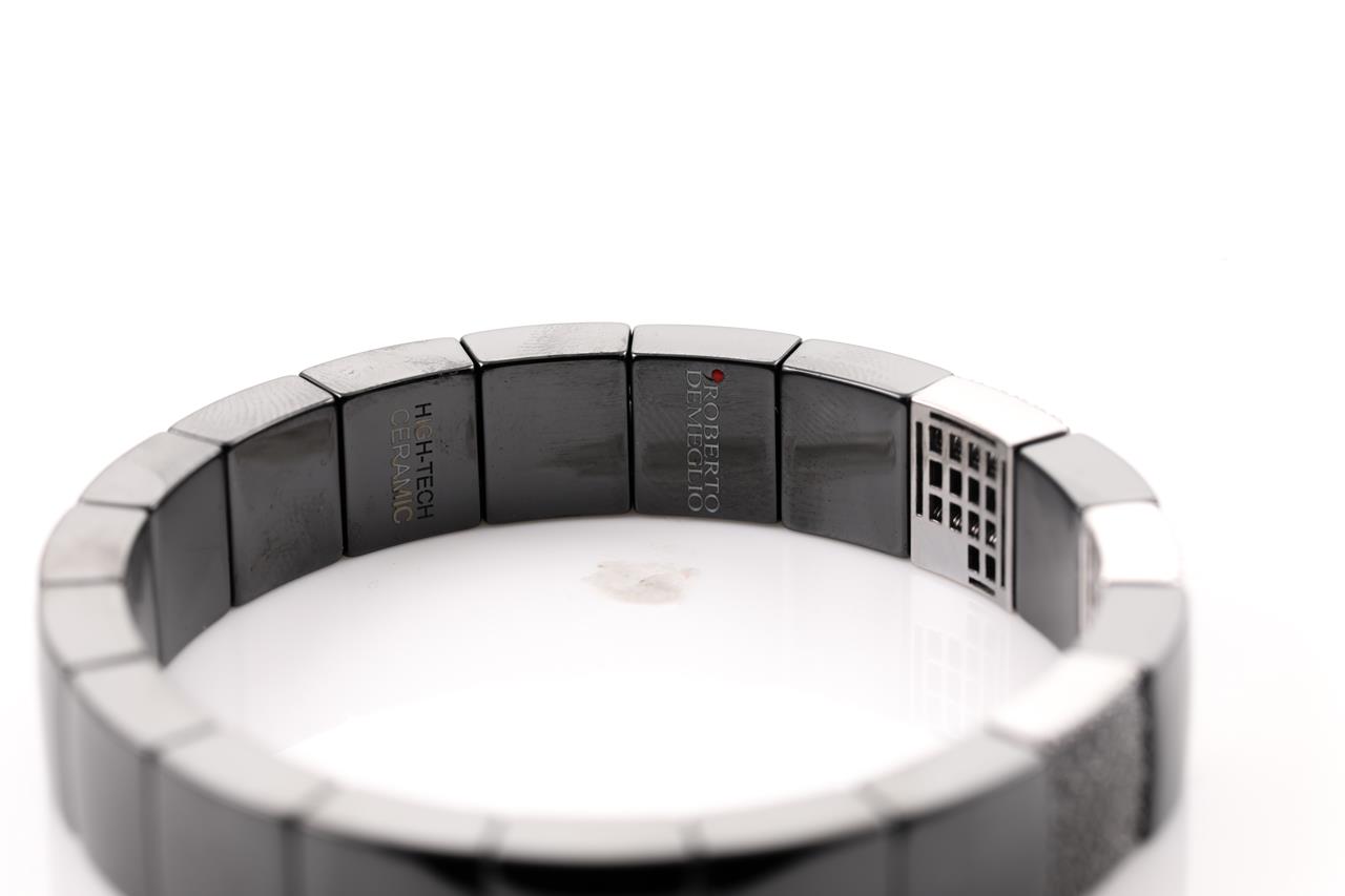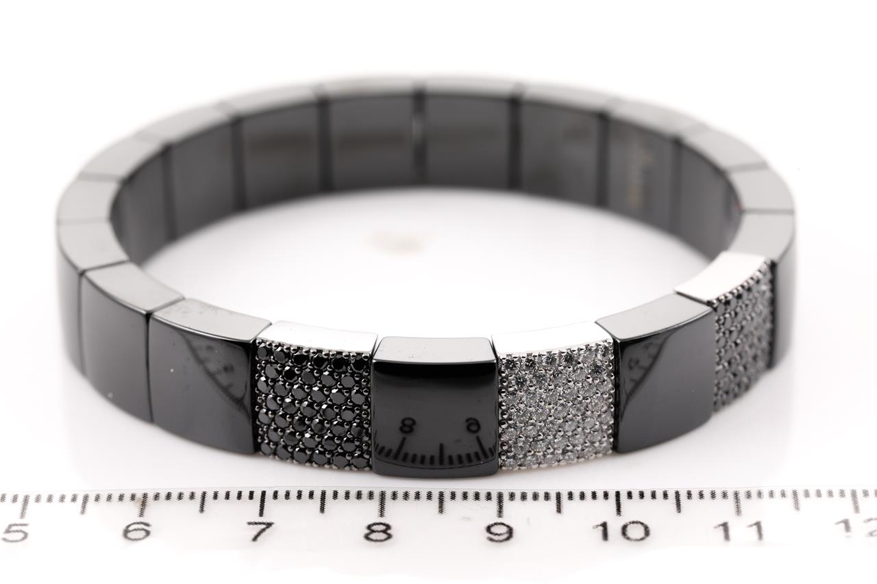 Roberto Demeglio Scacco 18ct white gold and black ceramic stretch bracelet with round black Diamonds totalling 1.42cts and white Diamonds totalling 0.67cts (Estimated grading: G VS-SI). Weight: 57.8g. Circumference: 18cm. With Cerrone valuation dated 06/07/2020. (Pre-owned)