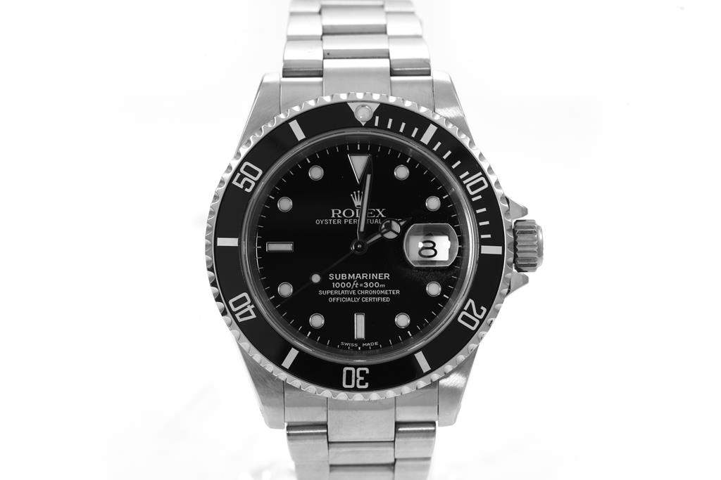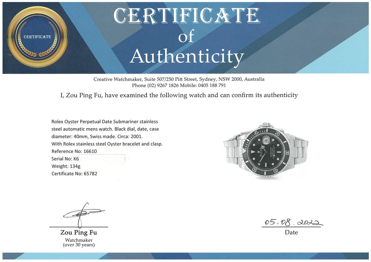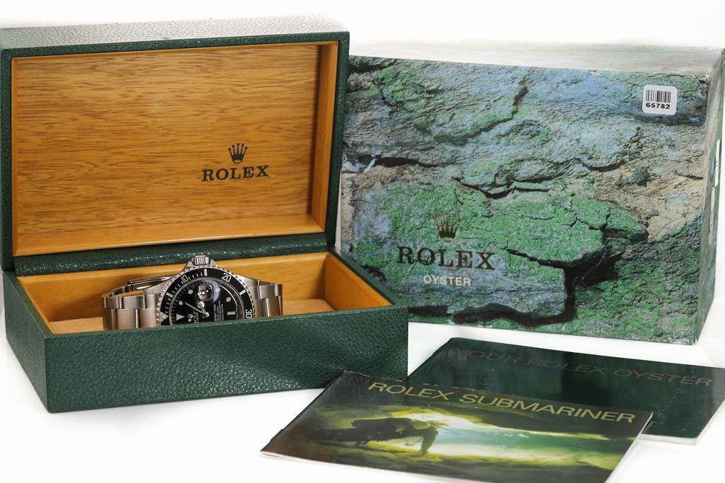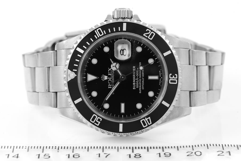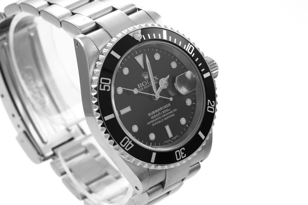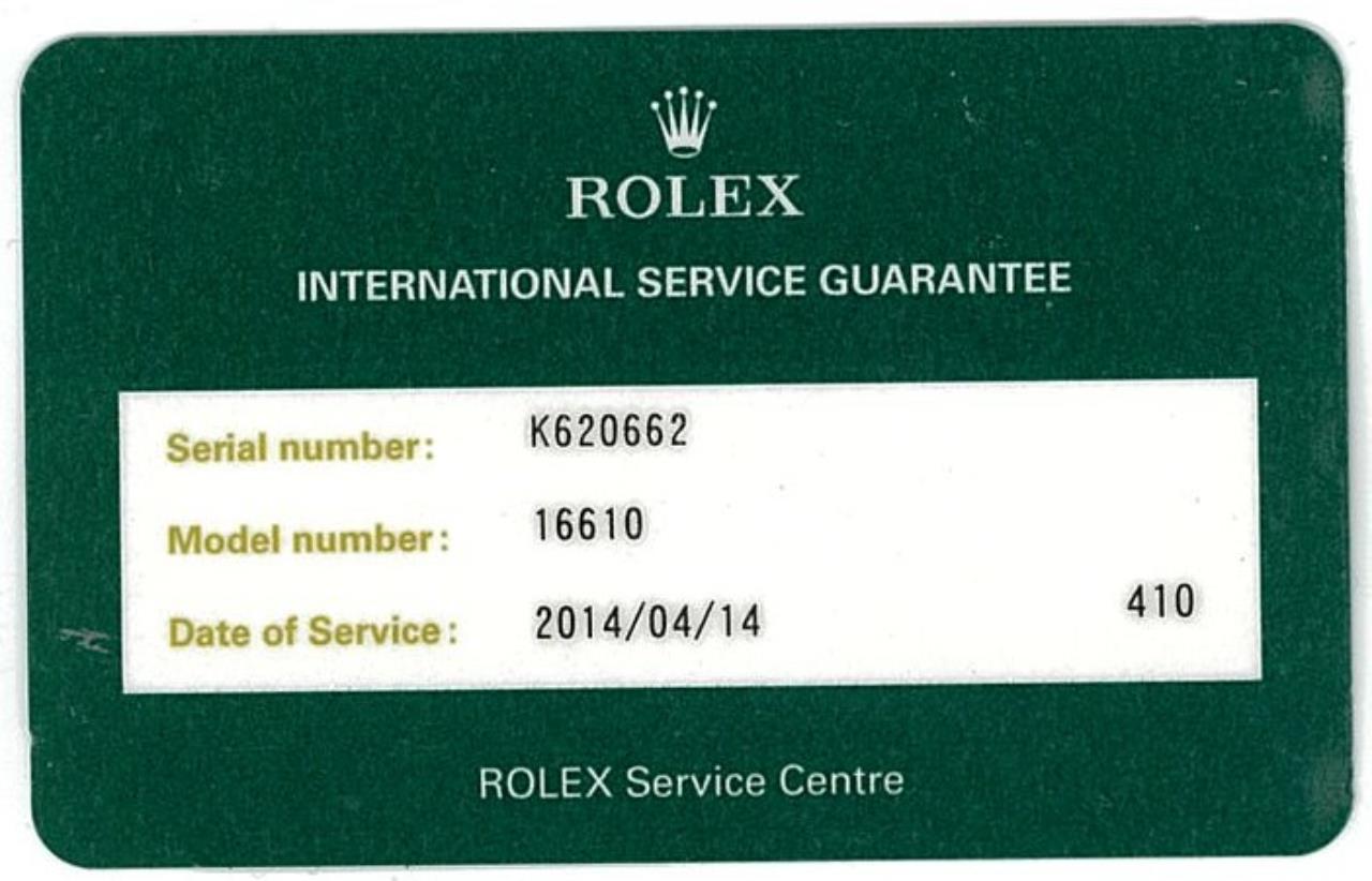 Rolex Oyster Perpetual Date Submariner stainless steel automatic mens watch. Black dial, date, case diameter: 40mm, wrist size: 18cm, Swiss made. Ref# 16610, Circa: 2001. With Rolex stainless steel Oyster bracelet and clasp. With Certificate of Authenticity, Rolex International Service Guarantee Card dated 14/04/2014 and Rolex box. 3 month FSA warranty. (Pre-owned)