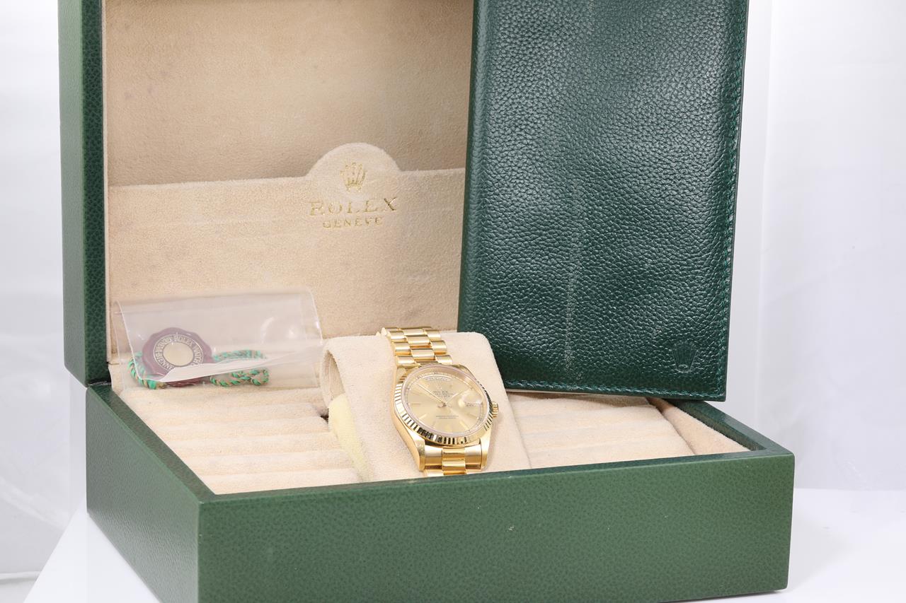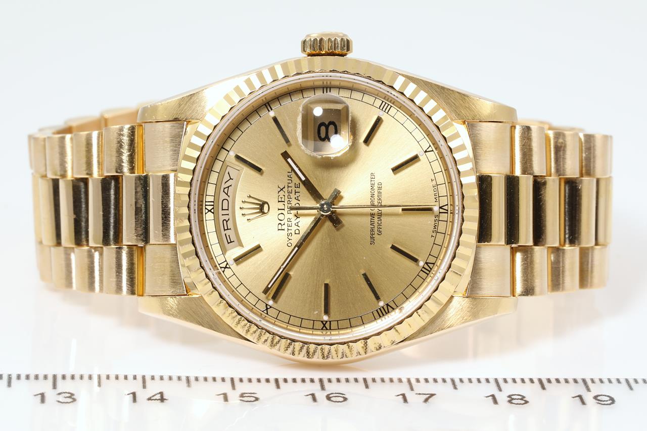 Rolex Oyster Perpetual Day-Date 18ct yellow gold automatic mens watch. Gold dial, day & date, case diameter: 36mm, wrist size: 18cm, Swiss made. Ref# 18238, Circa: 1996. With Rolex 18ct gold Presidential bracelet and clasp. With certificate of authenticity and Rolex box. 6 month watchmaker warranty from the date of full service. (Pre-owned)
