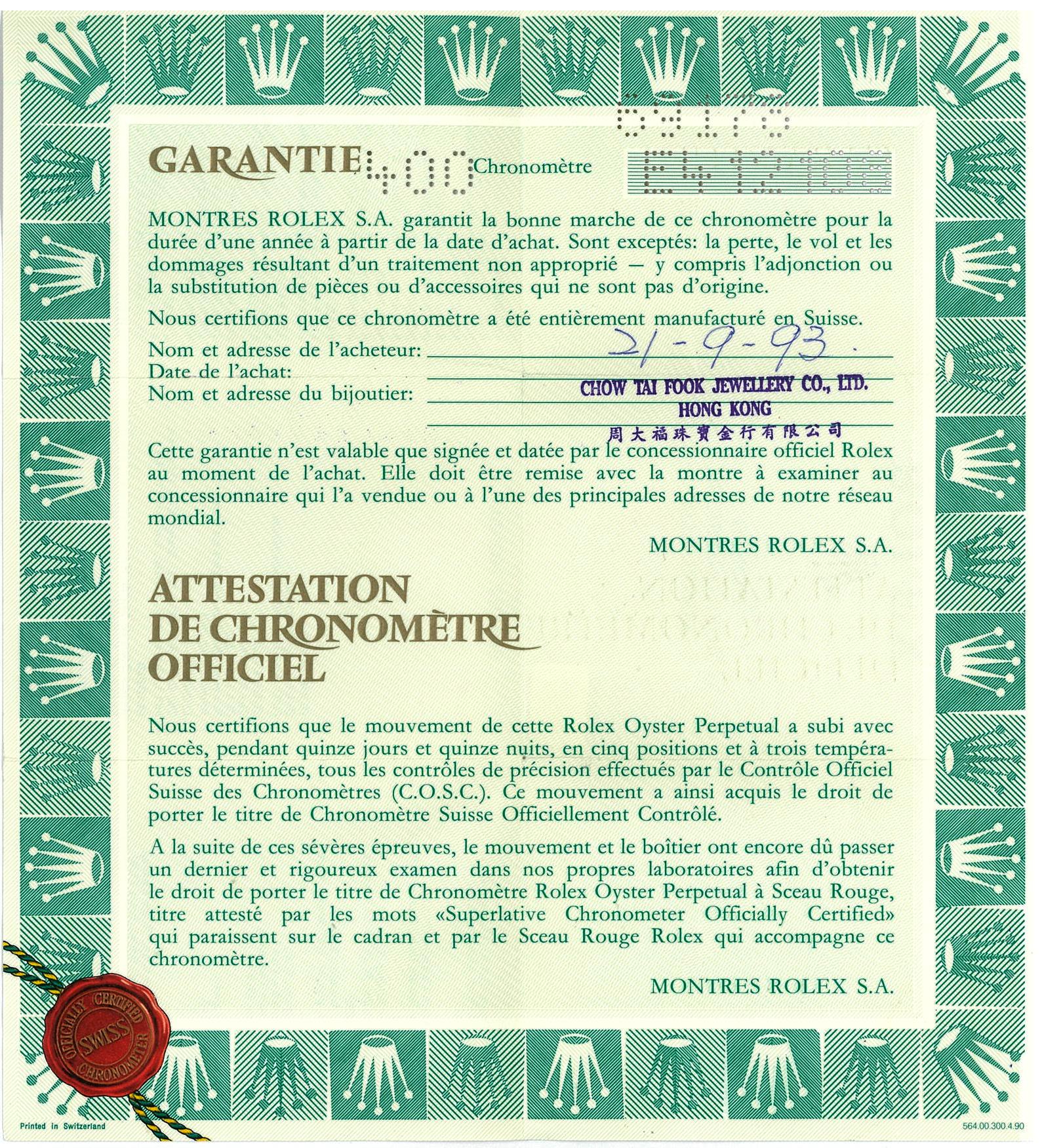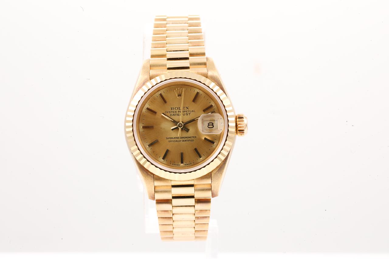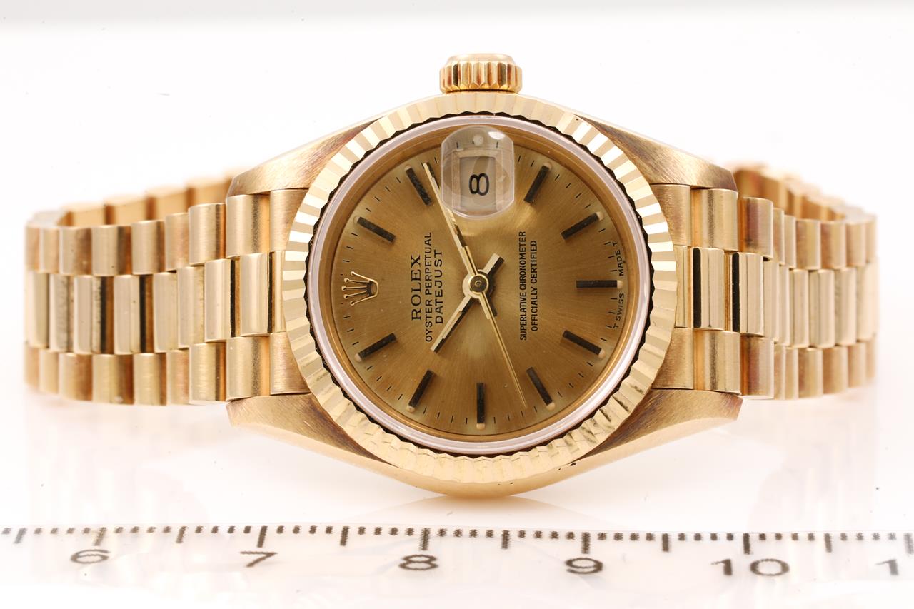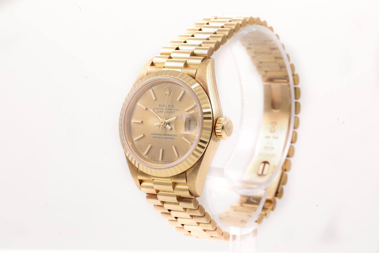 Rolex Oyster Perpetual Datejust 18ct yellow gold automatic ladies watch. Gold dial, date, wrist size: 16cm, case diameter: 26mm, Swiss made. Ref# 69178, Circa: 1990. With Rolex 18ct gold Presidential bracelet and clasp. With Certificate of Authenticity and Rolex Guarantee Certificate dated 21/9/1993. 3 months FSA warranty. (Pre-owned)