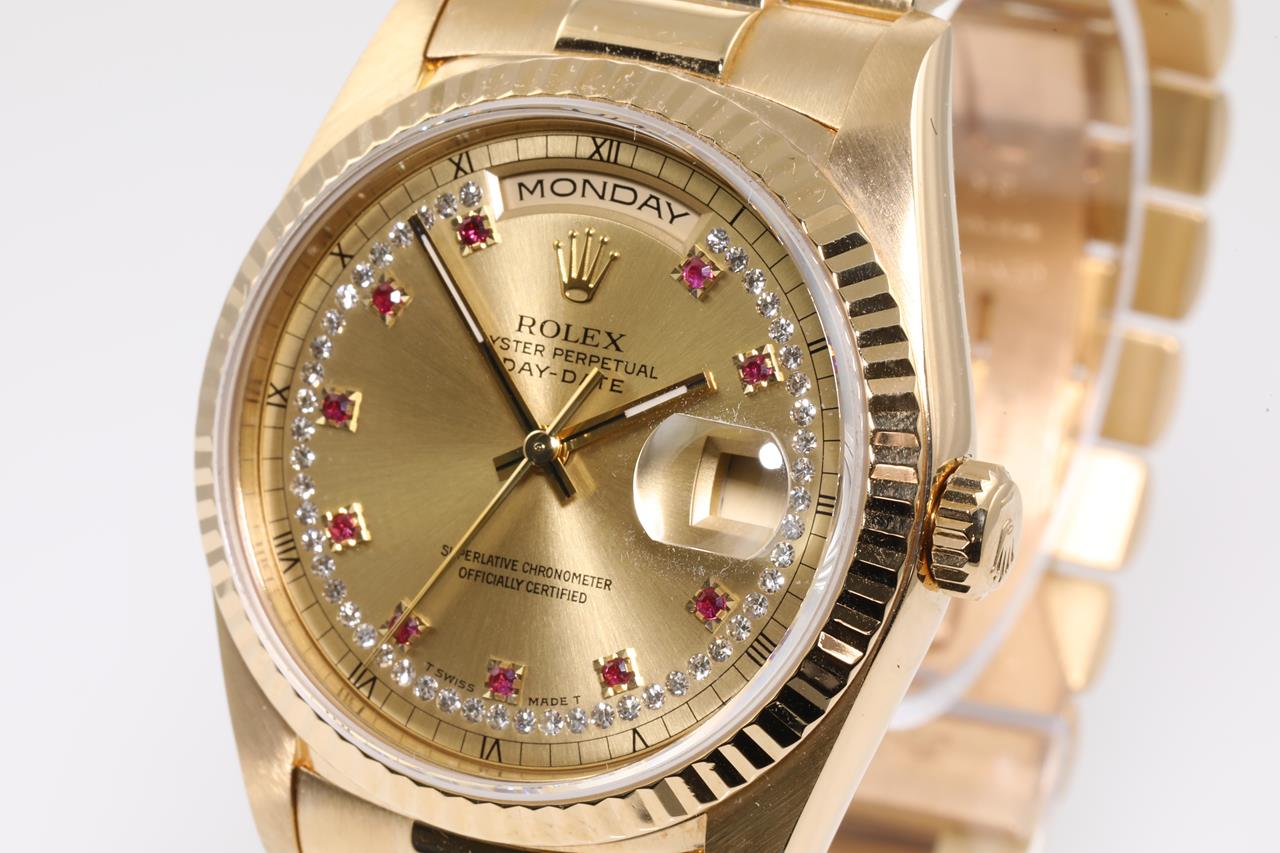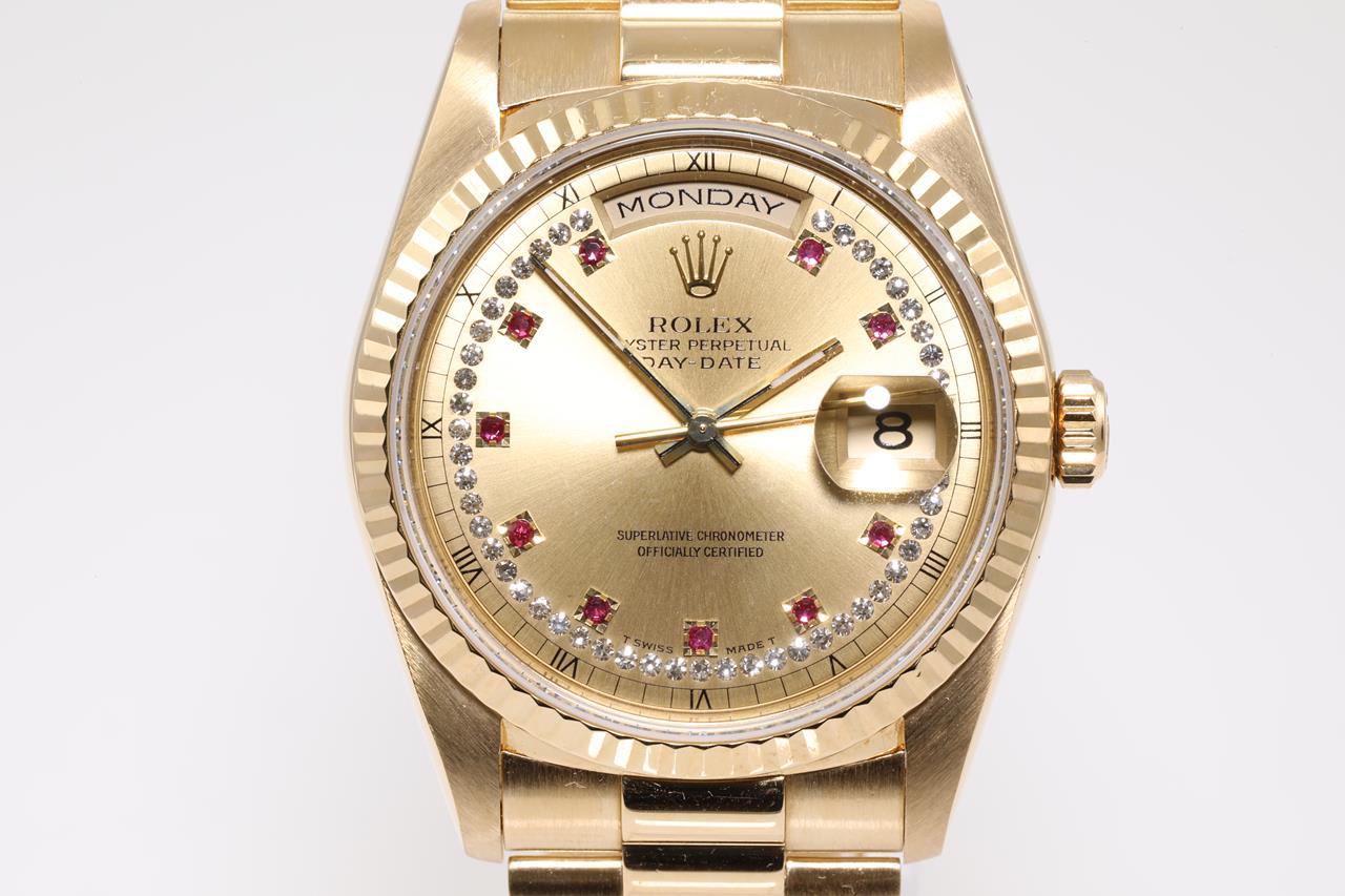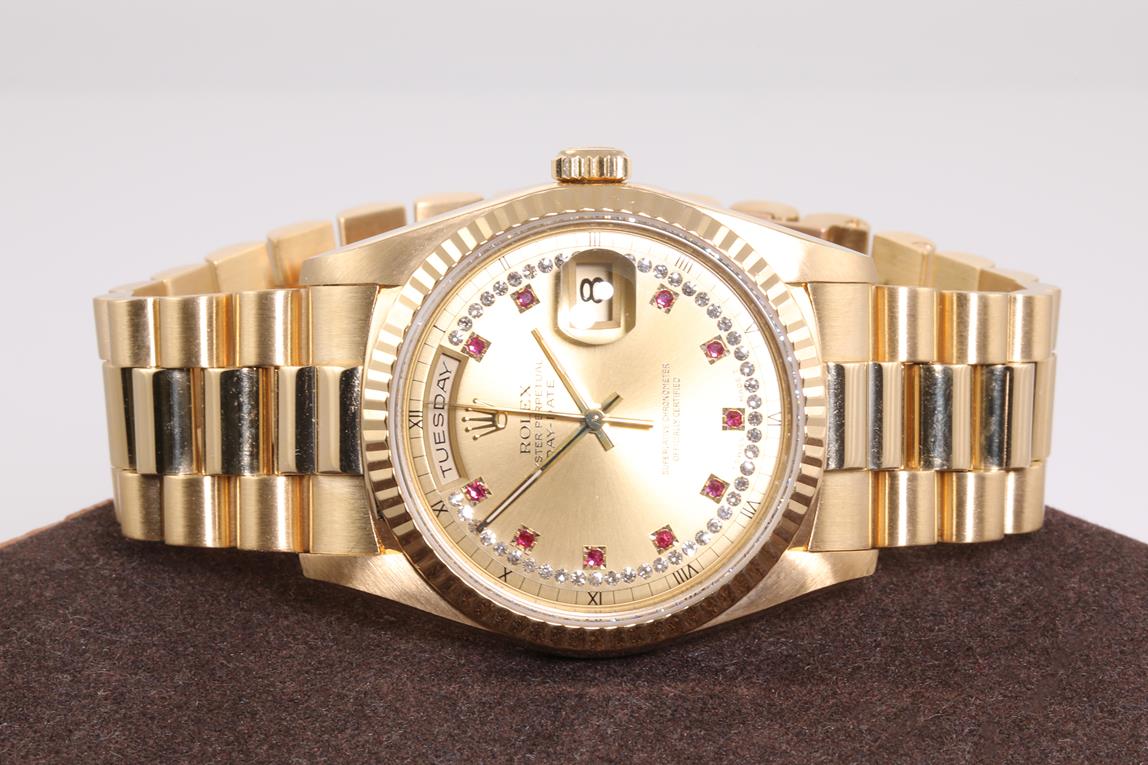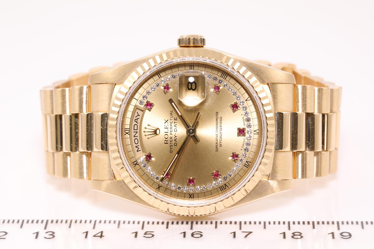 Rolex Oyster Perpetual Day-Date 18ct yellow gold automatic mens watch. Gold Diamond, Ruby indicators, with Diamonds on dial, day & date, case diameter: 36mm, wrist size: 17cm, Swiss made. Ref# 18238LR, Circa: 1990. With Rolex 18ct yellow gold Presidential bracelet and clasp. With certificate of authenticity and Rolex box. 3 month FSA warranty. (Pre-owned)