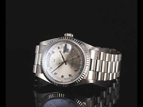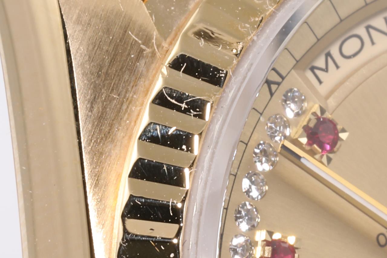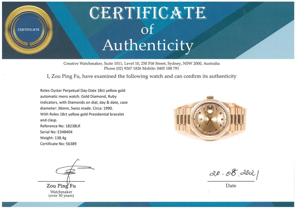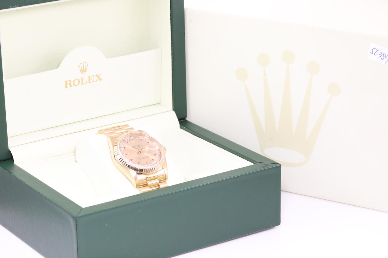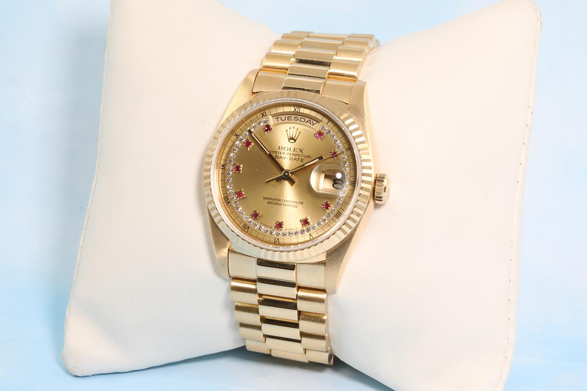 Rolex Oyster Perpetual Day-Date 18ct yellow gold automatic mens watch. Gold Diamond, Ruby indicators, with Diamonds on dial, day & date, case diameter: 36mm, wrist size: 17cm, Swiss made. Ref# 18238LR, Circa: 1990. With Rolex 18ct yellow gold Presidential bracelet and clasp. With certificate of authenticity and Rolex box. 3 month FSA warranty. (Pre-owned)