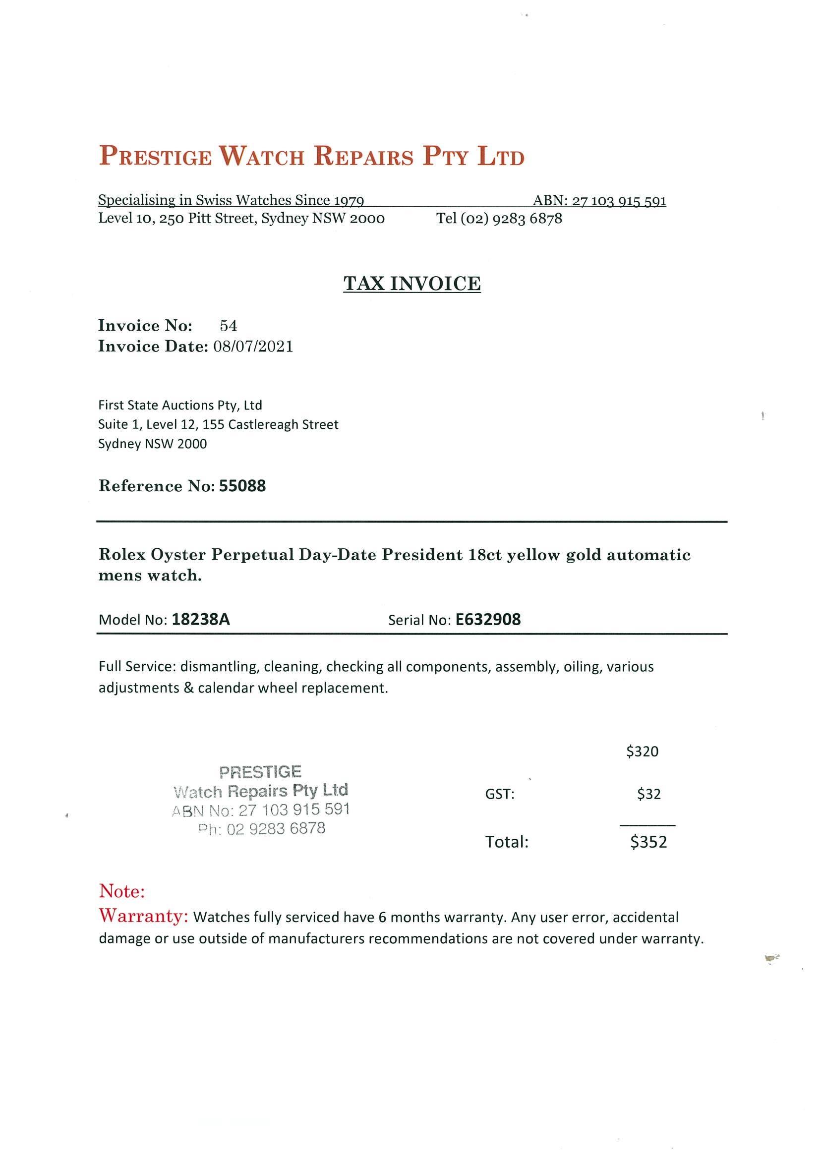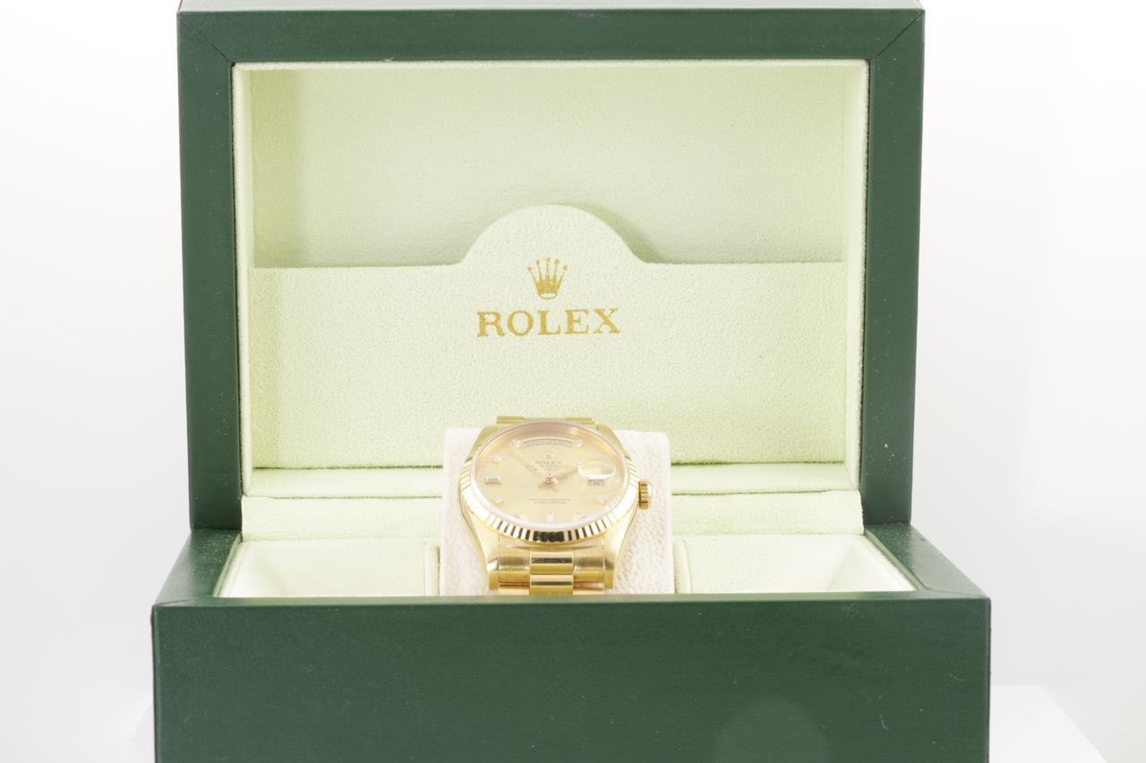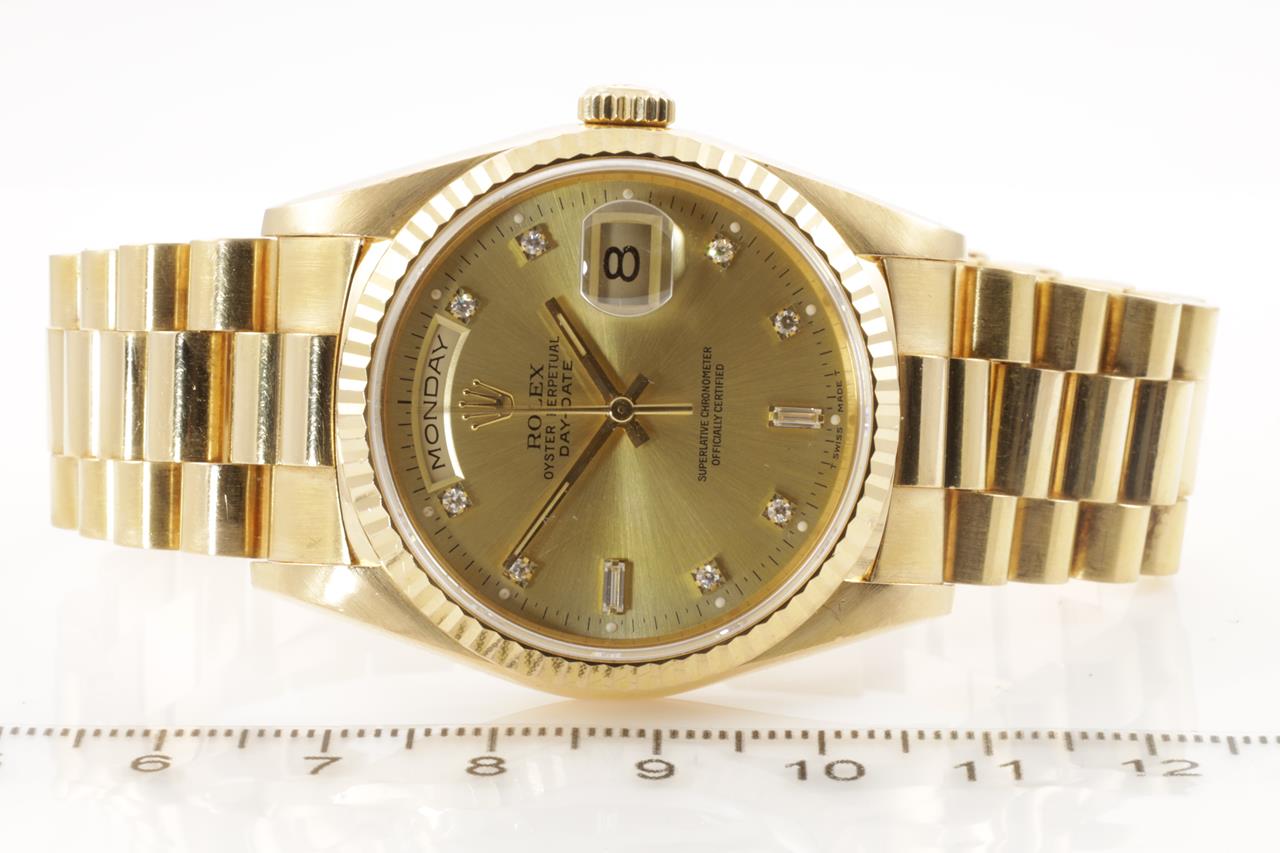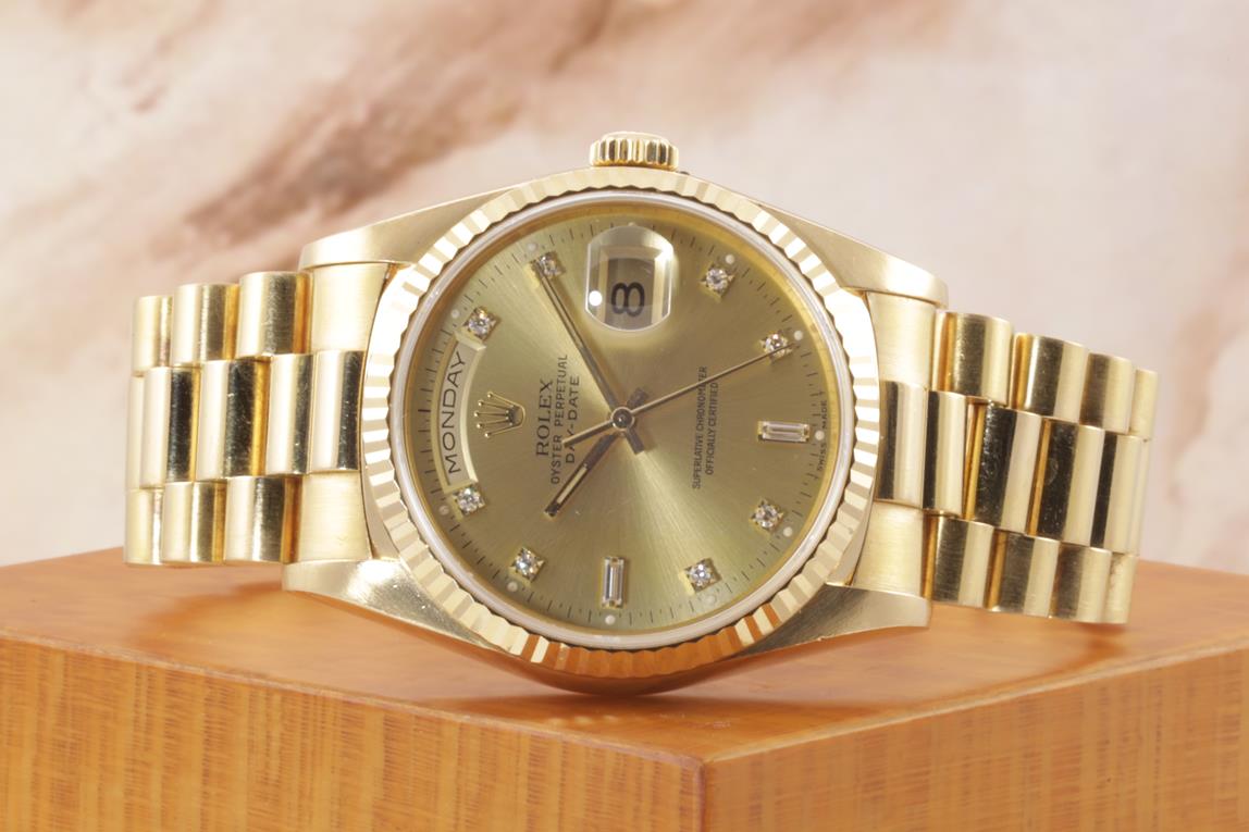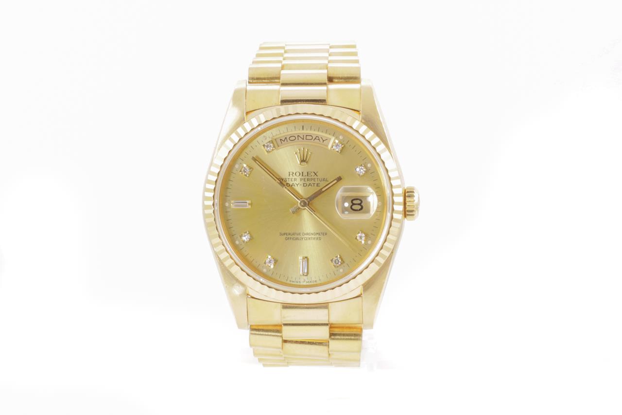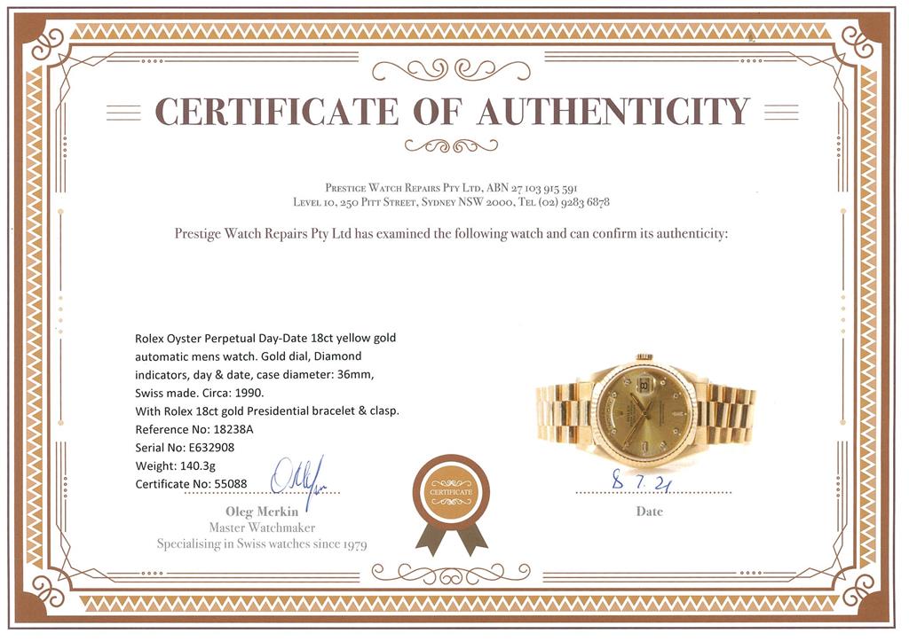 Rolex Oyster Perpetual Day-Date 18ct yellow gold automatic mens watch. Gold dial, Diamond indicators, day & date, case diameter: 36mm, wrist size: 16.5cm, Swiss made. Ref# 18238A, Circa: 1990. With Rolex 18ct gold Presidential bracelet & clasp. With Certificate of Authenticity and Rolex box. 6 month watchmaker warranty from the date of full service. (Pre-owned)