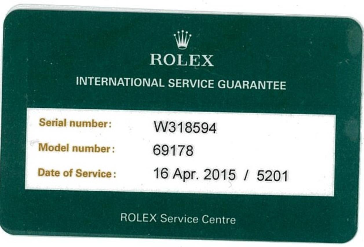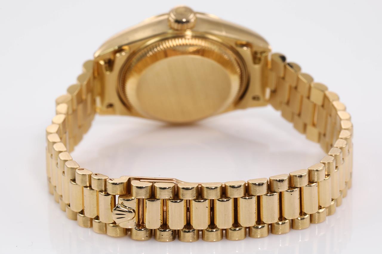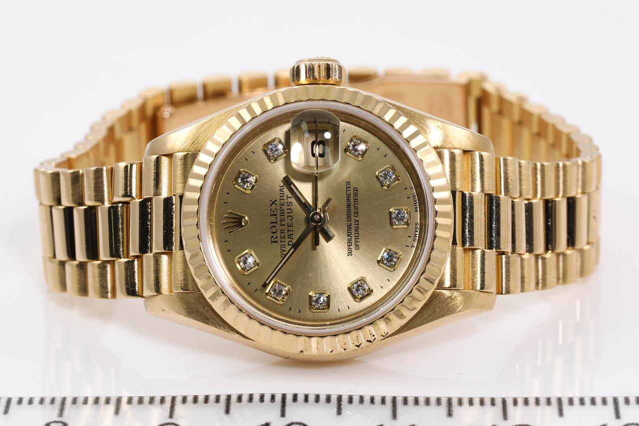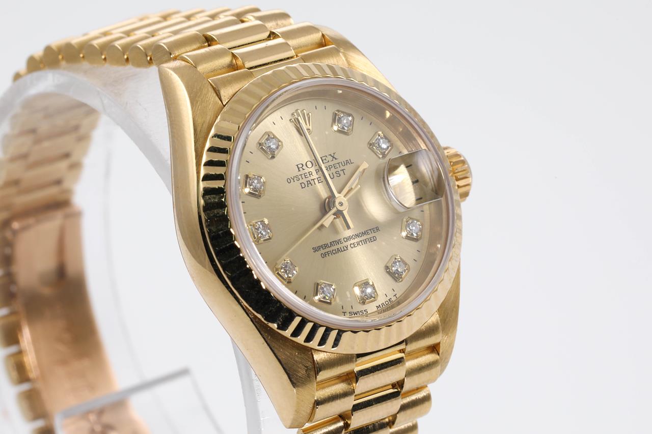Rolex Oyster Perpetual Datejust 18ct yellow gold automatic ladies watch. Gold dial, Diamond indicators, date, case diameter 26mm, wrist size: 15cm, Swiss made. Ref# 69178G, Circa: 1995. With Rolex 18ct yellow gold Presidential bracelet and clasp. With certificate of authenticity, Rolex international service guarantee card & copy of full service receipt dated 16/04/2015 and Rolex pouch. 3 month FSA warranty. (Pre-owned)