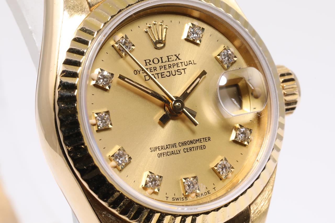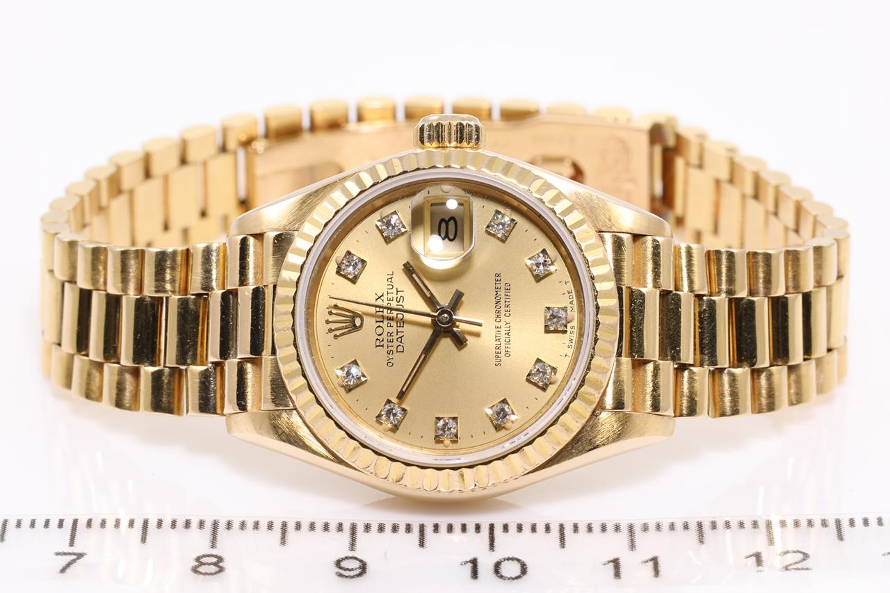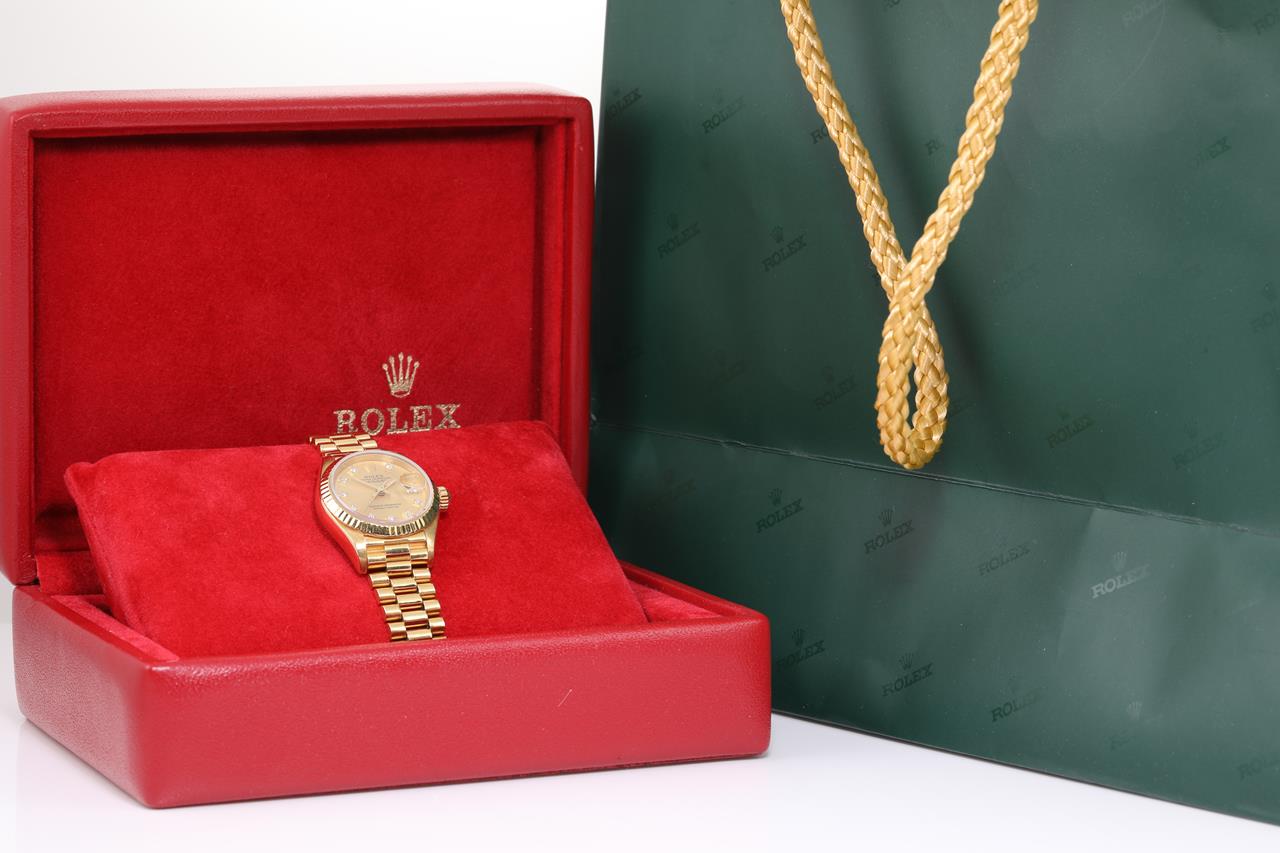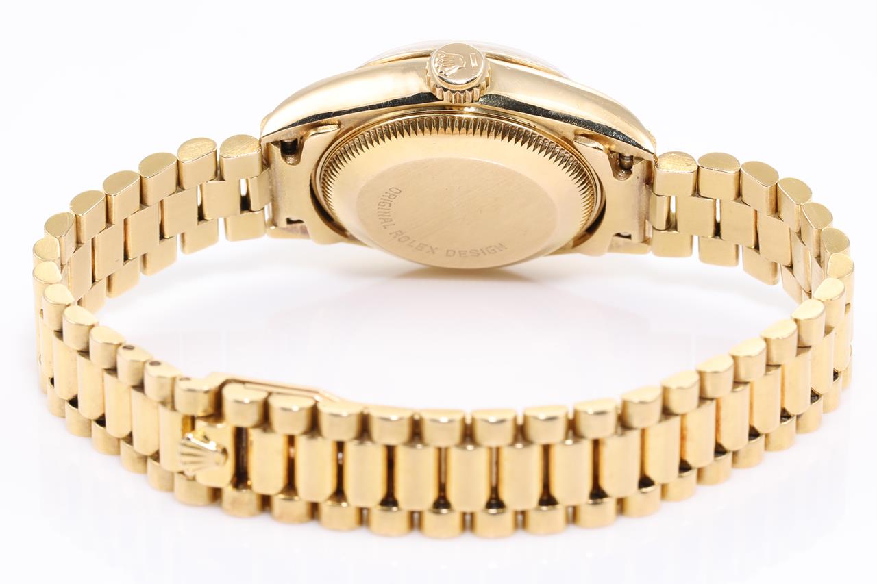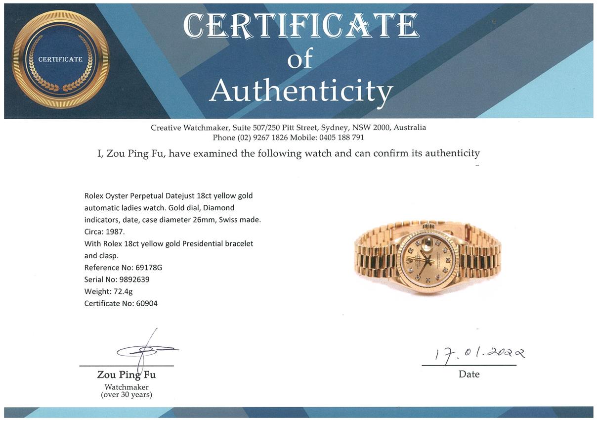 Rolex Oyster Perpetual Datejust 18ct yellow gold automatic ladies watch. Gold dial, Diamond indicators, date, case diameter 26mm, wrist size: 16cm, Swiss made. Ref# 69178G, Circa: 1987. With Rolex 18ct yellow gold Presidential bracelet and clasp. With Certificate of Authenticity and Rolex box with Rolex gift bag. 3 month FSA warranty. (Pre-owned)