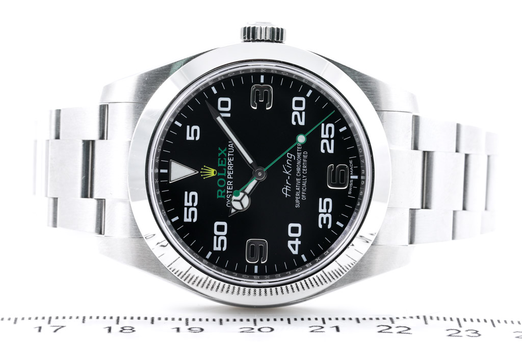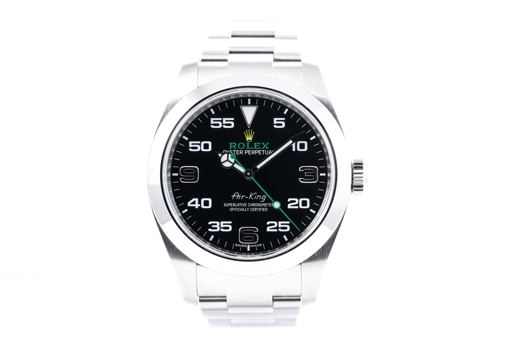 Rolex Oyster Perpetual Air King stainless steel automatic men's watch. Black dial, case diameter: 40mm, wrist size: 18cm, Swiss made. Ref# 116900. Circa: 2011-2022. With Rolex stainless steel Oyster bracelet and clasp. With Certificate of Authenticity and Rolex box. 3 month FSA warranty. (Pre-owned)