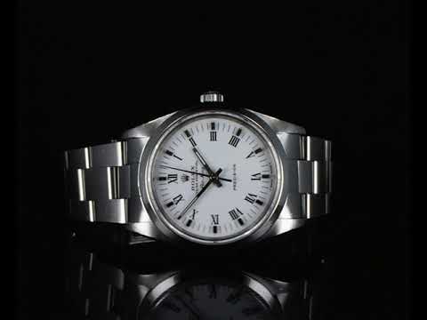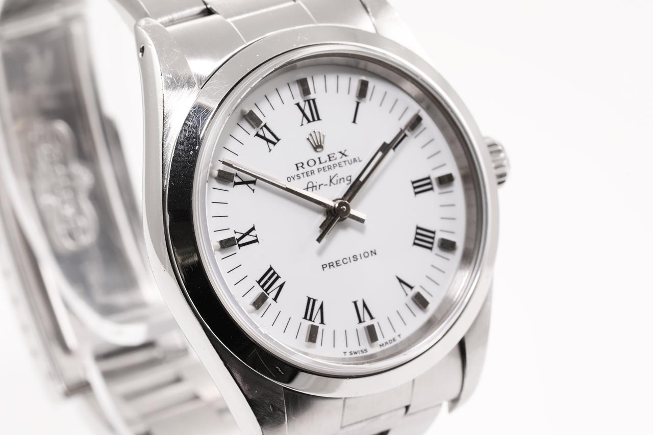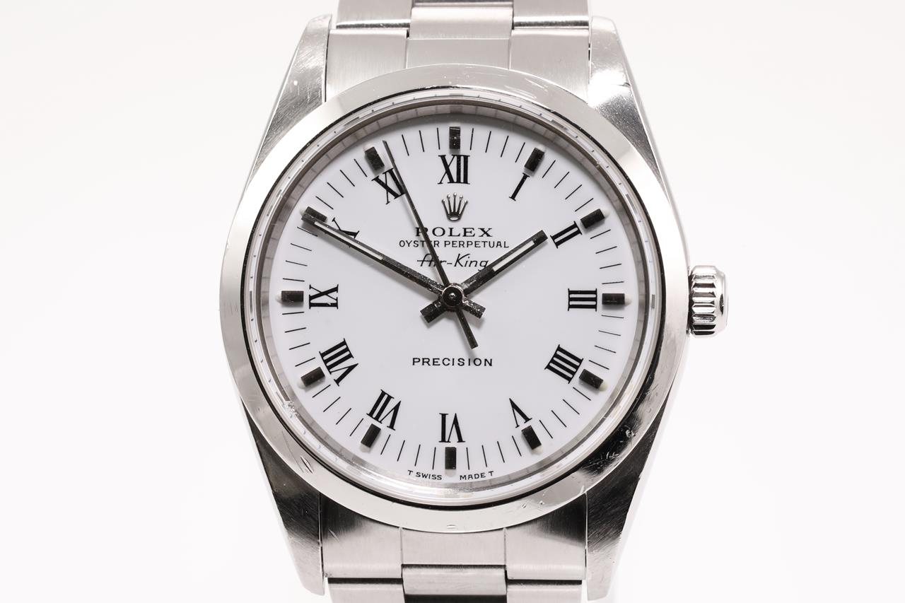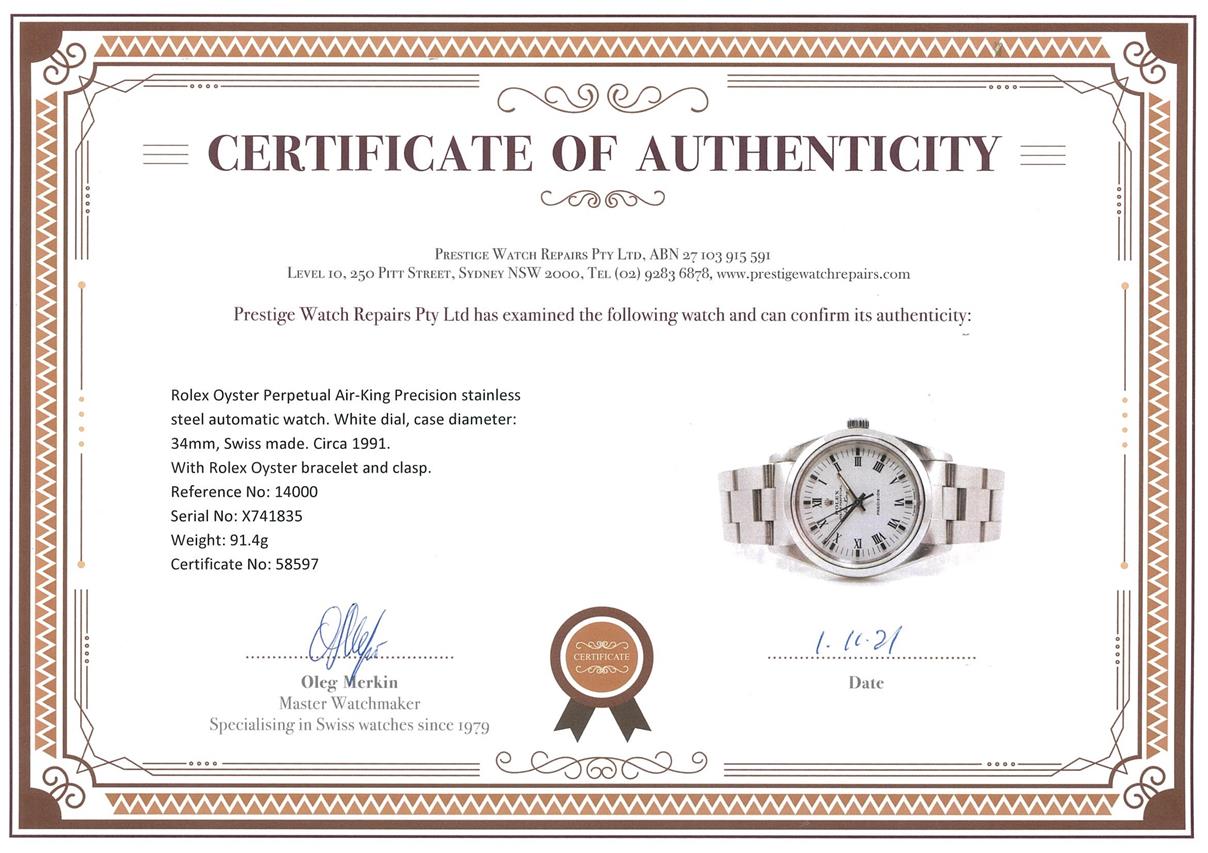 Rolex Oyster Perpetual Air-King Precision stainless steel automatic watch. White dial, case diameter: 34mm, wrist size: 17cm, Swiss made. Ref# 14000, Circa 1991. With Rolex Oyster bracelet and clasp. With Certificate of Authenticity and Rolex box. 6 month Prestige watchmaker warranty from the date of full service. (Pre-owned)