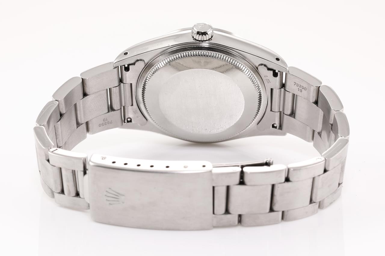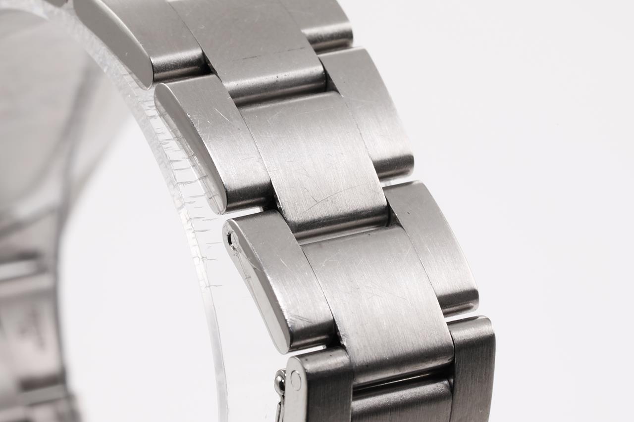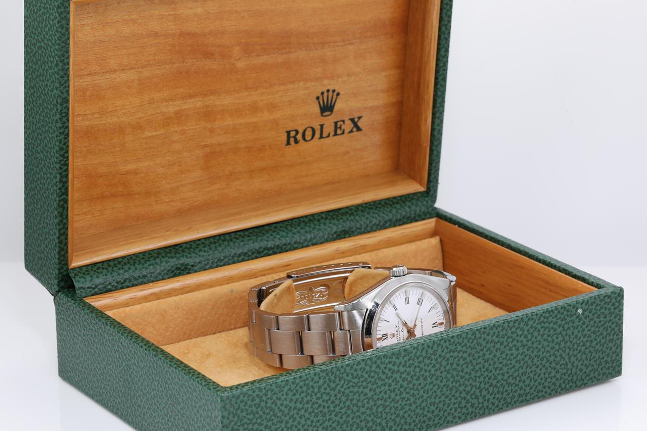 Rolex Oyster Perpetual Air-King Precision stainless steel automatic watch. White dial, case diameter: 34mm, wrist size: 17cm, Swiss made. Ref# 14000, Circa 1991. With Rolex Oyster bracelet and clasp. With Certificate of Authenticity and Rolex box. 6 month Prestige watchmaker warranty from the date of full service. (Pre-owned)