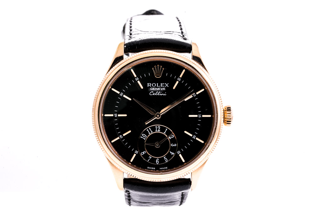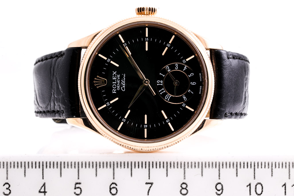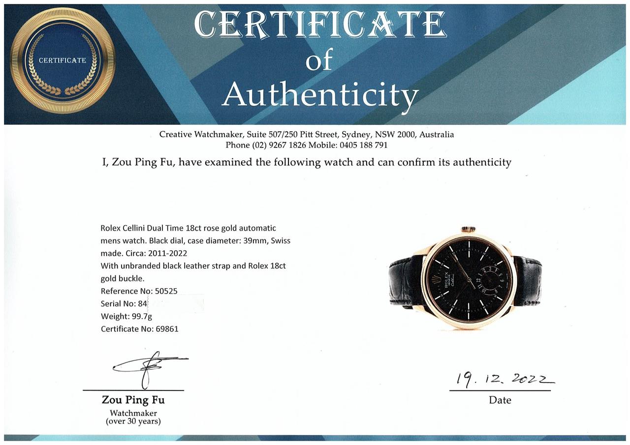Rolex Cellini Dual Time 18ct rose gold automatic mens watch. Black dial, case diameter: 39mm, strap length: 19cm, Swiss made. Ref# 50525, Circa: 2011-2022. With unbranded black leather strap and Rolex 18ct gold buckle. With Certificate of Authenticity. 3 month FSA warranty (Pre-owned)