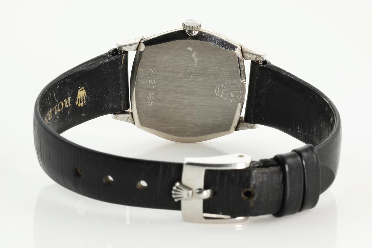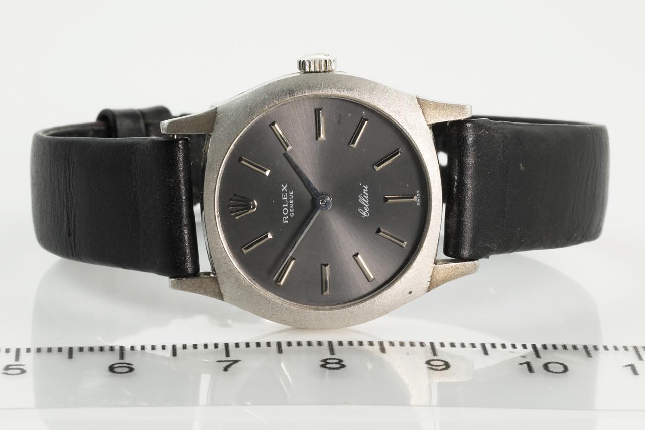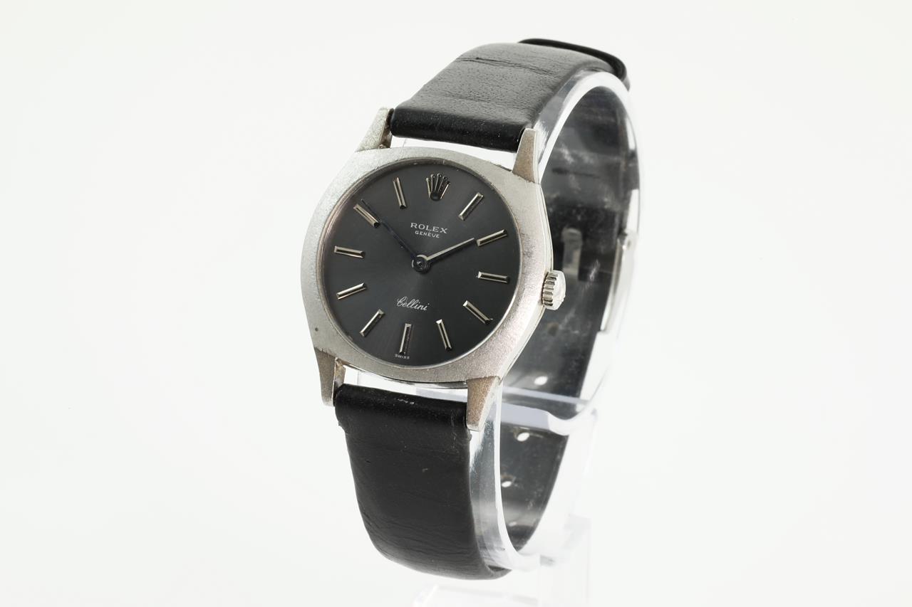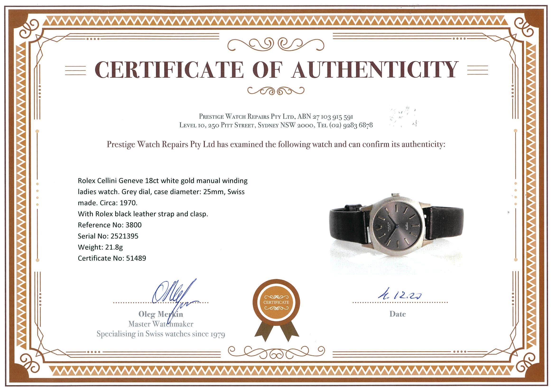 Rolex Cellini Geneve 18ct white gold manual winding ladies watch. Grey dial, case diameter: 25mm, Length: 17cm, Swiss made. Ref #3800, Circa: 1970. With Rolex black leather worn strap and clasp. With certificate of authenticity. (Pre-owned)