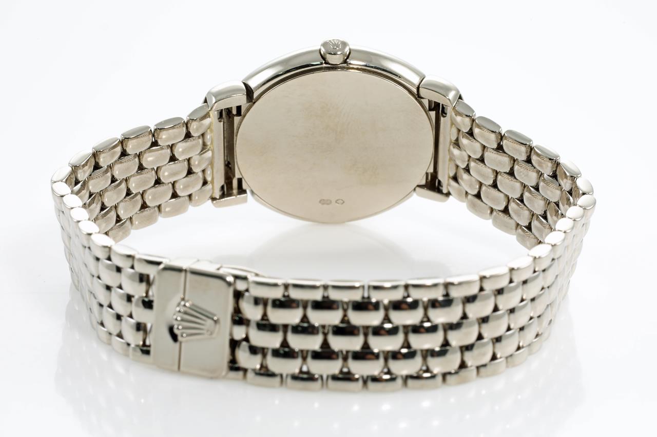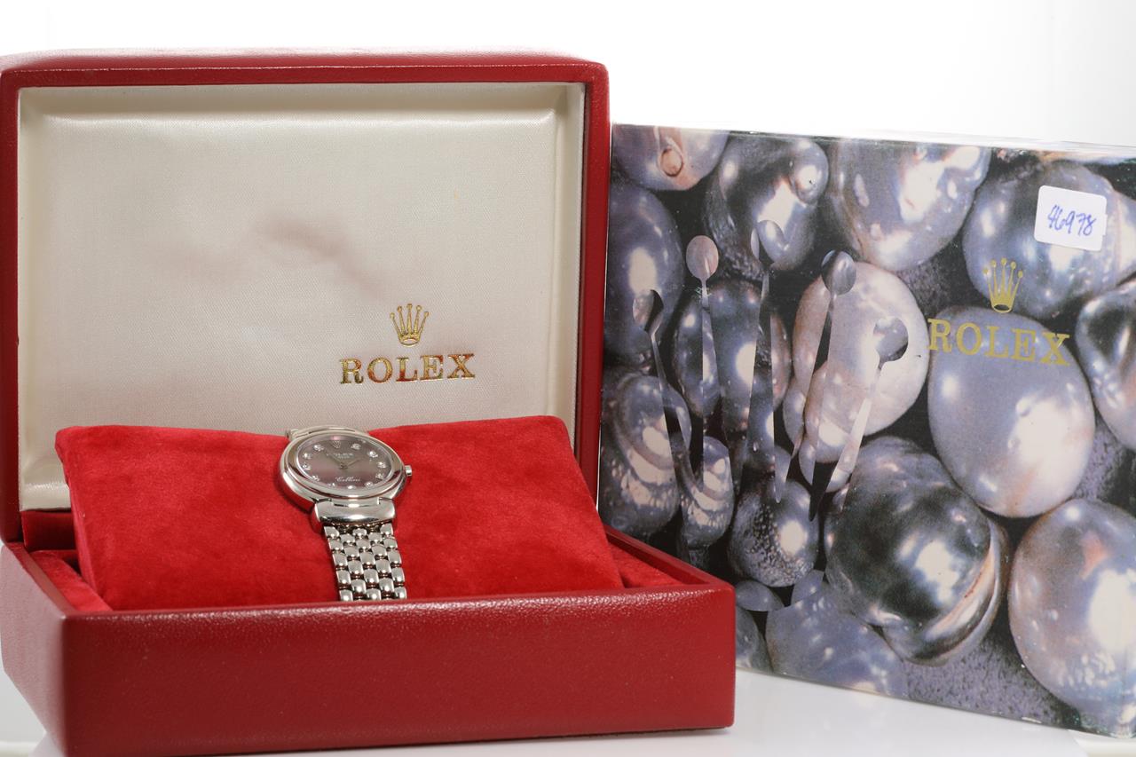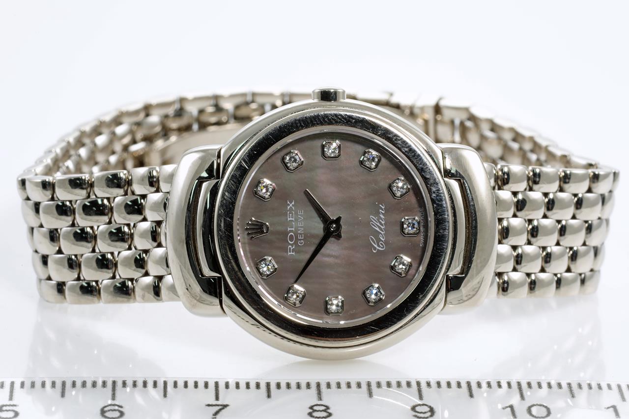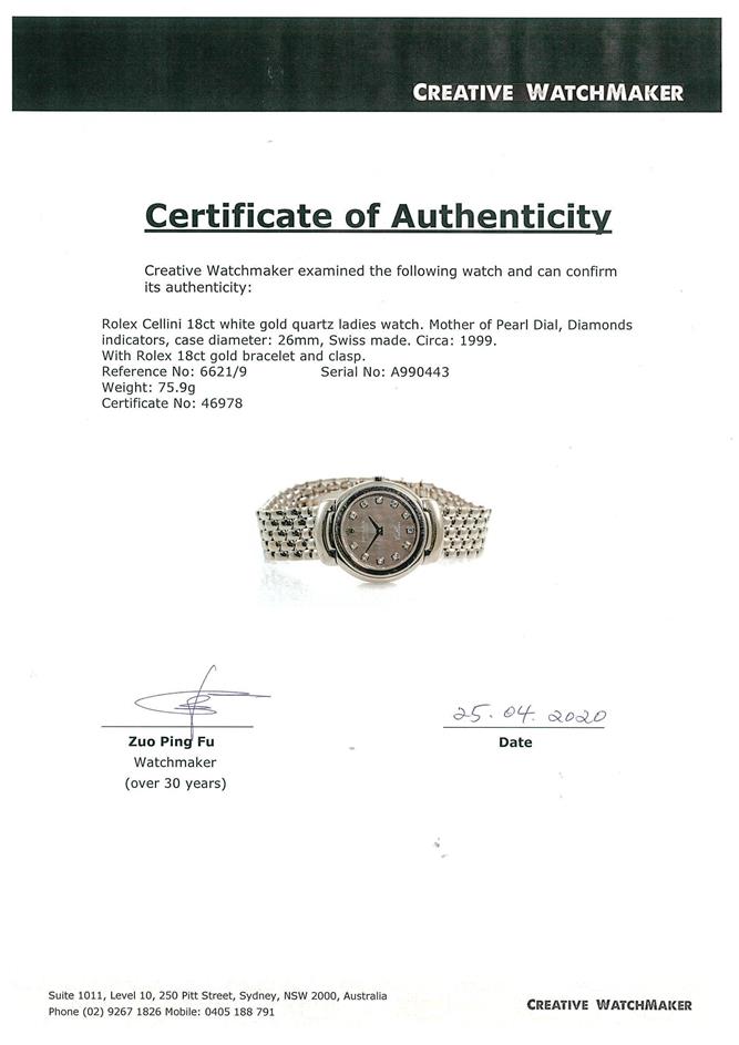 Rolex Cellini 18ct white gold quartz ladies watch. Mother of Pearl Dial, Diamonds indicators, case diameter: 26mm, wrist size: 16cm, swiss made. Note: scratches on back case. Ref# 6621/9, Circa: 1999. With Rolex 18ct gold bracelet and clasp. With certificate of authenticity. With Rolex international service card inside Rolex box. 3 month FSA warranty. (Pre-owned)