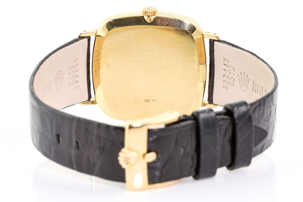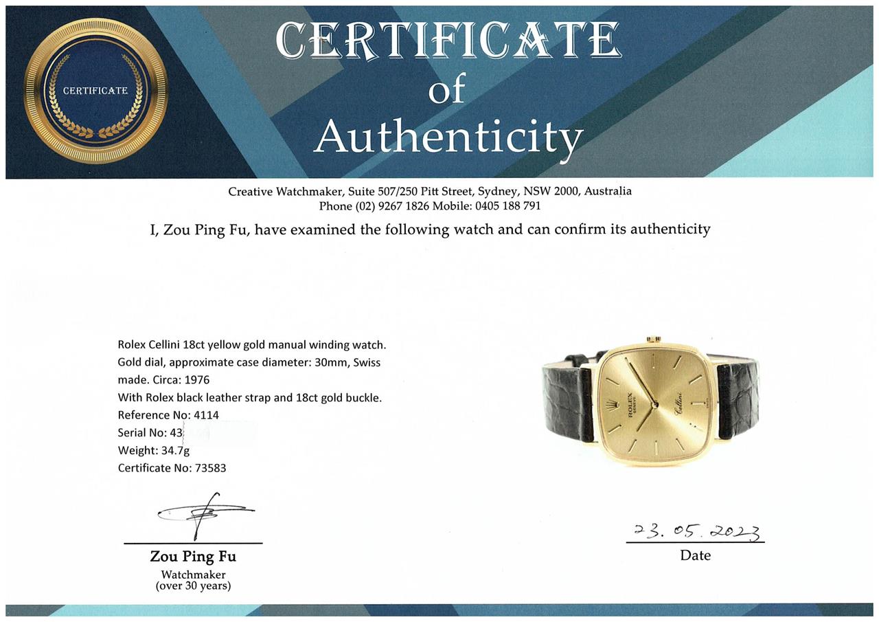 Rolex Cellini 18ct yellow gold manual winding watch. Gold dial, approximate case diameter: 30mm, strap length: 19cm, Swiss made. Ref# 4114. Circa: 1976. With Rolex black leather strap and 18ct gold buckle. With spare unbranded red leather strap and buckle. With Certifificate of Authenticity, Rolex International Warranty card dated 11/18/2020 and Rolex case & pouch. 3 month FSA warranty. (Pre-owned)
