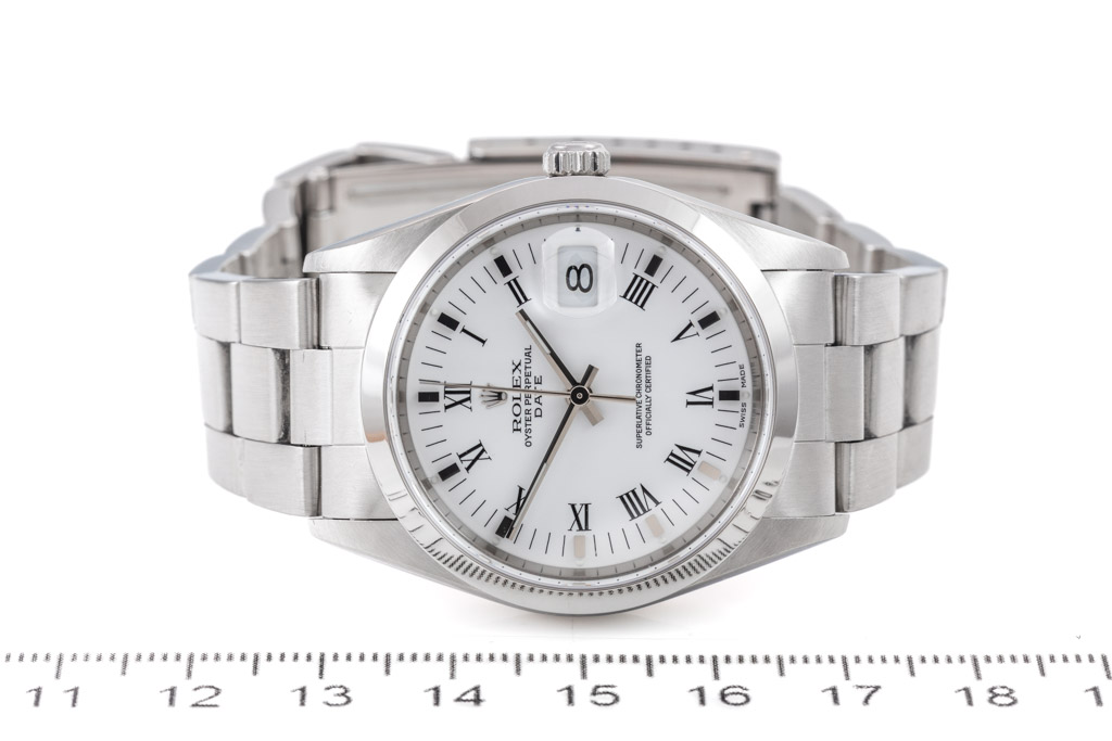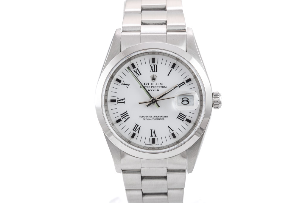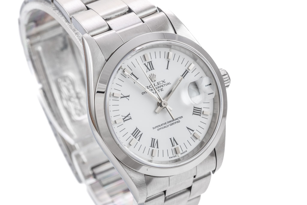 Rolex Oyster Perpetual Date stainless steel automatic watch. White dial, date, case diameter: 34mm, wrist size: 17.5cm Swiss made. Model# 15200, Circa 1997. With Rolex stainless steel Oyster bracelet & clasp. With certificate of authenticity and Rolex box. 3 month warranty. (Pre-owned)